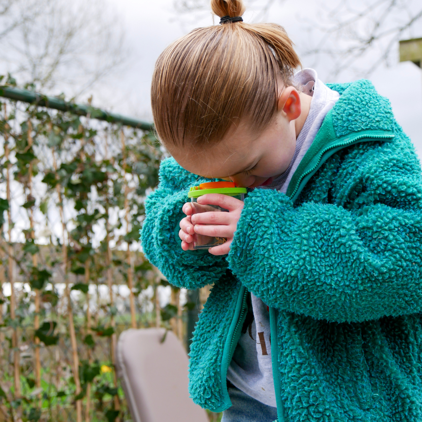De bekerloep is voorzien van een praktische deksel, die eenvoudig vastklikt en los kan worden getrokken om de beker te openen. In de groene deksel zit een vergroting, maar ze kunnen nog dichterbij bekeken worden, dan komt het oranje vergrootglas goed van pas.