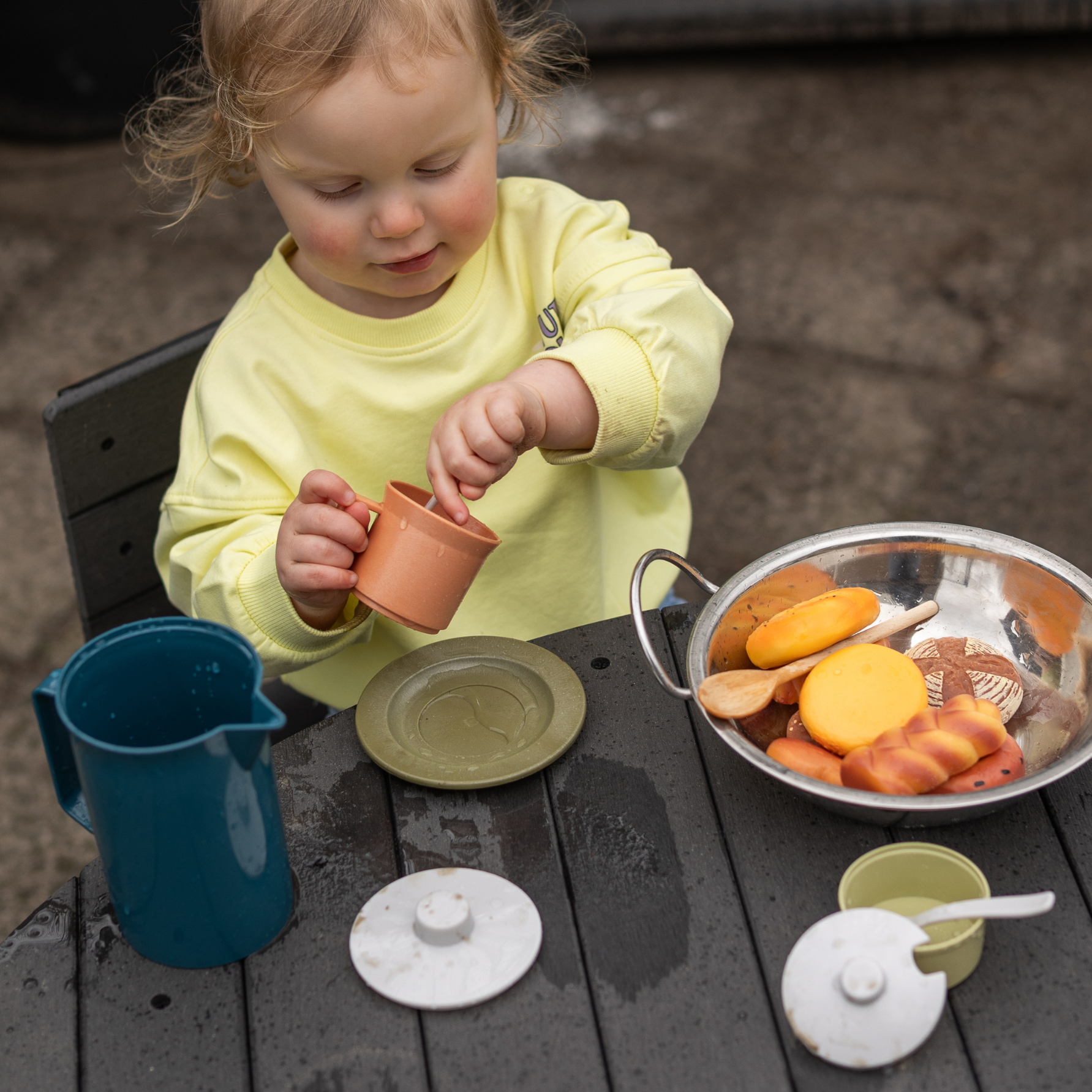 Deze BIO theeset bestaat uit 11 delen en is gemaakt van duurzaam bioplastiek, afgeleid van suikerriet. De set bevat een elegante lichtblauwe theepot, beige kopjes met bijpassende schotels en lepels – allemaal perfect afgestemd op kleine kinderhandjes.