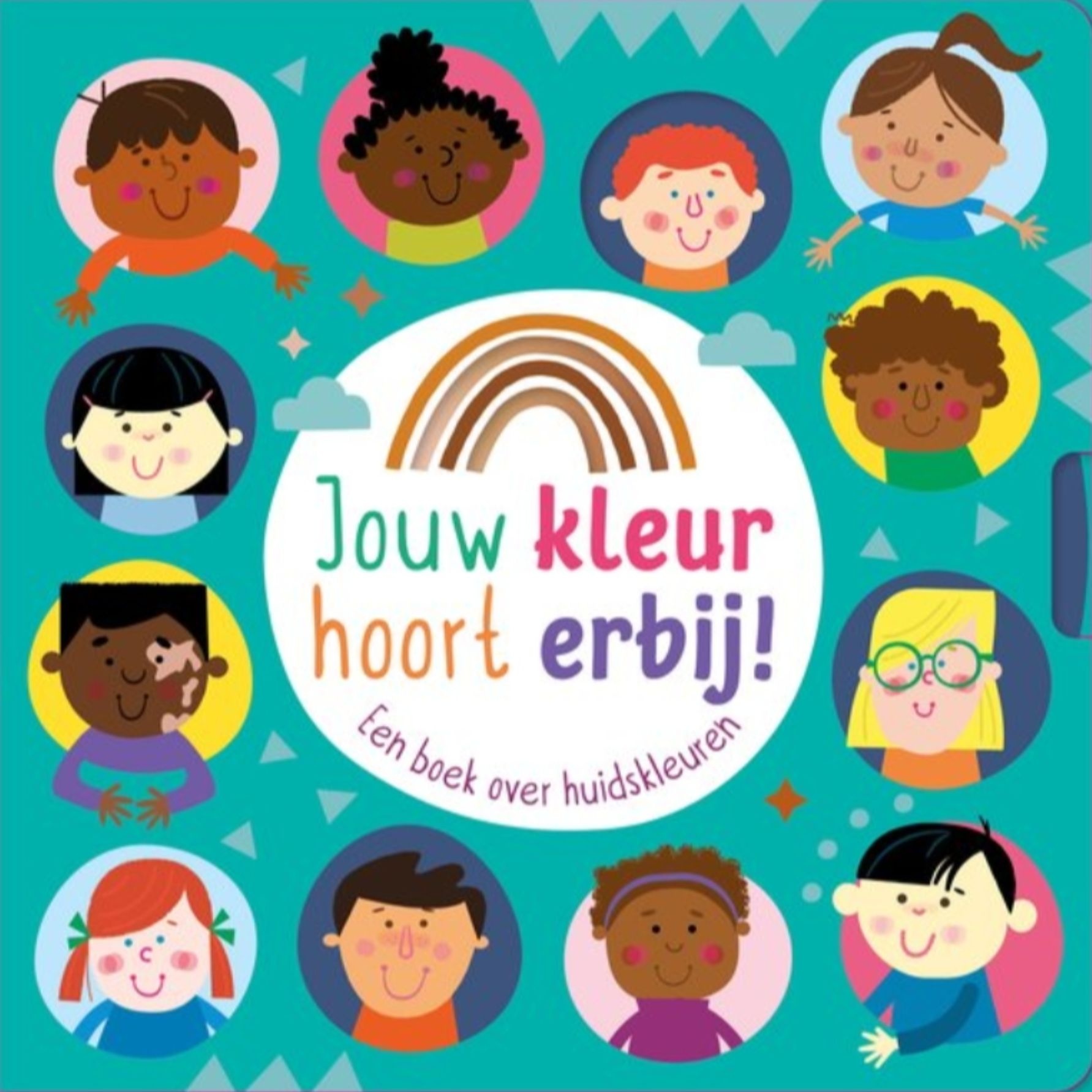 Stevig kartonboek met draaischijf en een regenboog van huidskleuren. Houd je hand achter het open vakje in de regenboog, en je ziet: ook jouw kleur hoort erbij!