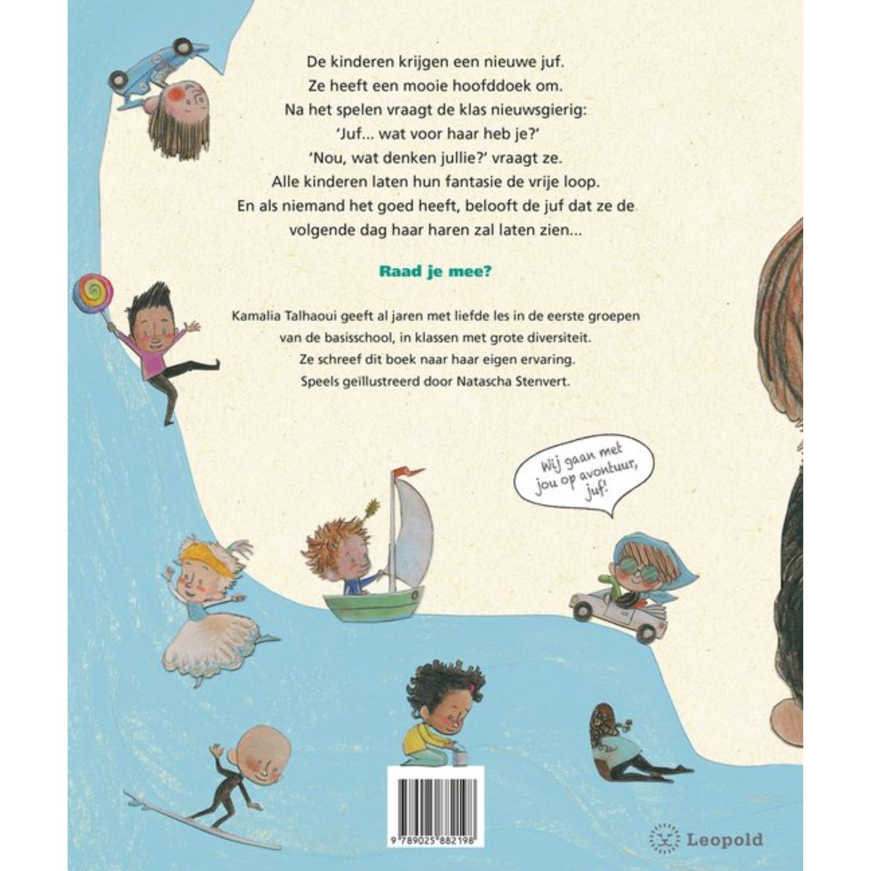 De kinderen krijgen een nieuwe juf. Ze heeft een mooie hoofddoek om. Na het spelen vraagt de klas nieuwsgierig: ‘Juf... wat voor haar heb je?’ ‘Nou, wat denken jullie?’ vraagt ze. Alle kinderen laten hun fantasie de vrije loop. En als niemand het goed heeft, belooft de juf dat ze de volgende dag haar haren zal laten zien...