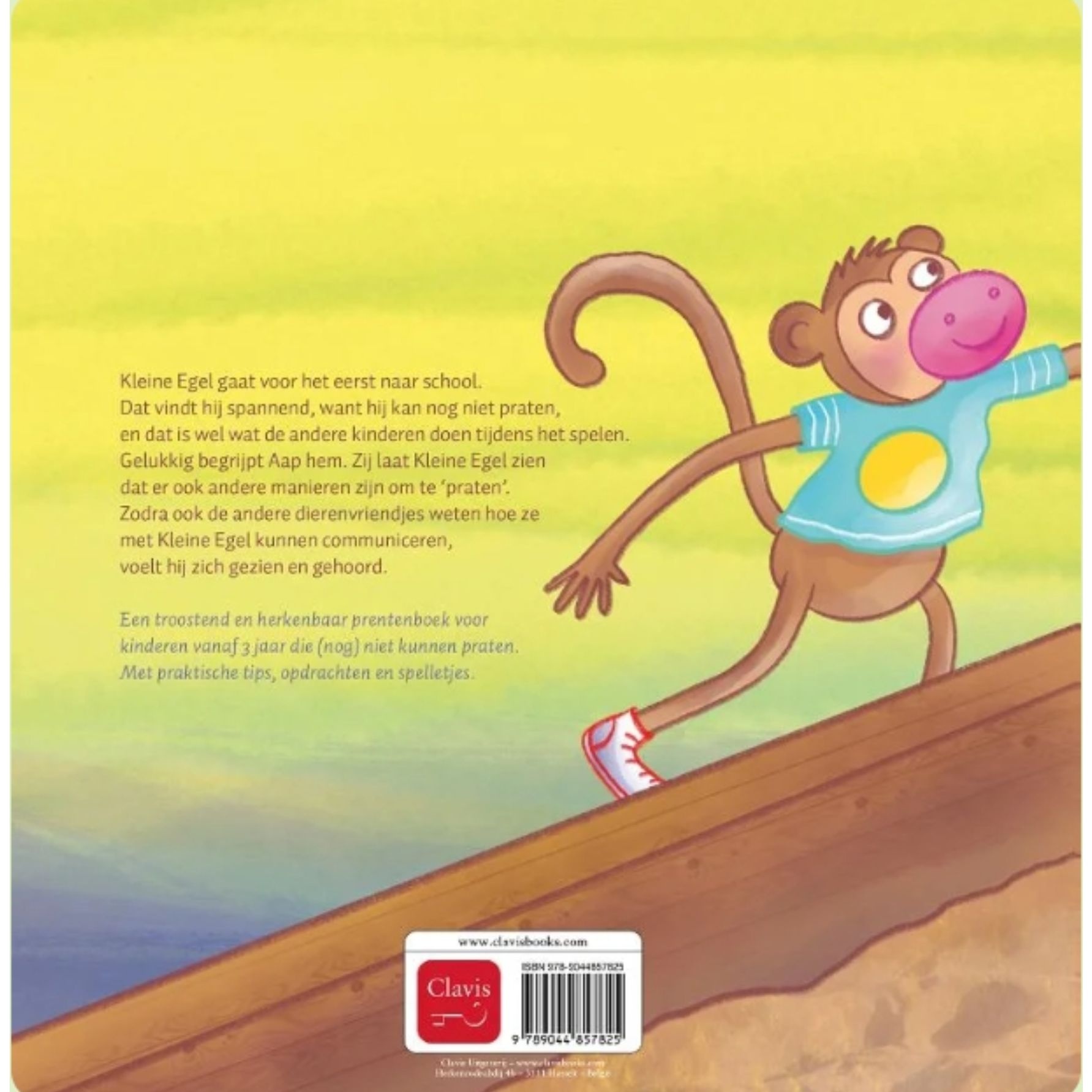 Kleine Egel gaat voor het eerst naar school. Dat vindt hij spannend, want hij kan nog niet praten, en dat is wel wat de andere kinderen doen tijdens het spelen. Gelukkig begrijpt Aap hem. Zij laat Kleine Egel zien dat er ook andere manieren zijn om te ‘praten’. Zodra ook de andere dierenvriendjes weten hoe ze met Kleine Egel kunnen communiceren, voelt hij zich gezien en gehoord. Een troostend en herkenbaar prentenboek voor kinderen vanaf 3 jaar die (nog) niet kunnen praten. Met praktische tips, opdrachten en spelletjes.