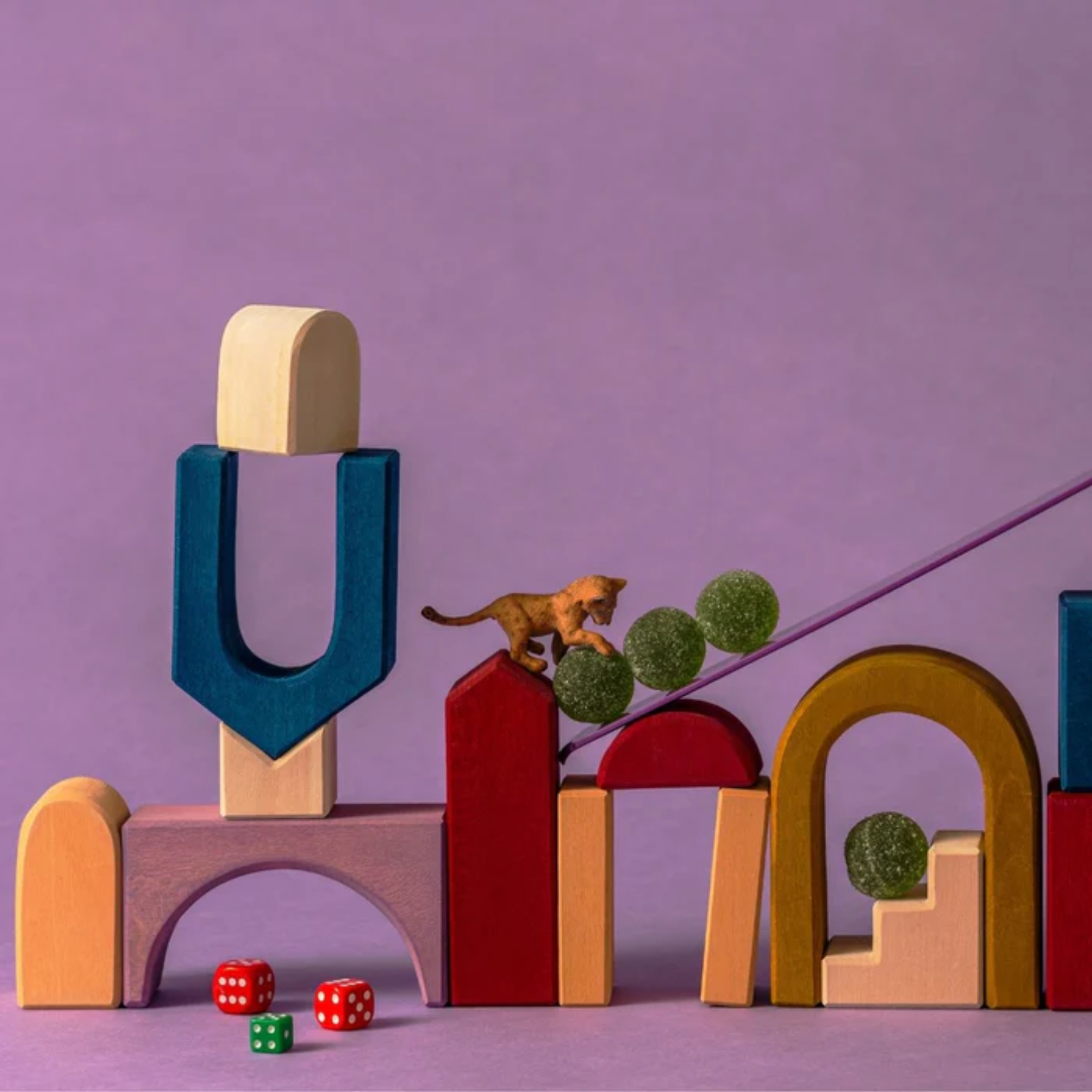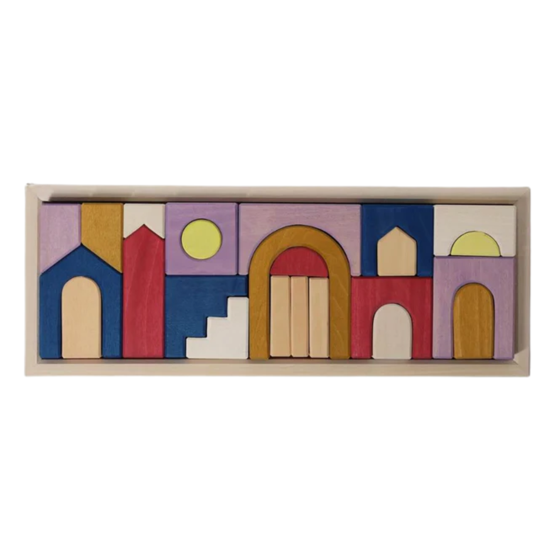 Een kleurrijke houten bouwset die kinderen uitnodigt tot vrij en creatief spel. De afgeronde vormen en verschillende kleuren stimuleren de fantasie, motorische ontwikkeling en het ruimtelijk inzicht.
