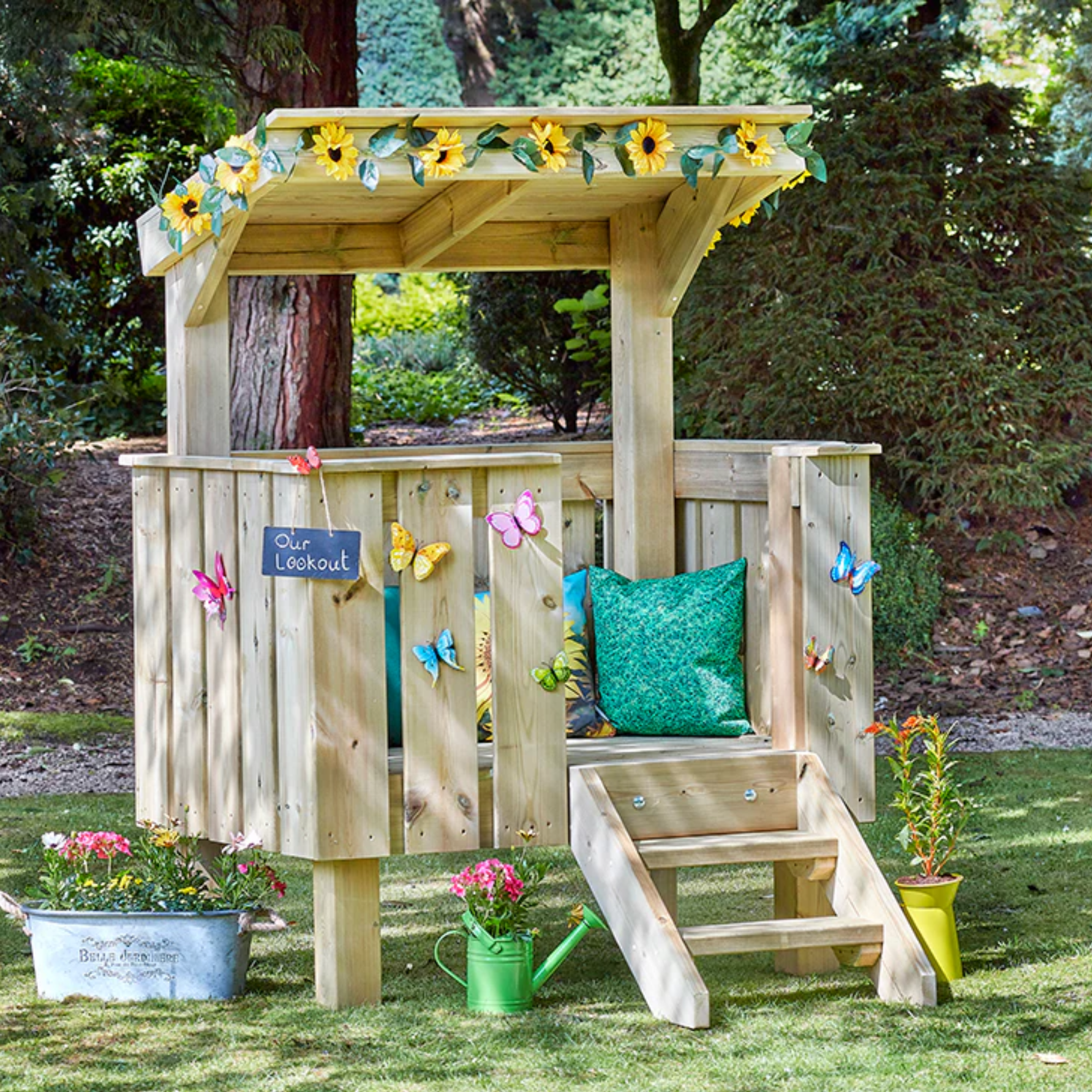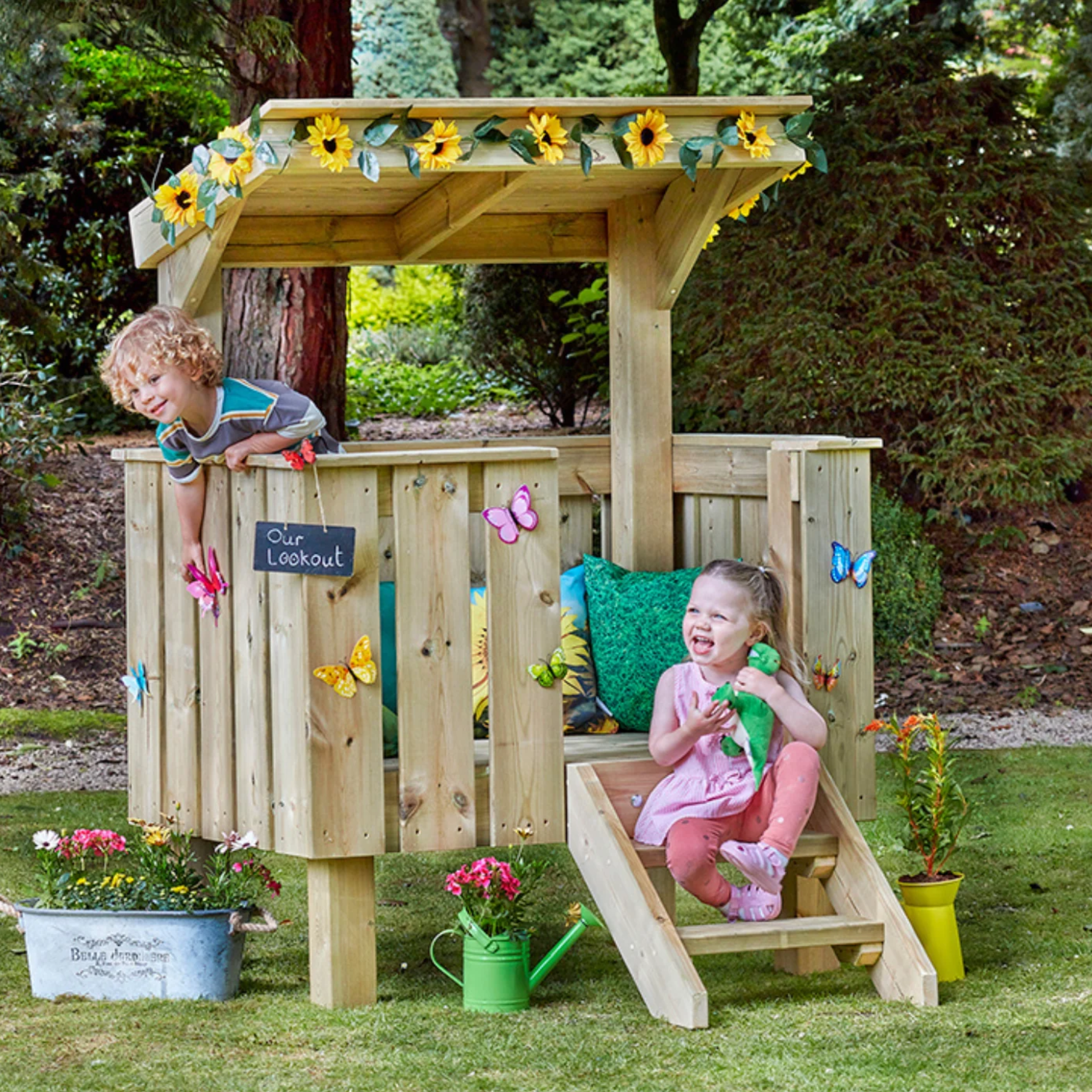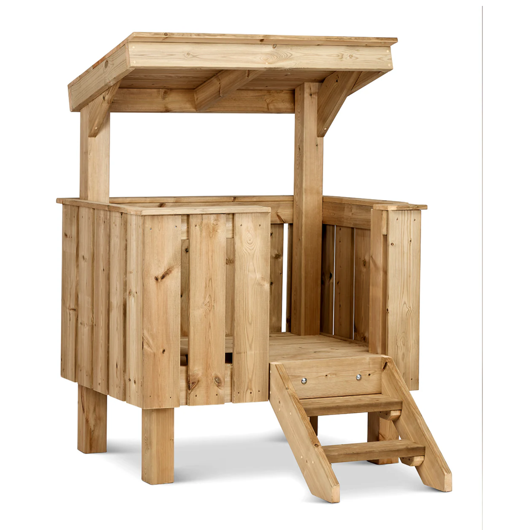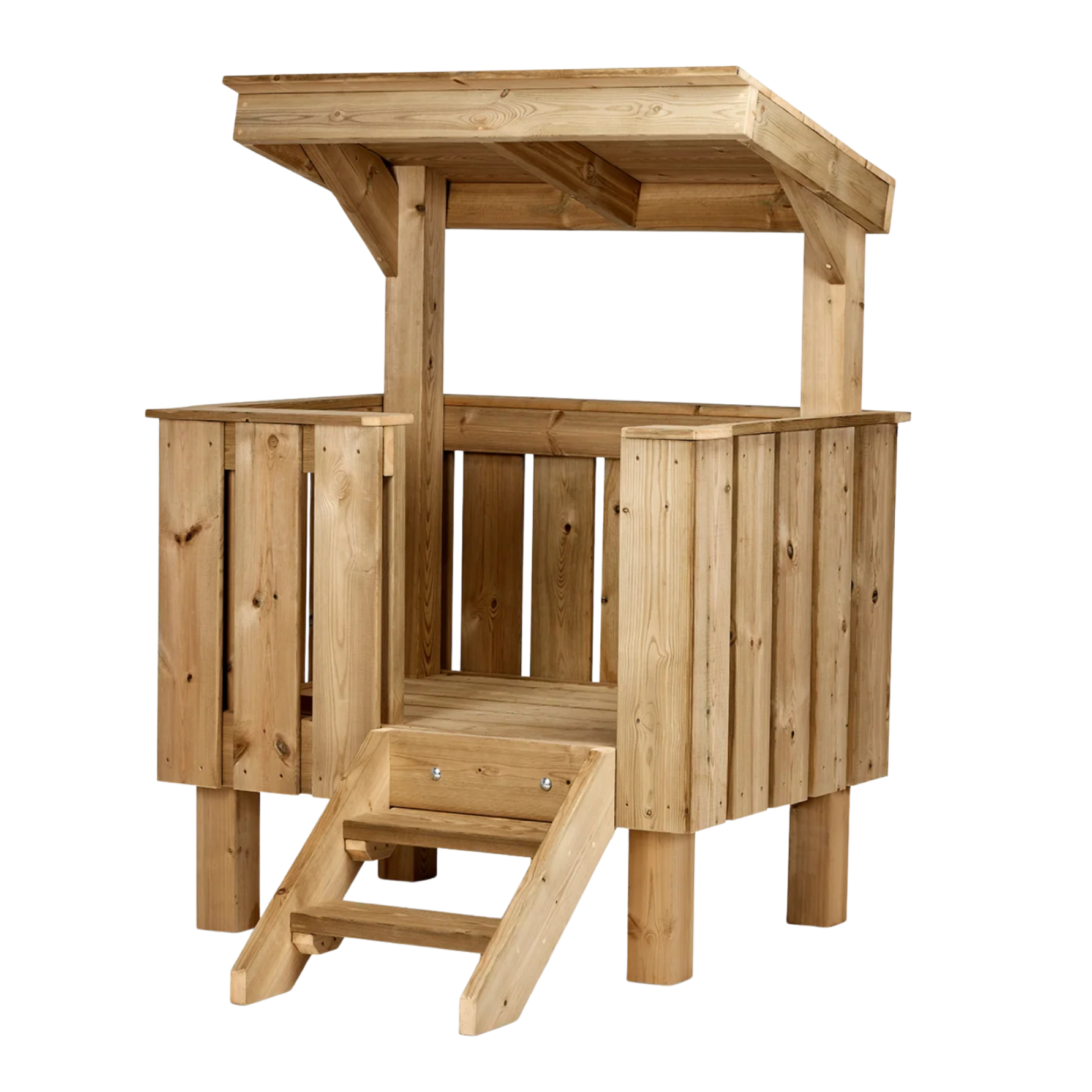 Dit compacte speelhuis nodigt kinderen uit tot fantasierijk en actief buitenspel. De verhoogde speelplek creëert een eigen plek binnen de buitenruimte van de kinderopvang waar kinderen spelend kunnen ontwikkelen.