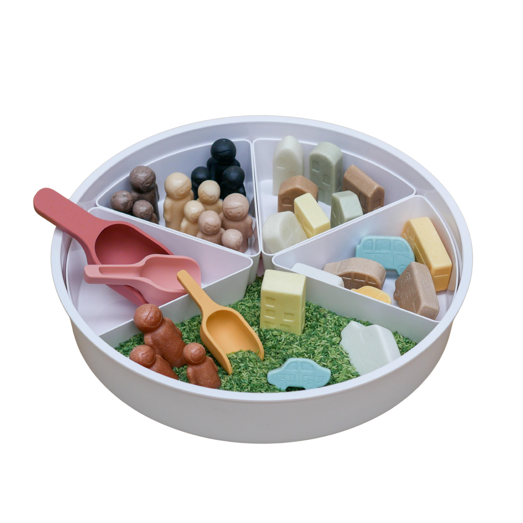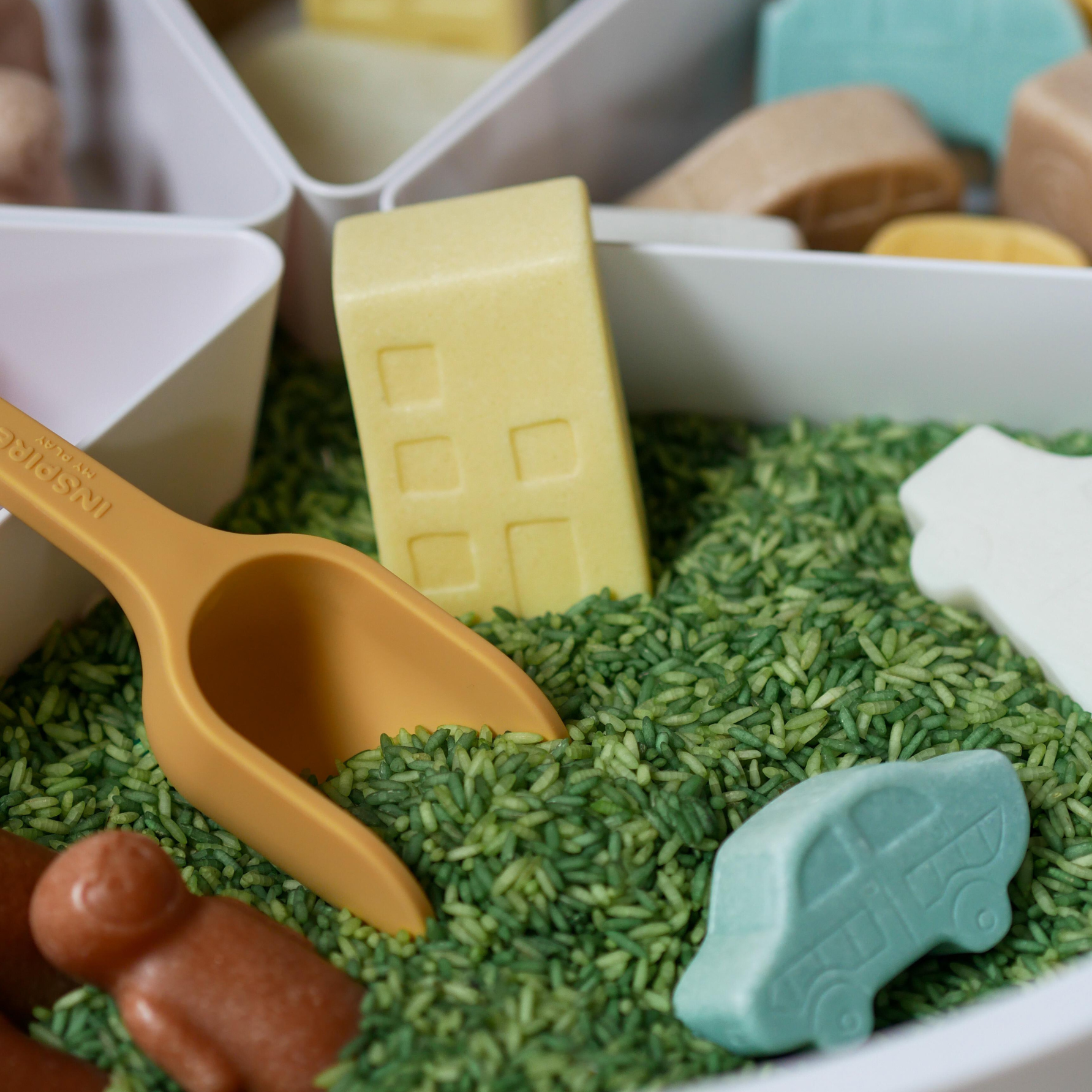 Met de Inspire My Play The Play Tray als basis creëren kinderen hun eigen speelwereld. De set bevat tactiele speelfiguren van families, auto’s en huisjes waarmee kinderen verhalen kunnen bedenken, rollenspel kunnen uitproberen en sociale situaties spelenderwijs verkennen. De groene speelrijst van Grennn voegt een sensorisch element toe, terwijl de Inspire My Play schepjes uitnodigen tot vullen, scheppen en sorteren.