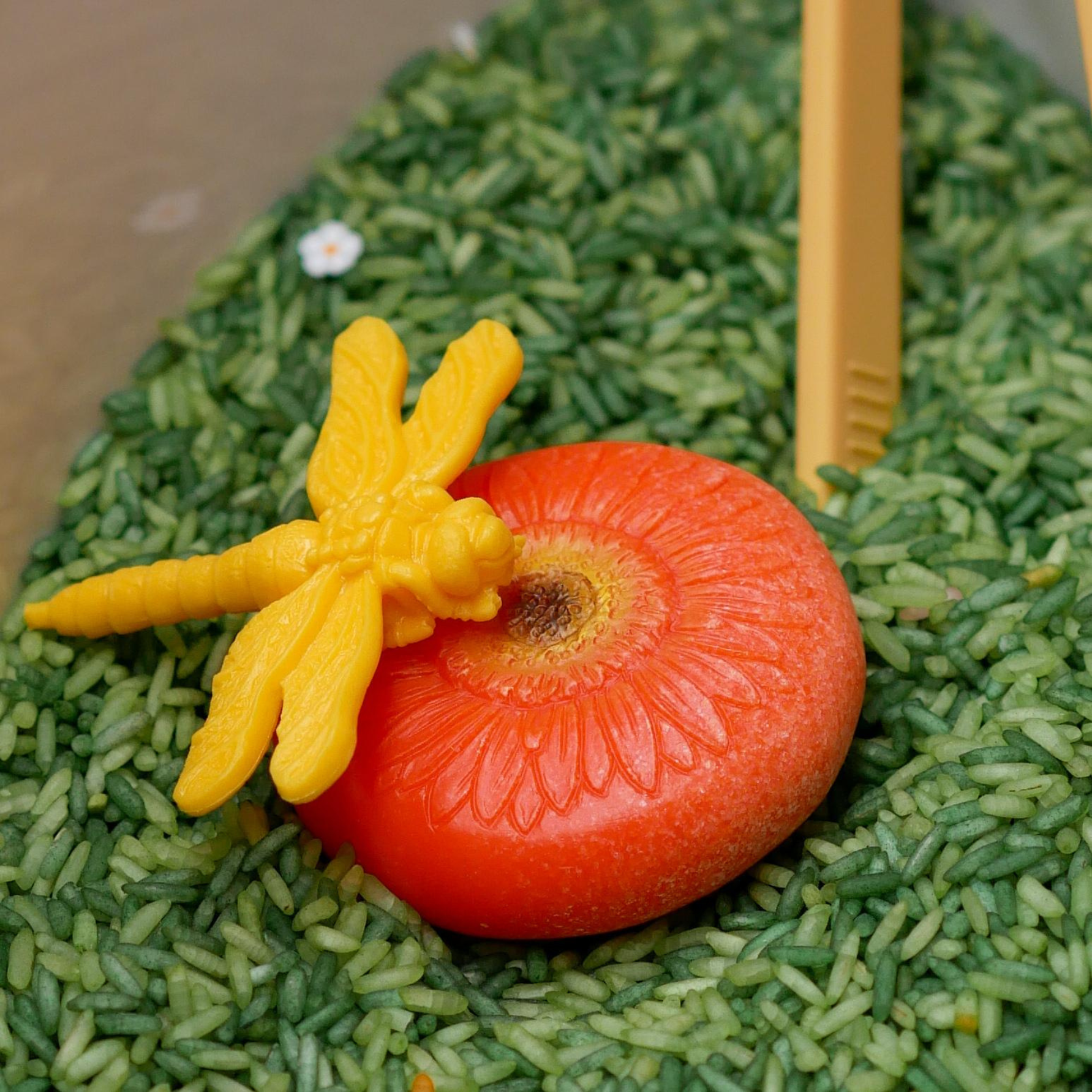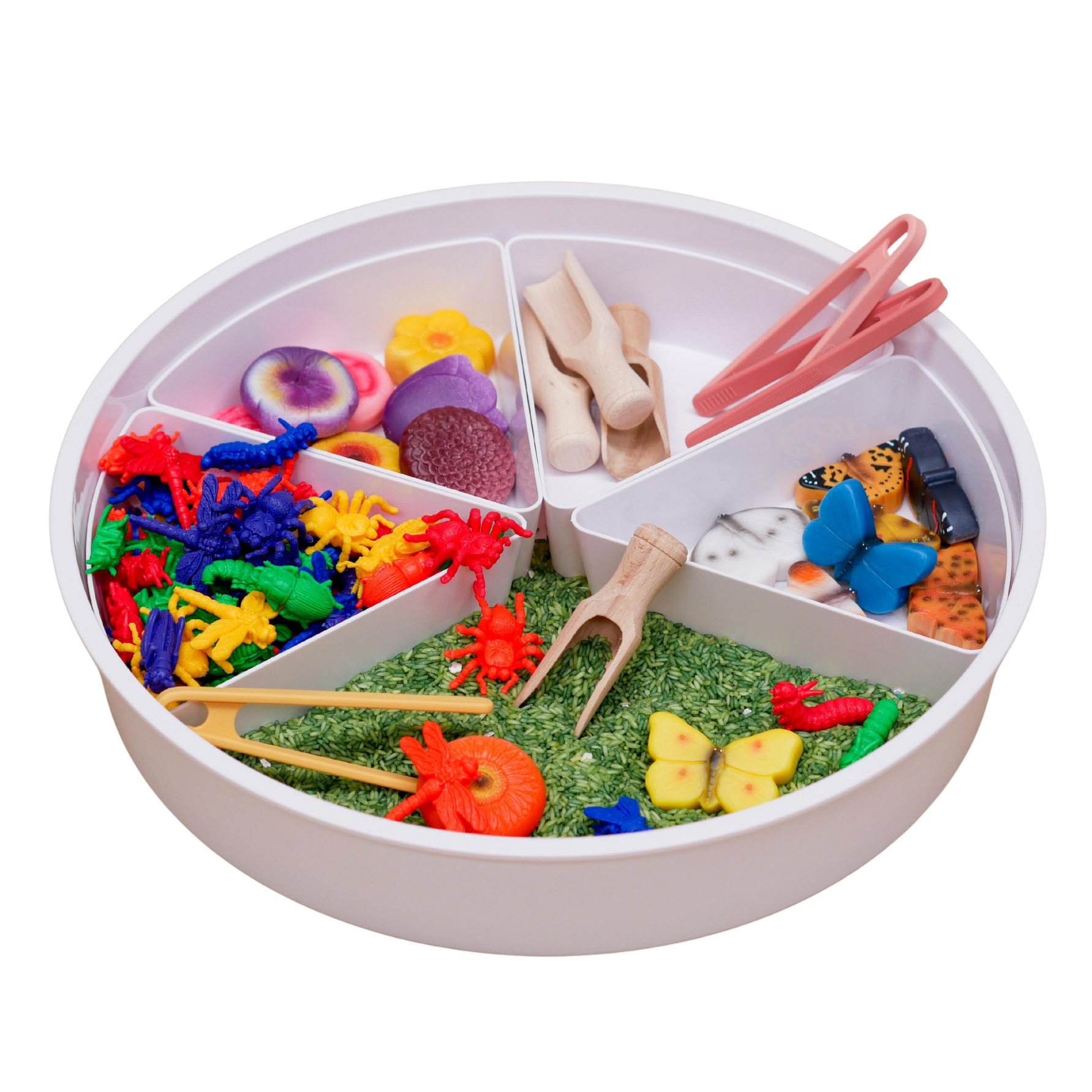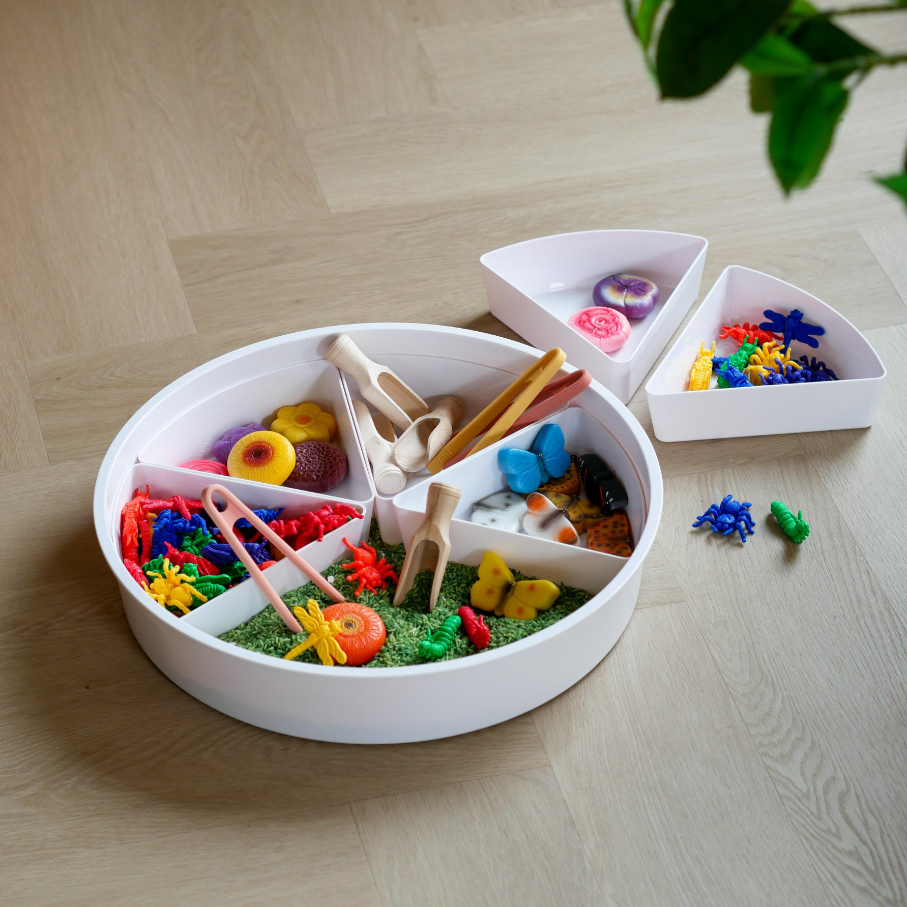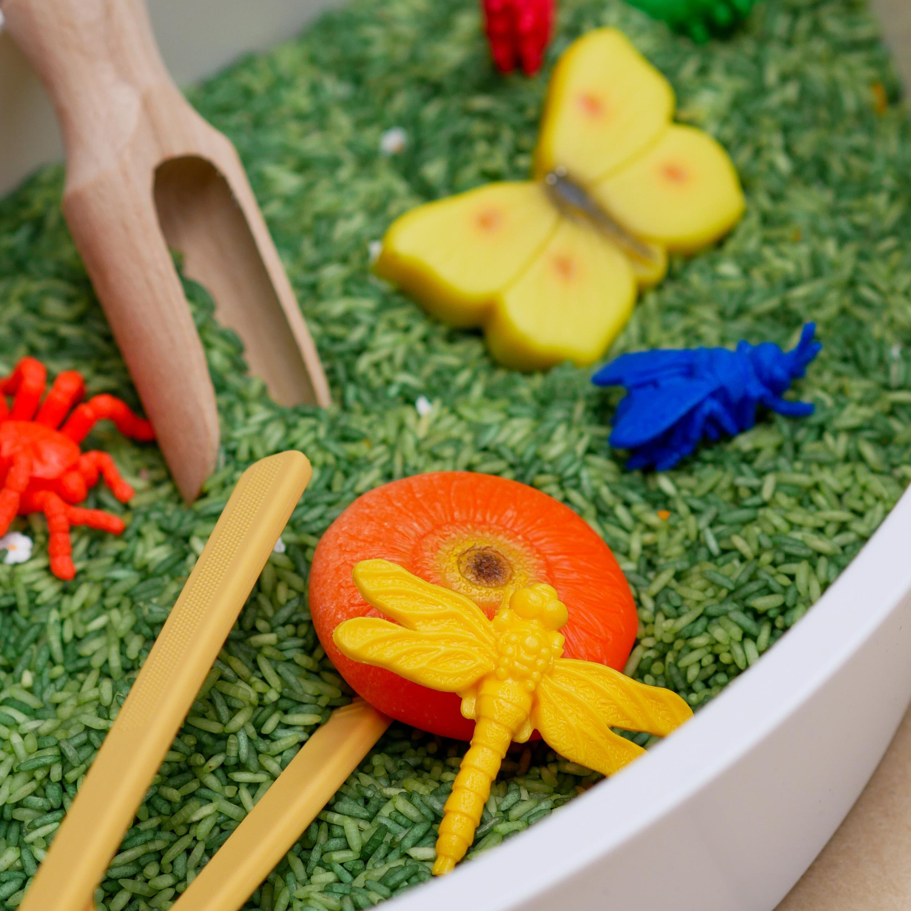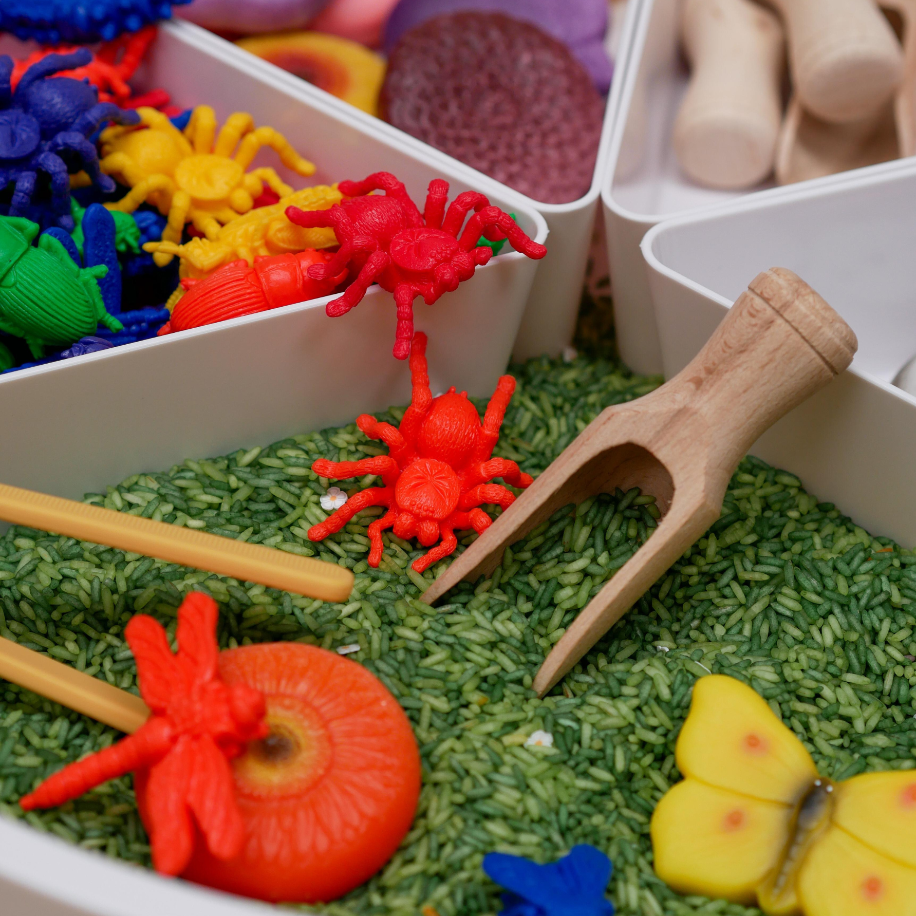 De Inspire My Play The Play Tray vormt de basis. Met de houten schepjes en tangetjes kunnen kinderen scheppen, sorteren en motorische vaardigheden oefenen. De sensorische speelstenen in de vorm van bloemen en vlinders en de Sorteer & Tel Tuininsecten van Learning Resources maken de speelervaring compleet. De bloemengroene speelrijst van Grennn zorgt voor een extra sensorisch en fantasierijk element.