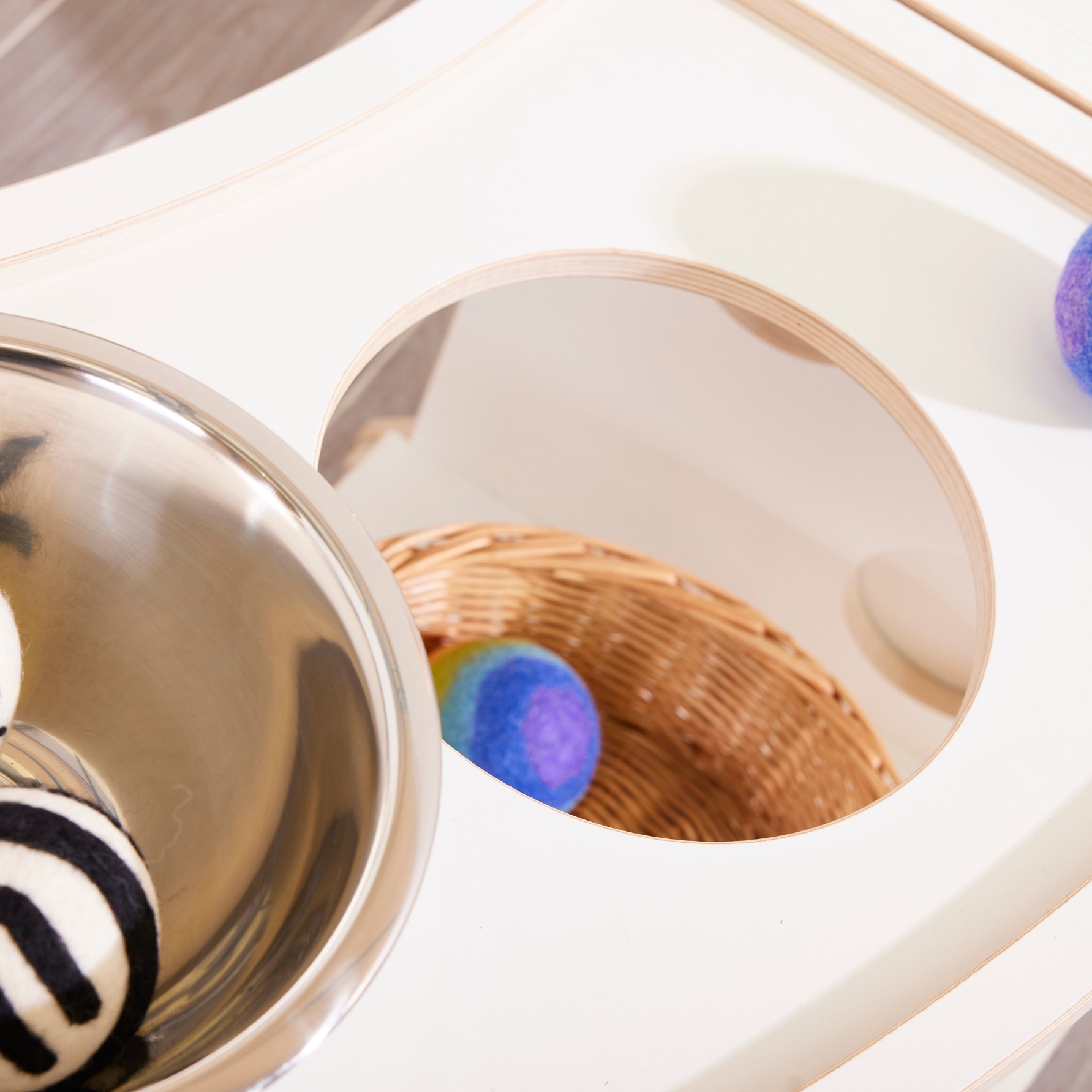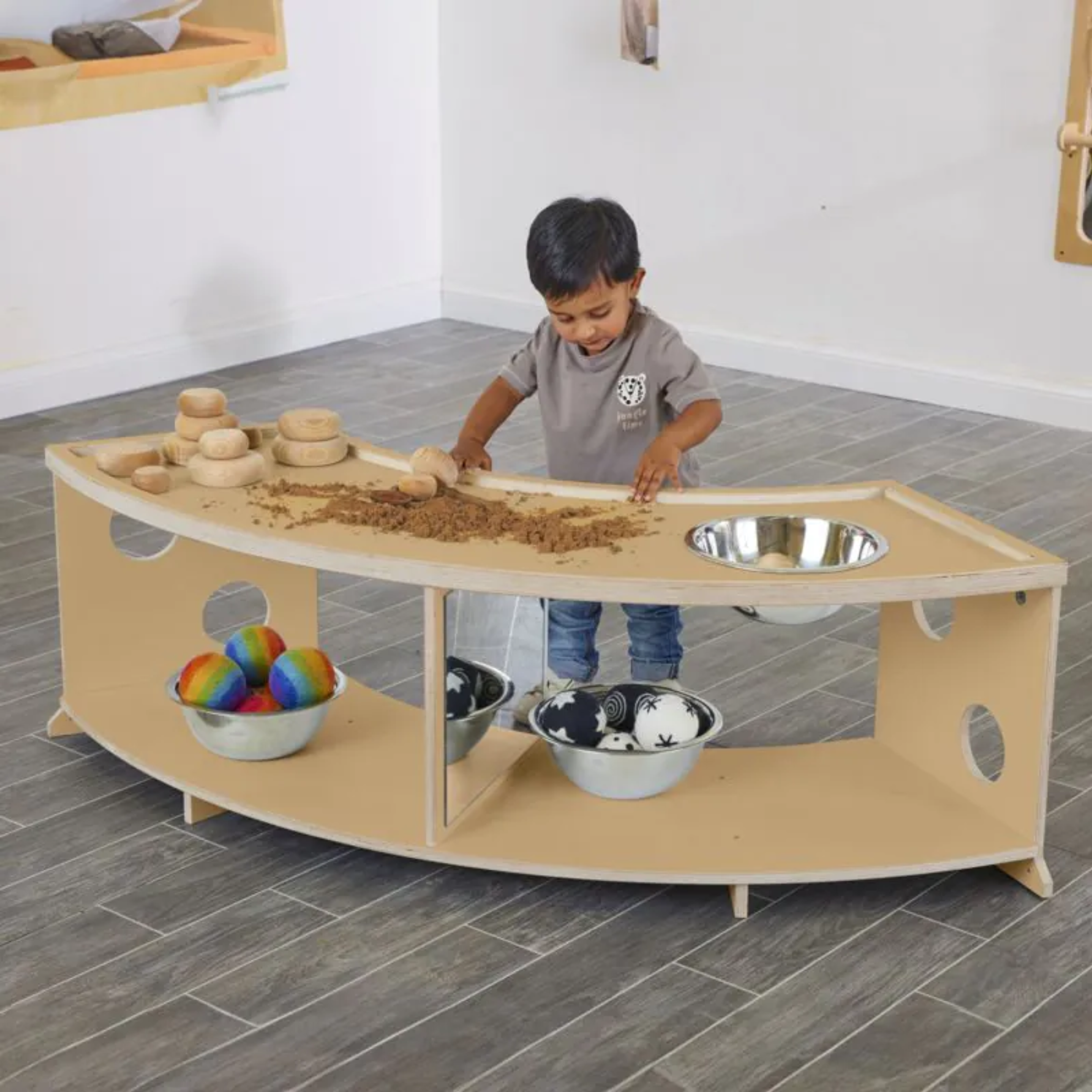 De Sensorische Toyshelf Halfrond is een uitnodigende, halfronde opberg- en speeleenheid die speciaal is ontworpen voor jonge kinderen om zelfstandig te ontdekken. Deze open kast combineert functionaliteit met spel en stimuleert kinderen om zelf speelgoed te pakken, te onderzoeken en op hun eigen tempo te leren. De afgeronde vorm zorgt voor een natuurlijke looproute en maakt de unit ideaal om een speelhoek af te bakenen binnen een groepsruimte. Dankzij de open indeling en kindvriendelijke hoogte is het speelgoed altijd zichtbaar en binnen handbereik, wat zelfstandigheid en sensorisch spel bevordert. Gemaakt van stevig, duurzaam materiaal