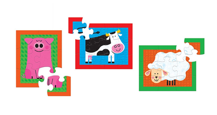 Deze geweldige puzzels van Crocodile Creek bevatten drie geïllustreerde puzzels die oplopen in moeilijkheidsgraad. De puzzels zijn gemaakt van stevig kwaliteitskarton en zijn verpakt in een bewaarkoffer. Deze puzzels zijn zeer geschikt als eerste puzzels om zelfstandig te starten met leren puzzelen. Vanwege de robuuste kwaliteit en de samenstelling van 3 puzzels in één verpakking zijn ze uitermate geschikt voor de babygroepen en babydreumesgroepen in de kinderopvang.