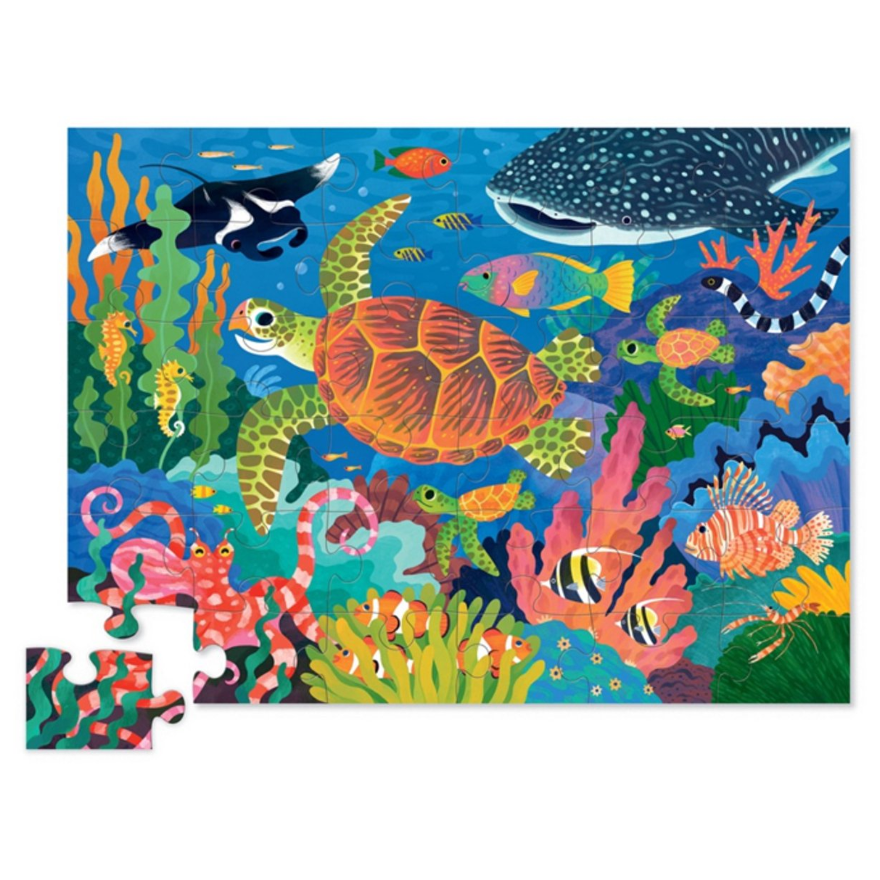Mooie "Sea Turtle" Vloerpuzzel met een kleurrijke afbeelding van zeedieren in de zee met prachtige kleuren. De puzzel bestaat uit 36 stevige jumbo puzzelstukken van hoge kwaliteit. De verpakking is compact en ruimtebesparend, geleverd in een prachtige, stevige geschenkdoos met silhouet. Puzzelen stimuleert zelfstandig denken en oplossen, vergroot de ruimtelijke vaardigheden en helpt de fijne motoriek te verbeteren.