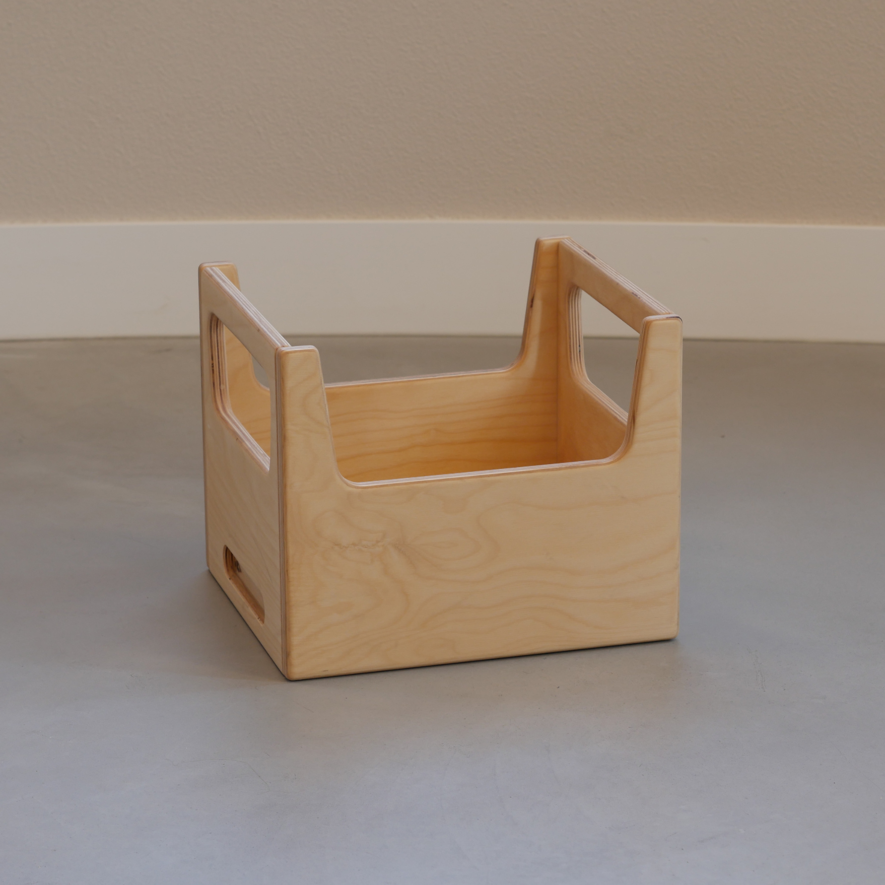 De afmetingen en vorm zijn afgestemd op kinderen die al iets meer controle hebben over hun bewegingen en graag experimenteren met ruimte, balans en functie. De handgrepen nodigen uit tot dragen, de open structuur tot verzamelen en ordenen, en de stevige basis maakt de kist geschikt om op te zitten, te bouwen of op te klimmen.