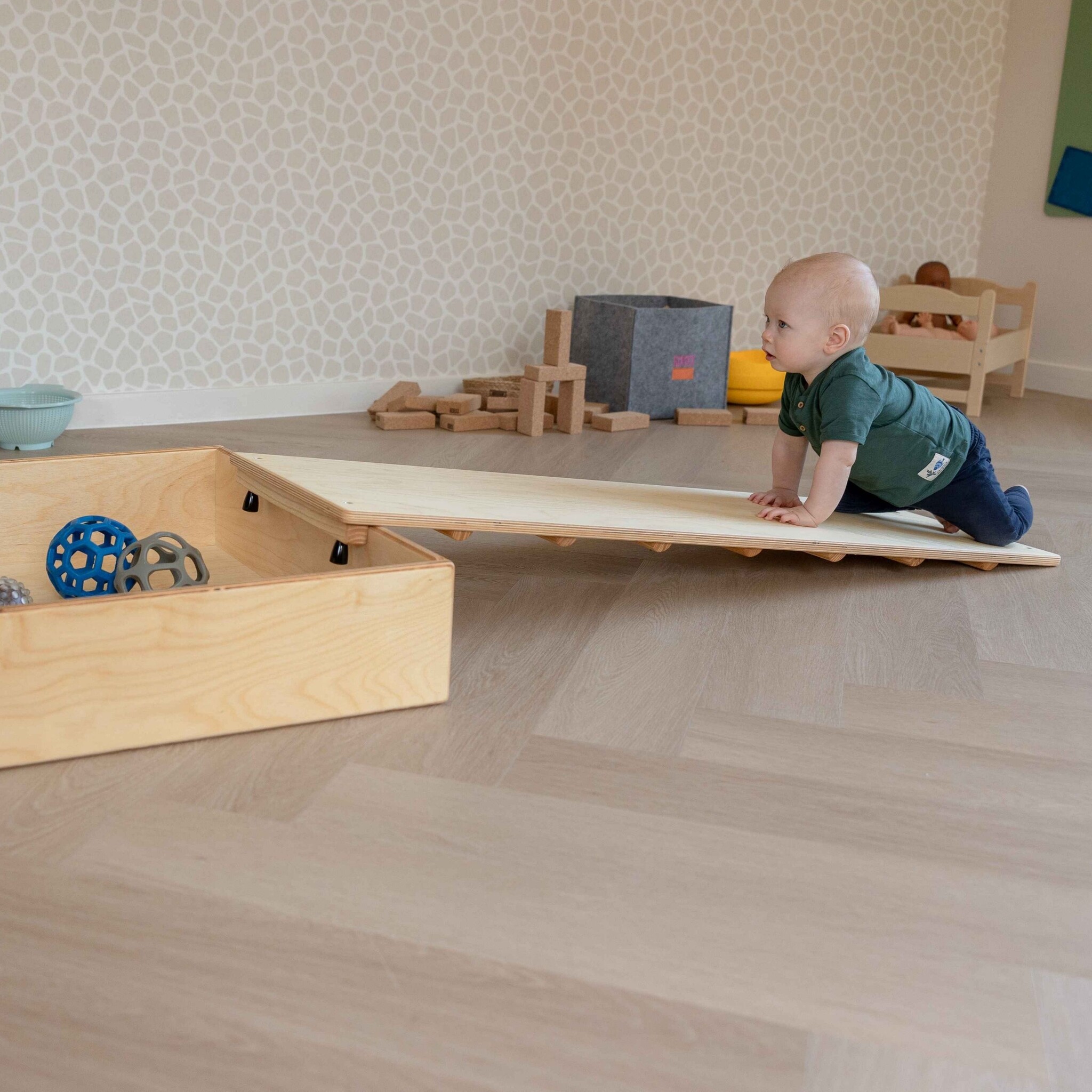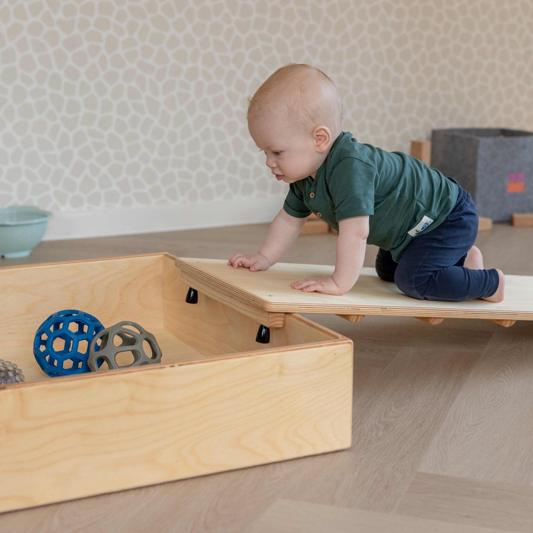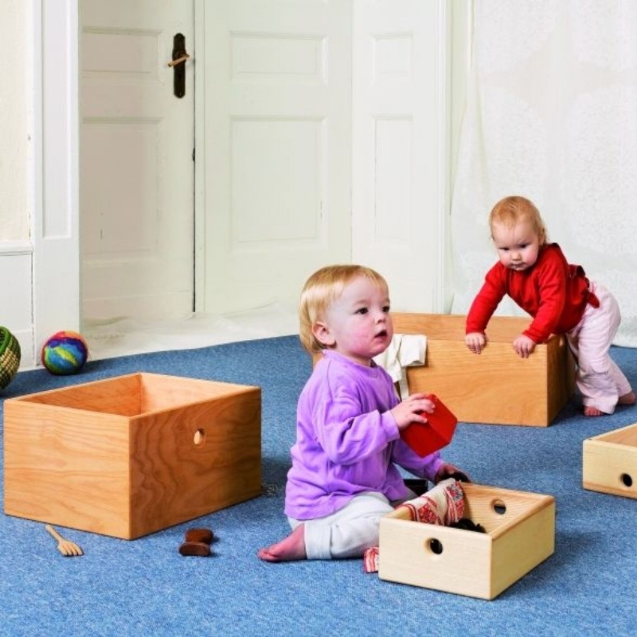 Met deze speelkist kunnen kinderen zelfstandig op eigen initiatief en op eigen tempo zichzelf en de wereld ontdekken. Het is een kleinere maat dan de bekende speelkist bij de kruipkisten set van 3, daardoor extra leuk om spelmaterialen in te verzamelen of erin te gaan zitten.