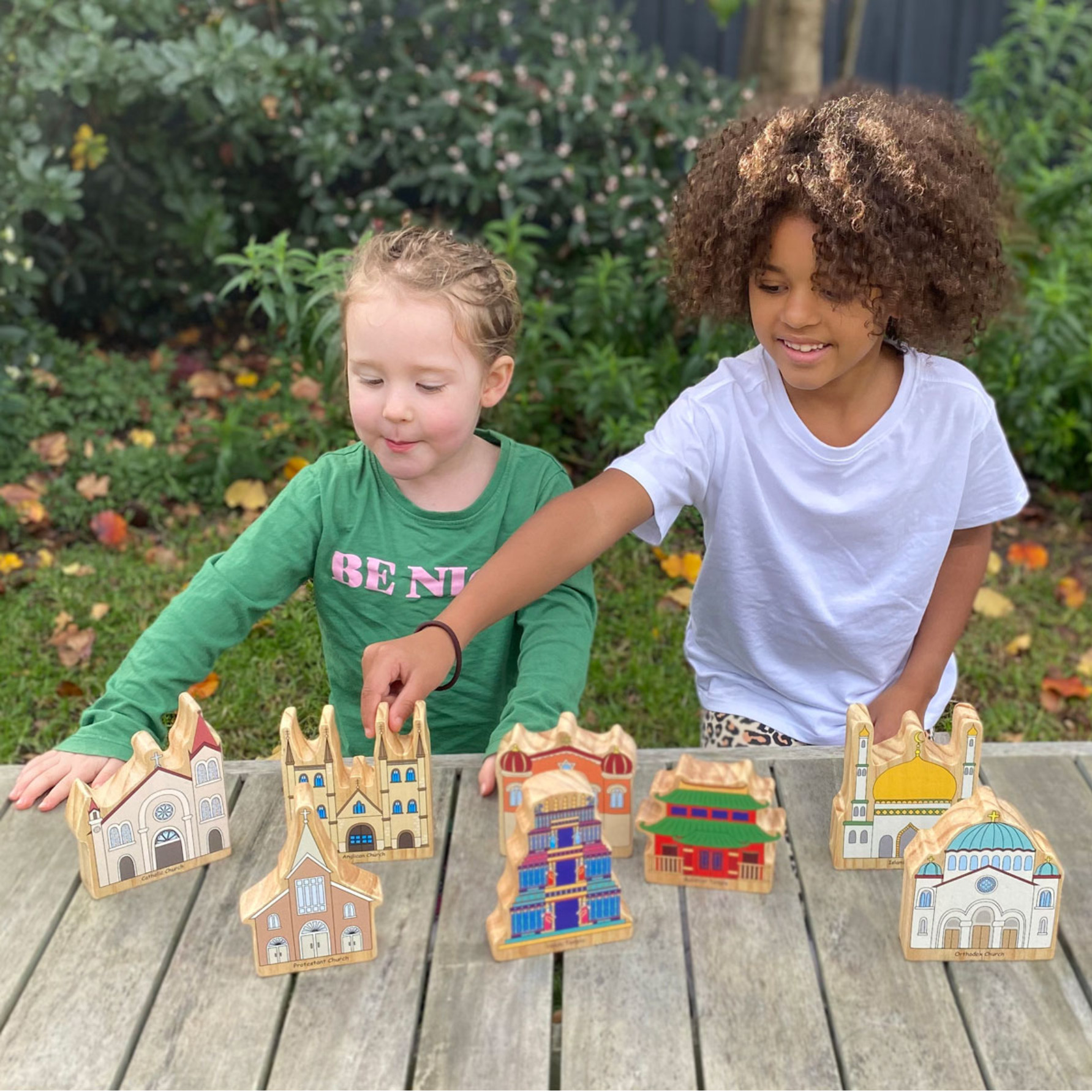 Deze houten set vertegenwoordigt landen en culturen over de hele wereld. 8 massief houten blokken zijn bedrukt met gebedshuizen van verschillende culturen waaronder een katholieke kerk, een synagoge en islamitische moskee.