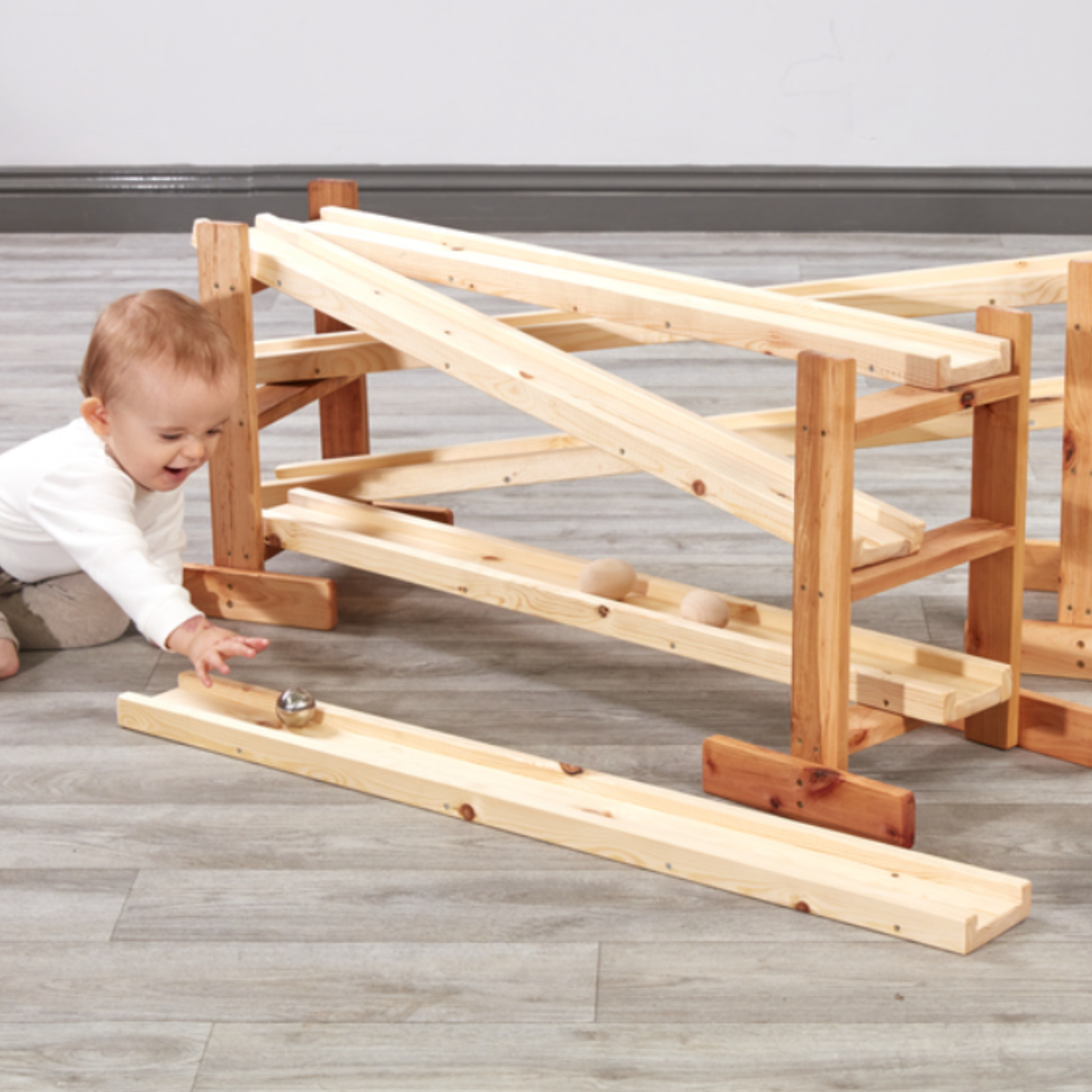 Veelzijdig en makkelijk te gebruiken. De glijbanen zijn licht genoeg voor kinderen om te dragen en te rangschikken, waardoor het gemakkelijk te gebruiken is voor zelfstandig spel. Voor extra speelwaarde bevat de set drie houten standaards die gemakkelijk kunnen worden gedragen en als dat nodig is, zodat de kinderen een basis met verdiepingen hebben voor verschillende hoogtes.