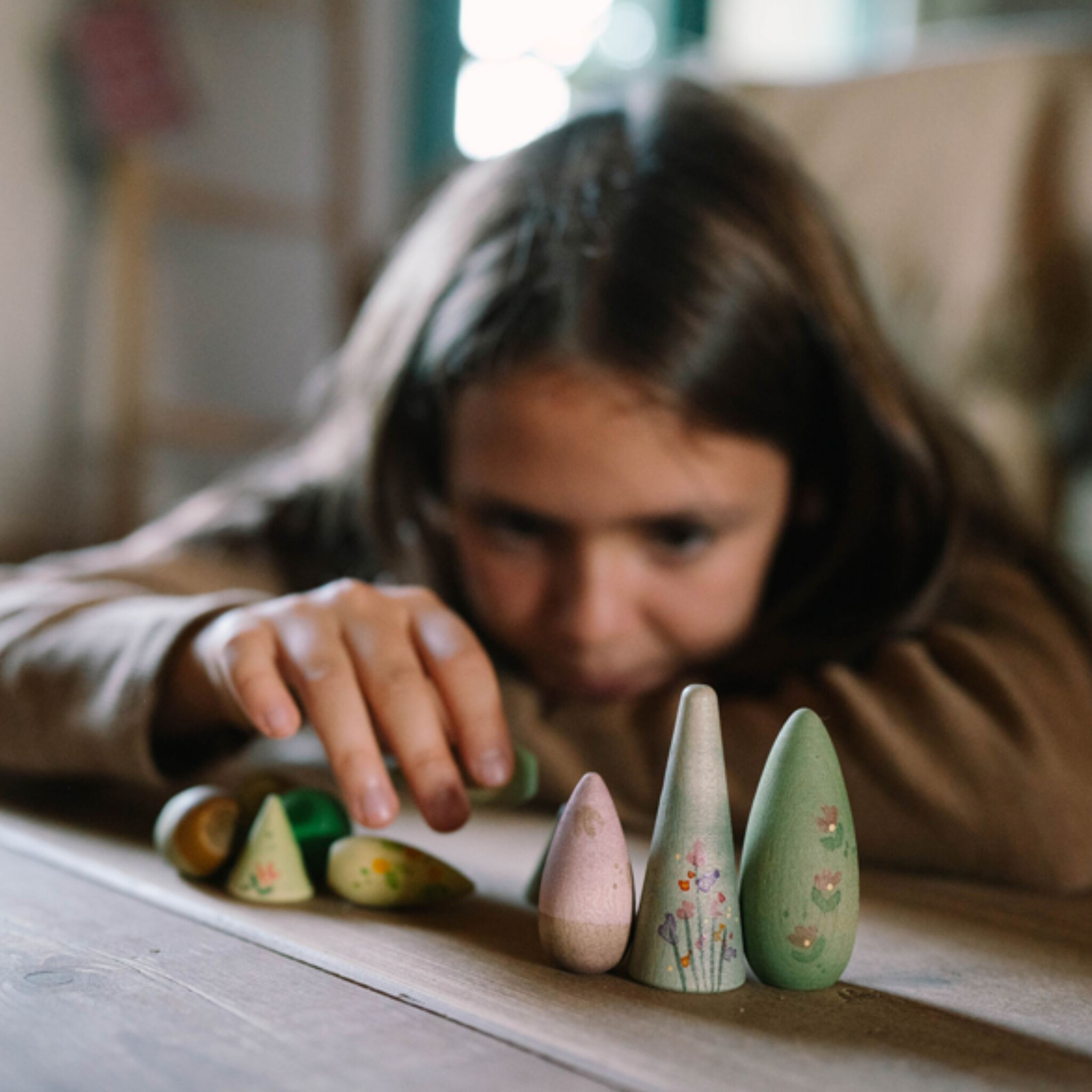 De houten sets van Grapat zijn veelzijdig als speelgoed om te sorteren op vorm, kleur of grootte in de sorteerbak, kommetjes, schaaltjes of bakjes.