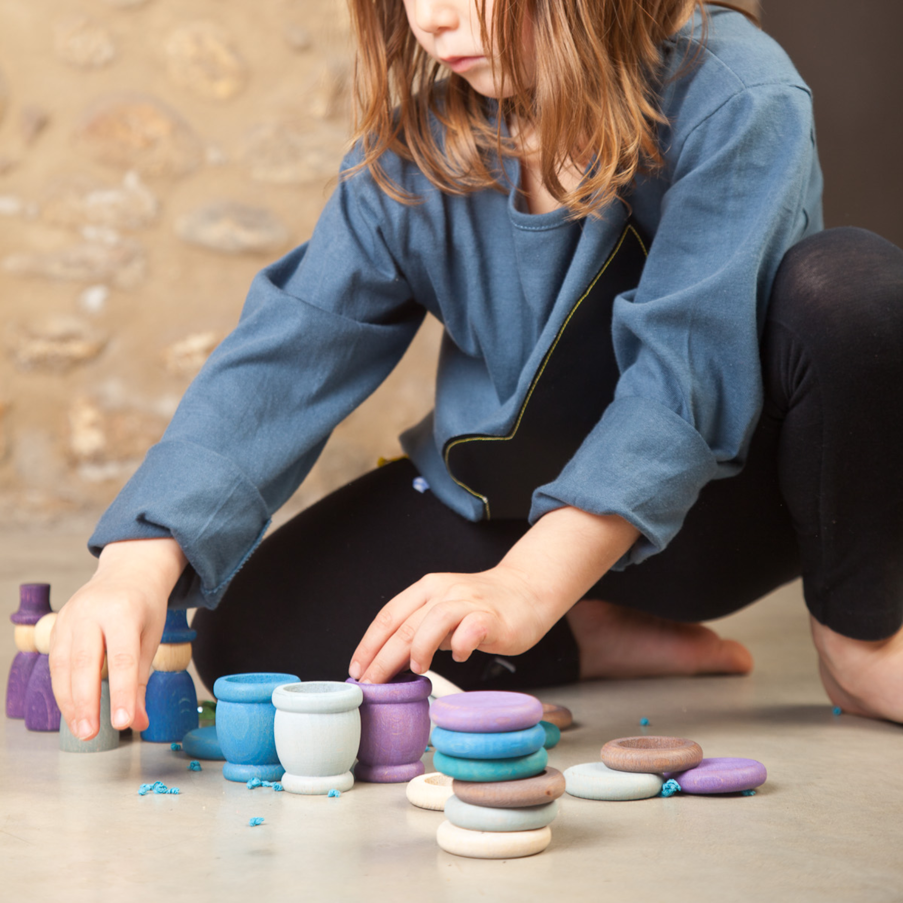 27-delige set bestaande uit 3 poppetjes met én 3 zonder hoed, 6 bakjes, 9 ringen en 9 schijfjes. Deze set heeft winterse natuurtinten. Alle onderdelen lenen zich voor sorteer- en stapel- en telspel.
