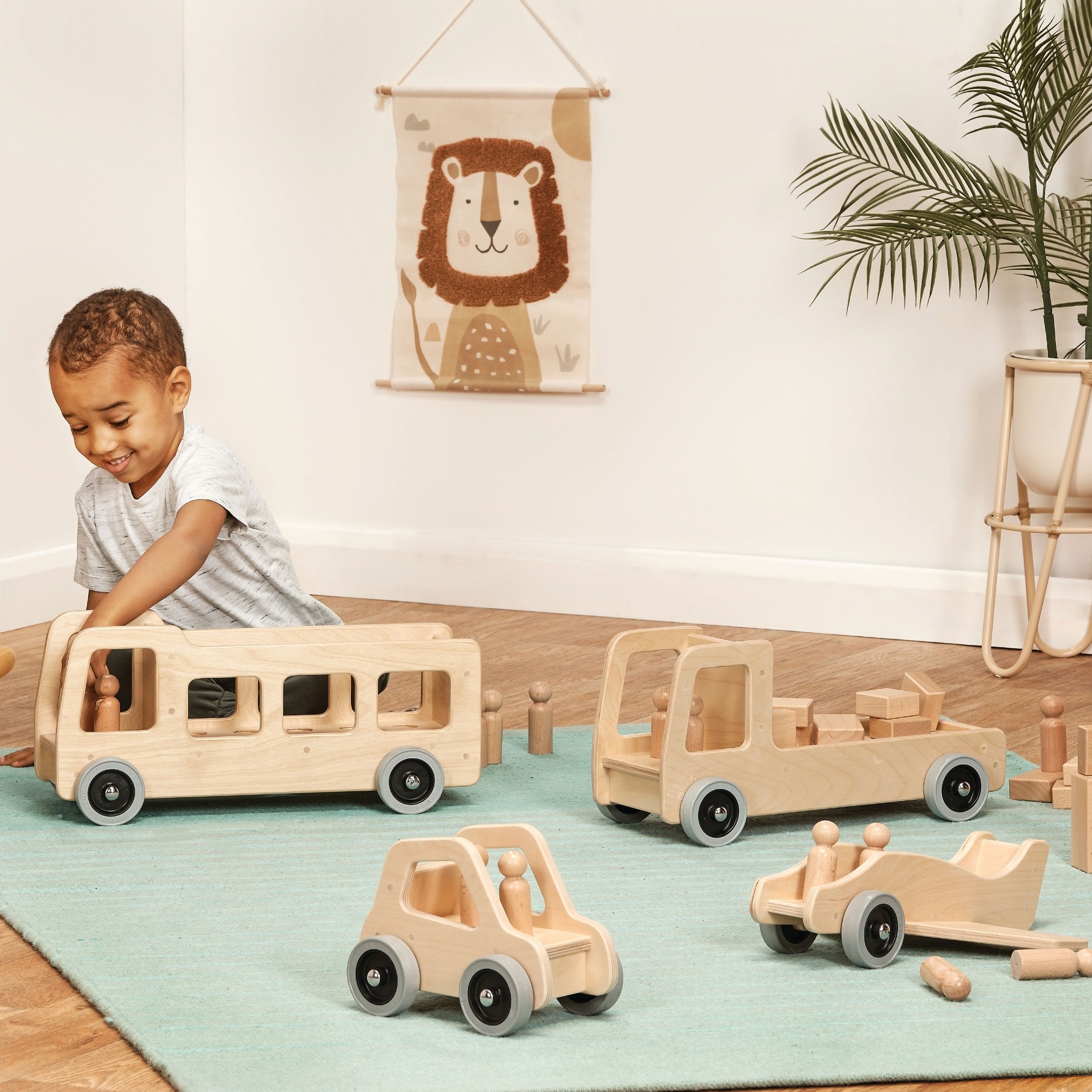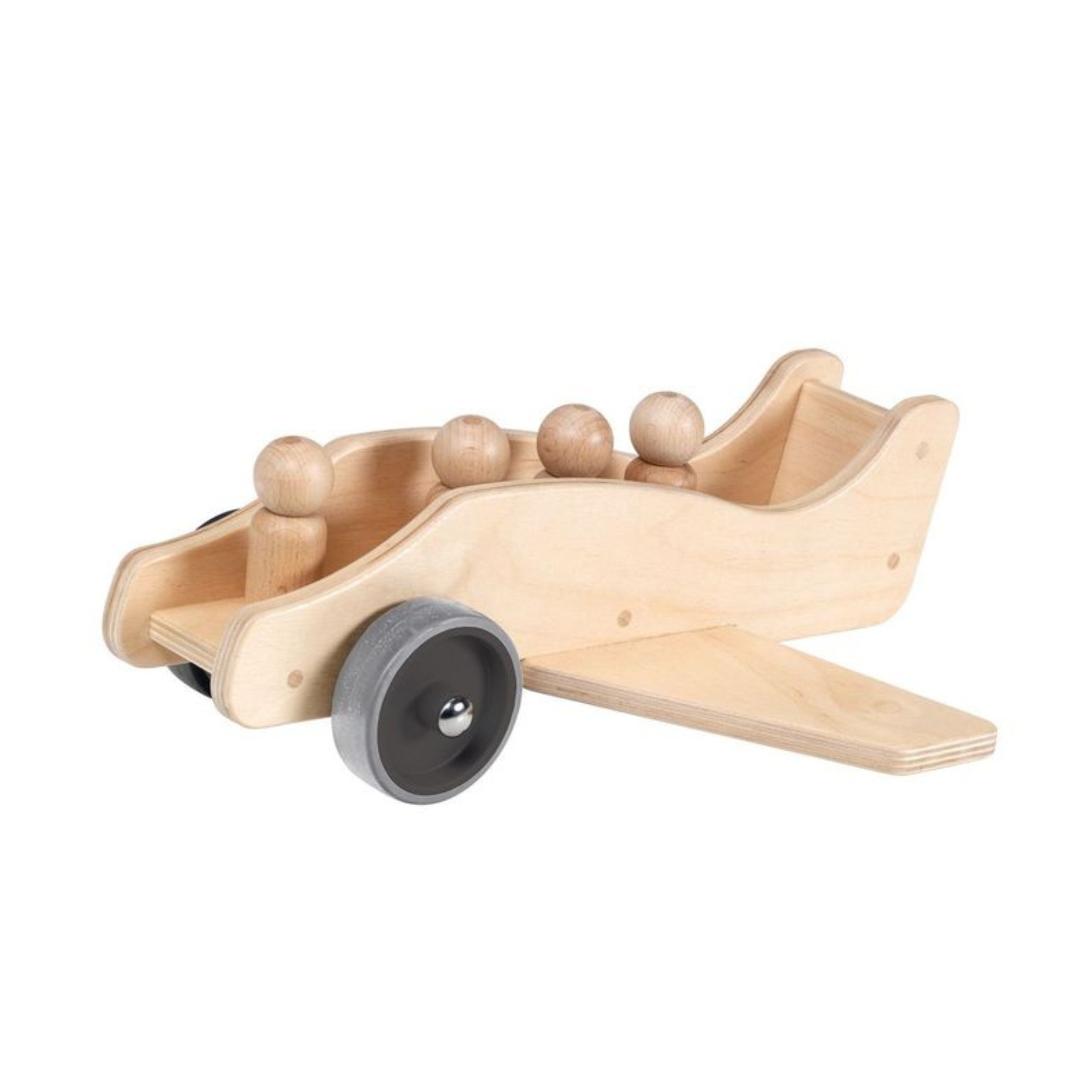 Een grote houten vliegtuig en 4 houten poppetjes. Het speelgoed vliegtuig rijdt soepel op de 2 wielen met grijs/zwarte rubberen banden. Eenvoudig vormgegeven waar jongere kinderen geen genoeg van kunnen krijgen.