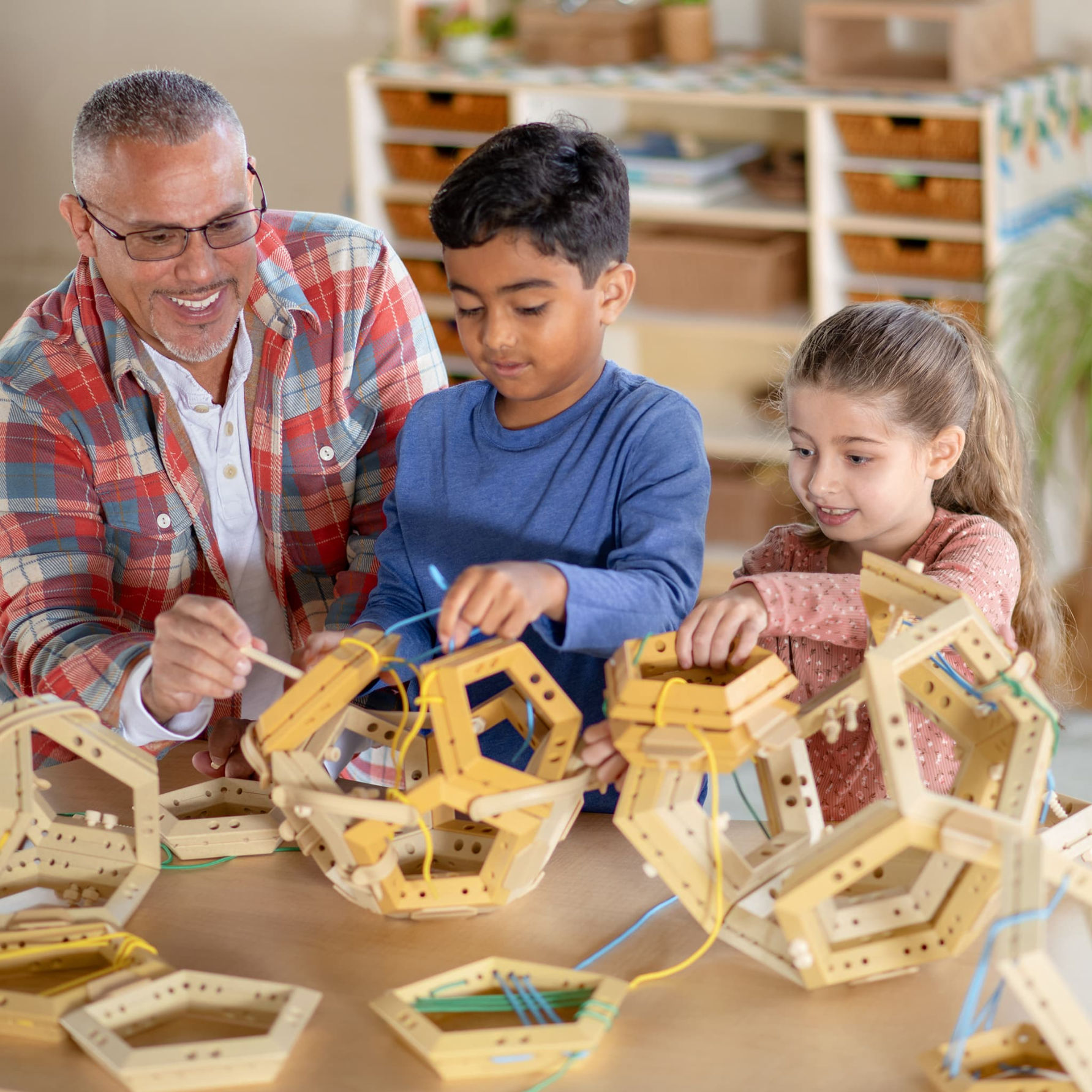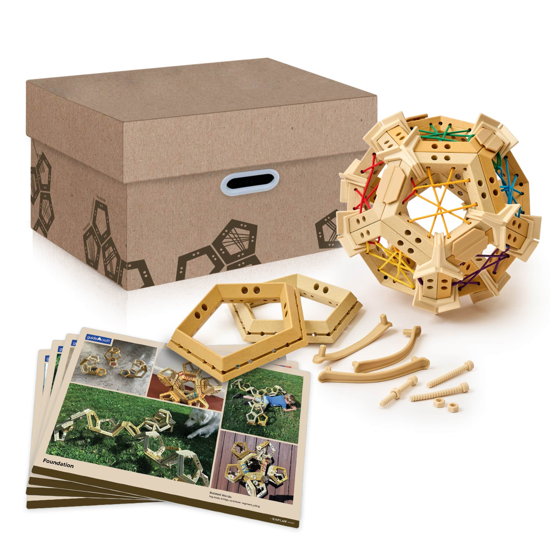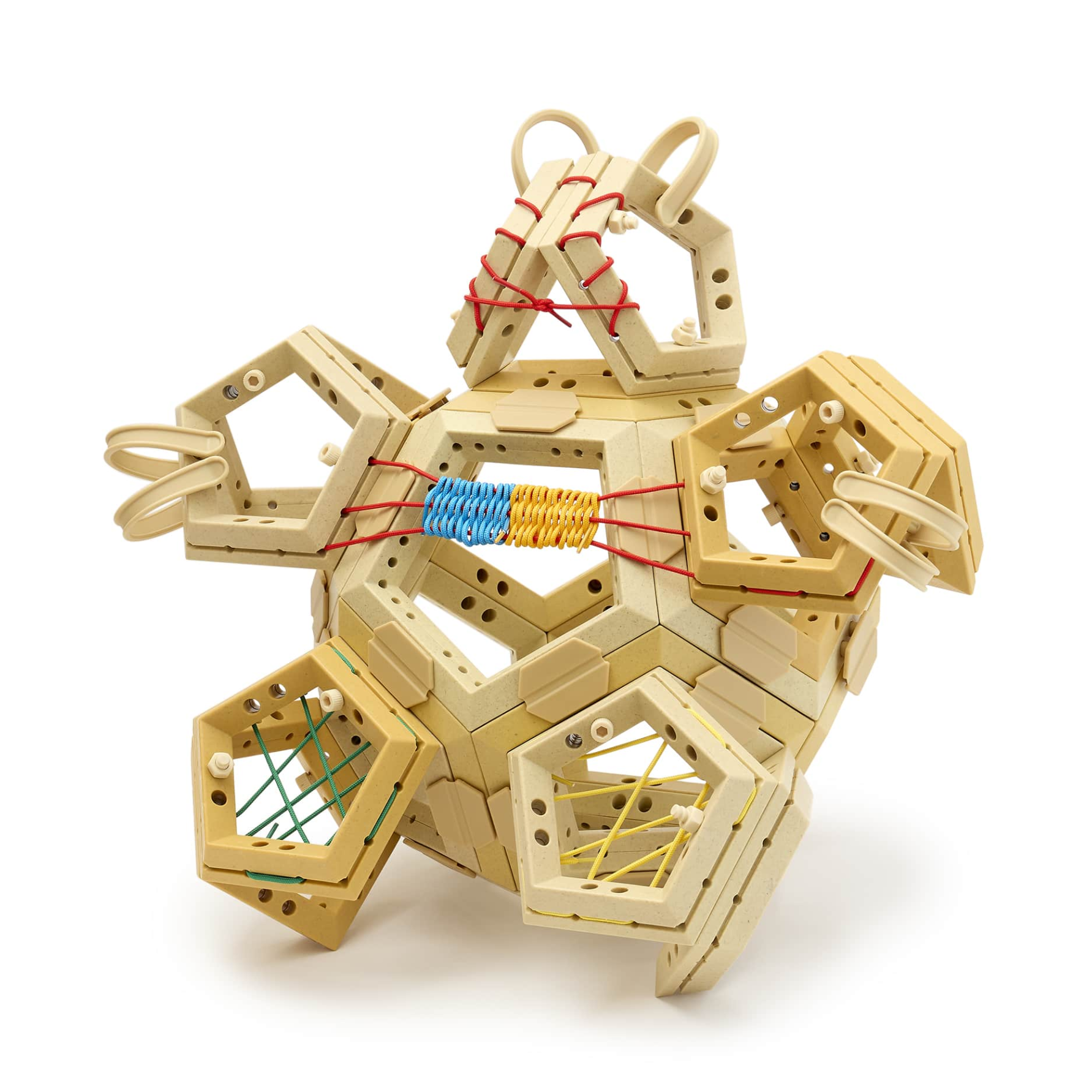 Hele grote set met zachte, buigzame plastic onderdelen met een kliksysteem en kogel- en scharnierverbindingen waarmee kinderen gemakkelijk horizontaal, verticaal of in een webachtig netwerk kunnen bouwen.