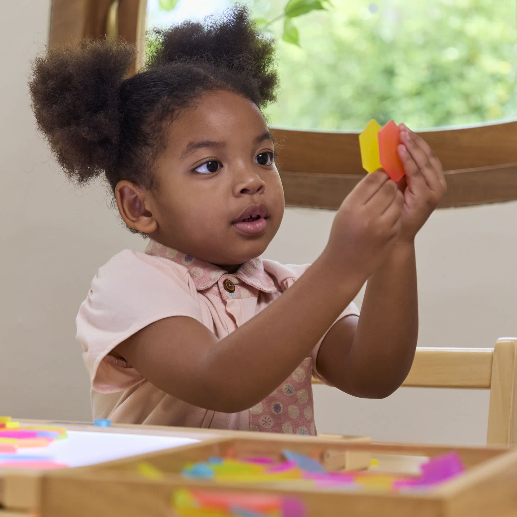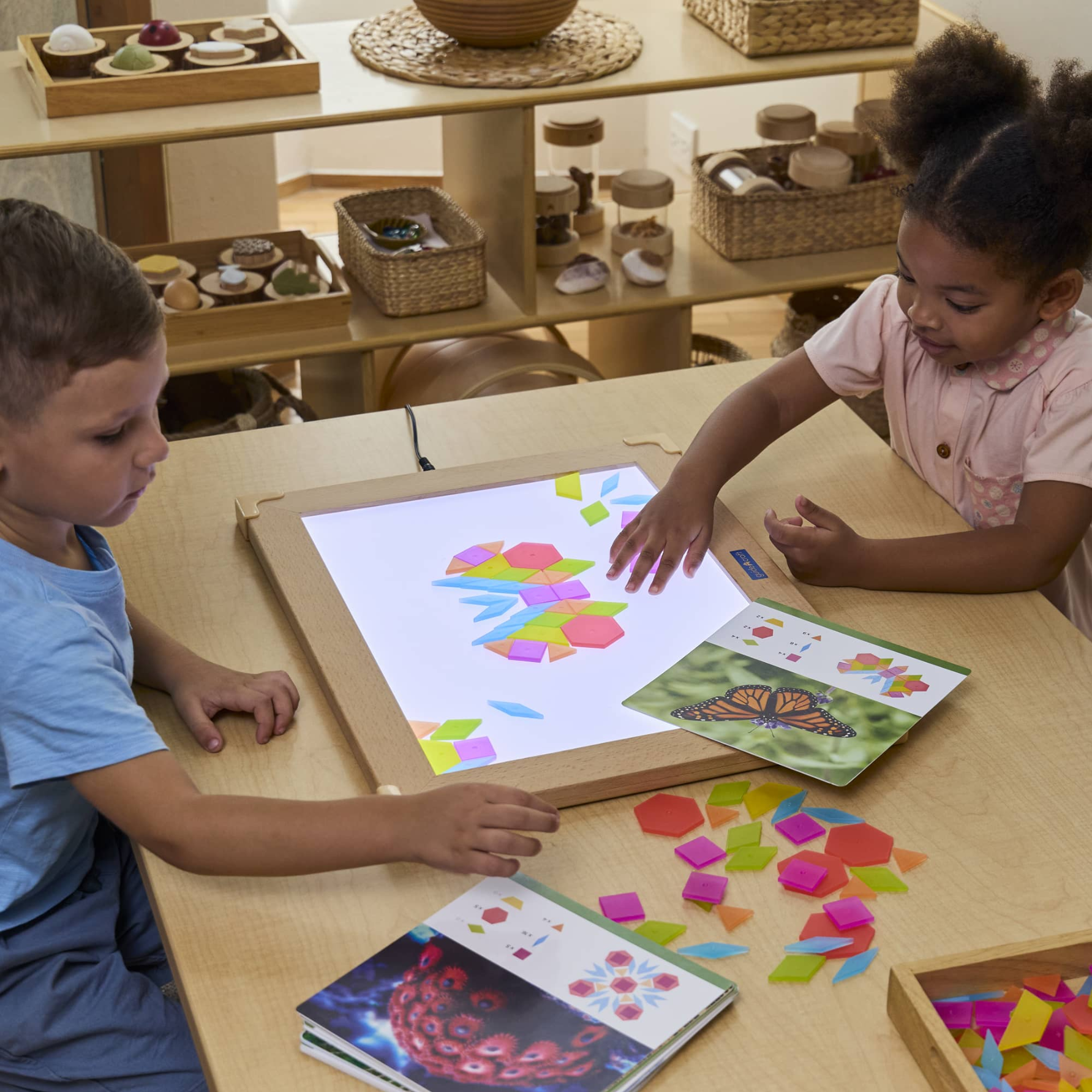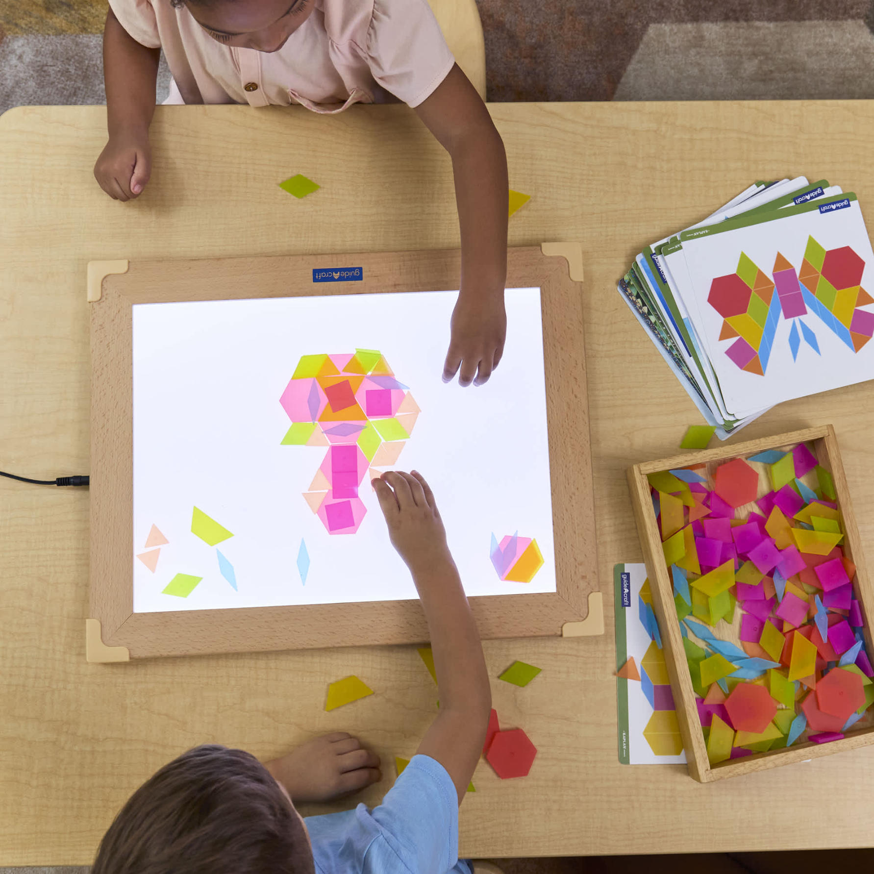 Deze heeft transparante delen, die naar de basisvormen van een tangram gemaakt zijn. Als deze slim tegen en op elkaar worden gelegd, ontstaan de meest uiteenlopende geometrische figuren. En met de talloze combinatiemogelijkheden – naar een voorbeeld of volledig vrij – groeit ook het experimenteerplezier van de kleine stapelkunstenaars!