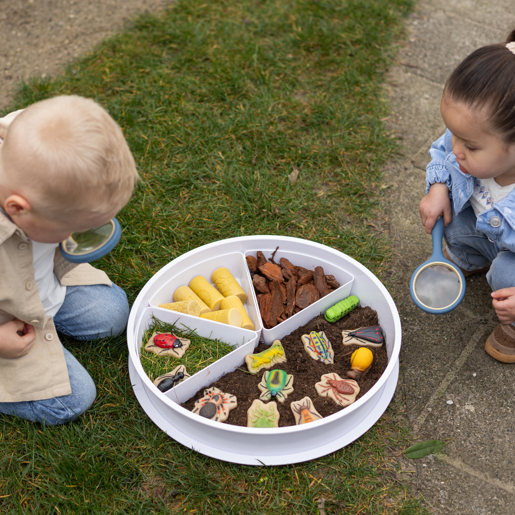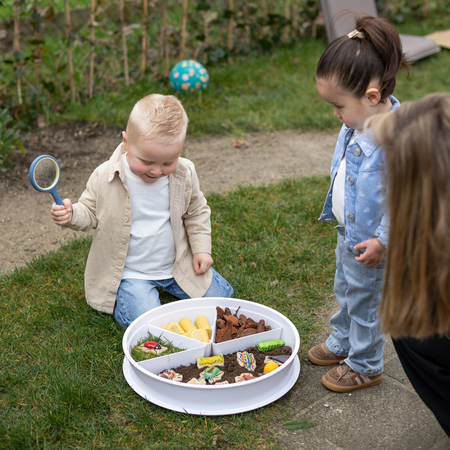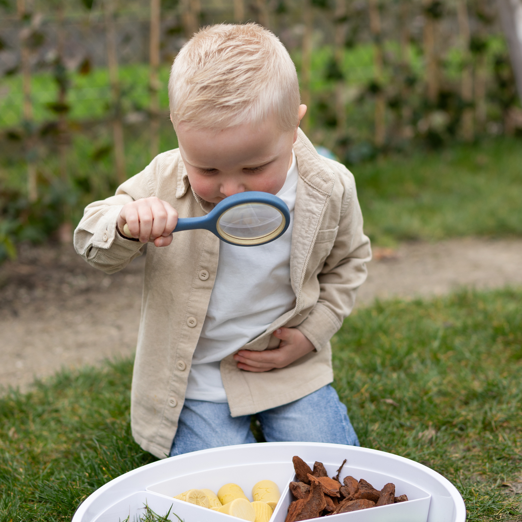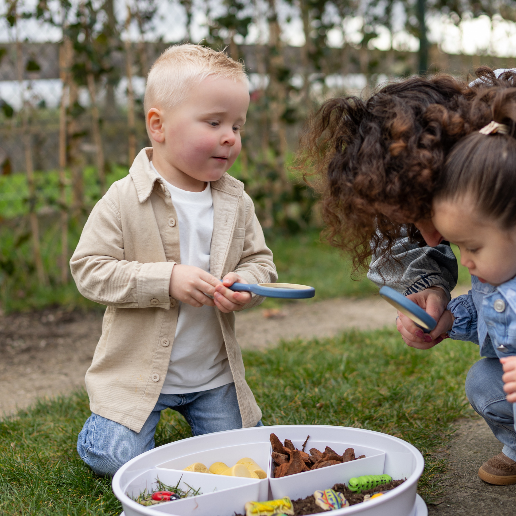 Een set met 4 vergrootglazen om te ontdekken. Ze kunnen er buiten interessante insecten mee bekijken of binnen schatten bestuderen.