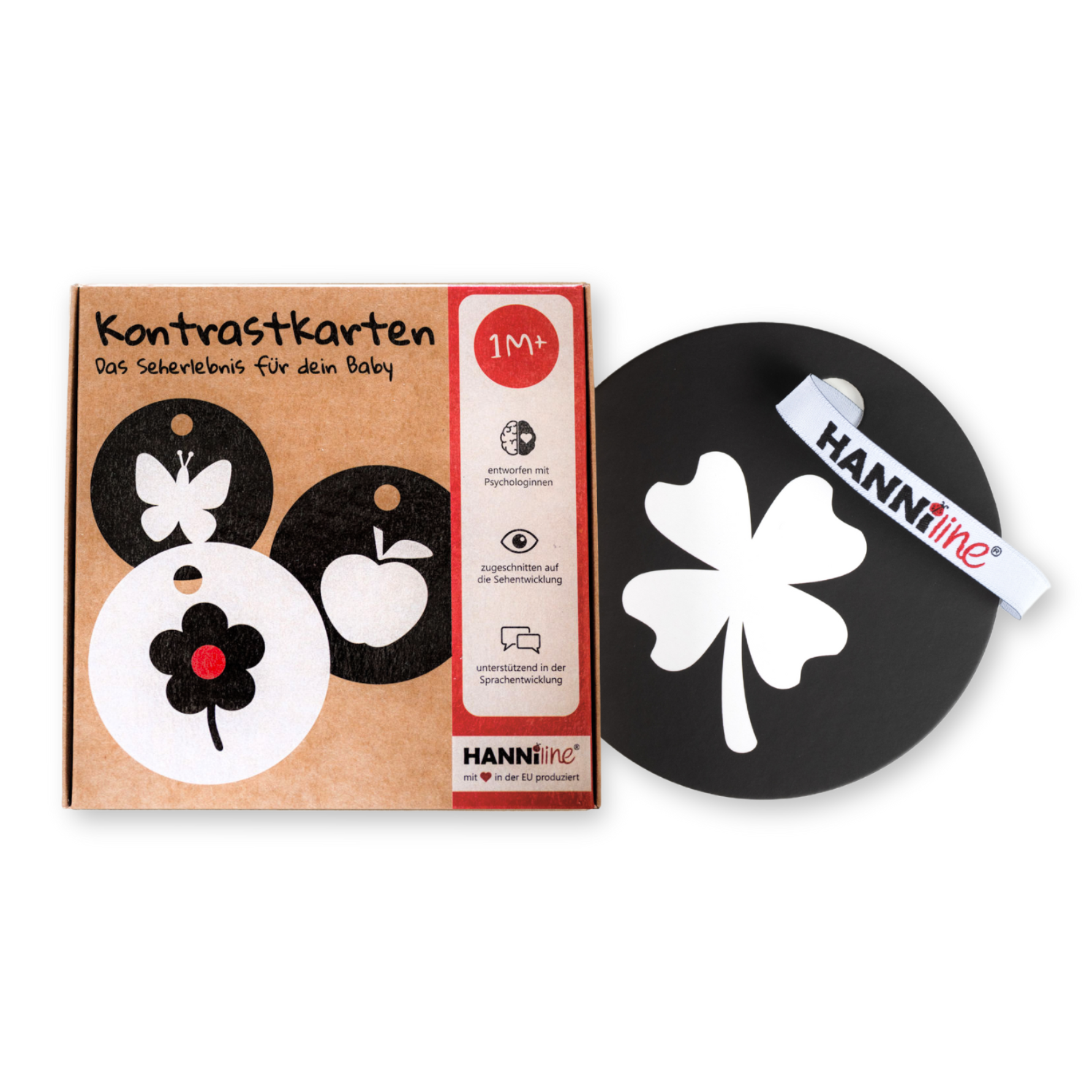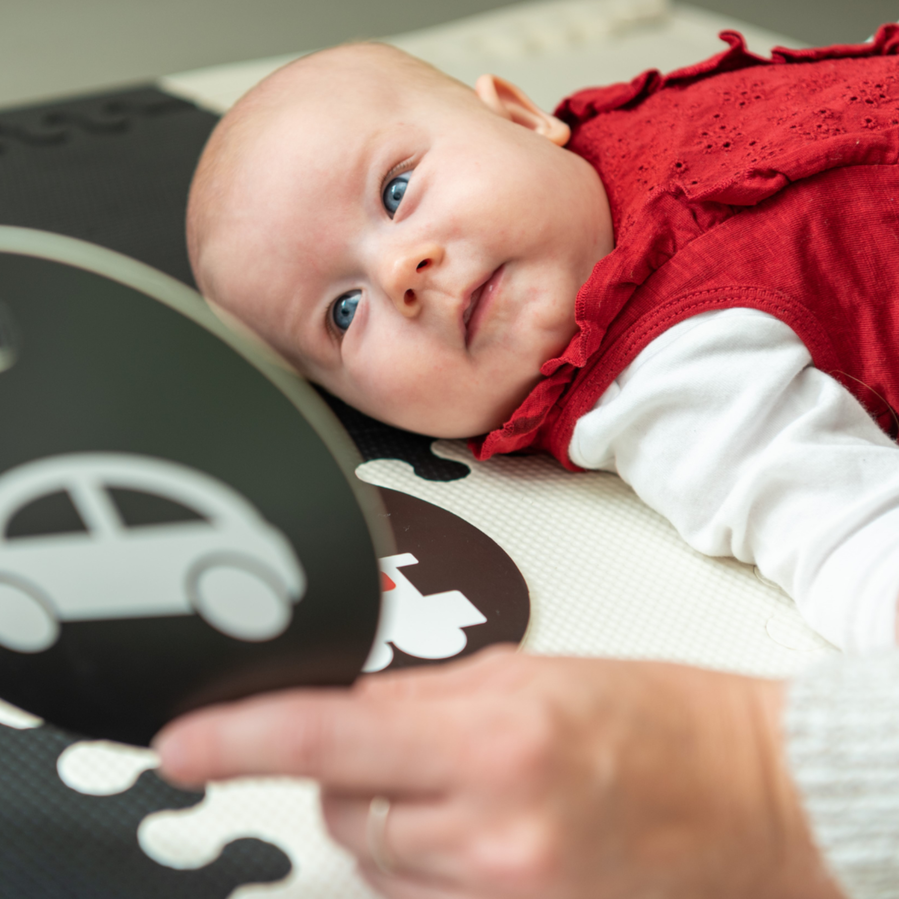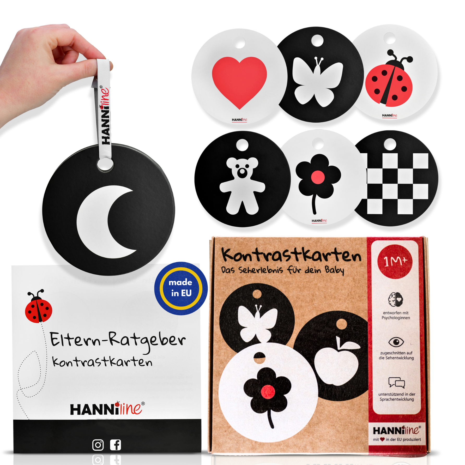 10 stevige, kijkkaarten met zwart-wit contrast. Vanaf ongeveer één maand beginnen baby's interesse te tonen in oppervlakken met sterke contrasten, waardoor deze kaarten extra goed zichtbaar zijn voor hen. Naarmate kinderen ouder worden, kunnen ze de voorwerpen benoemen.