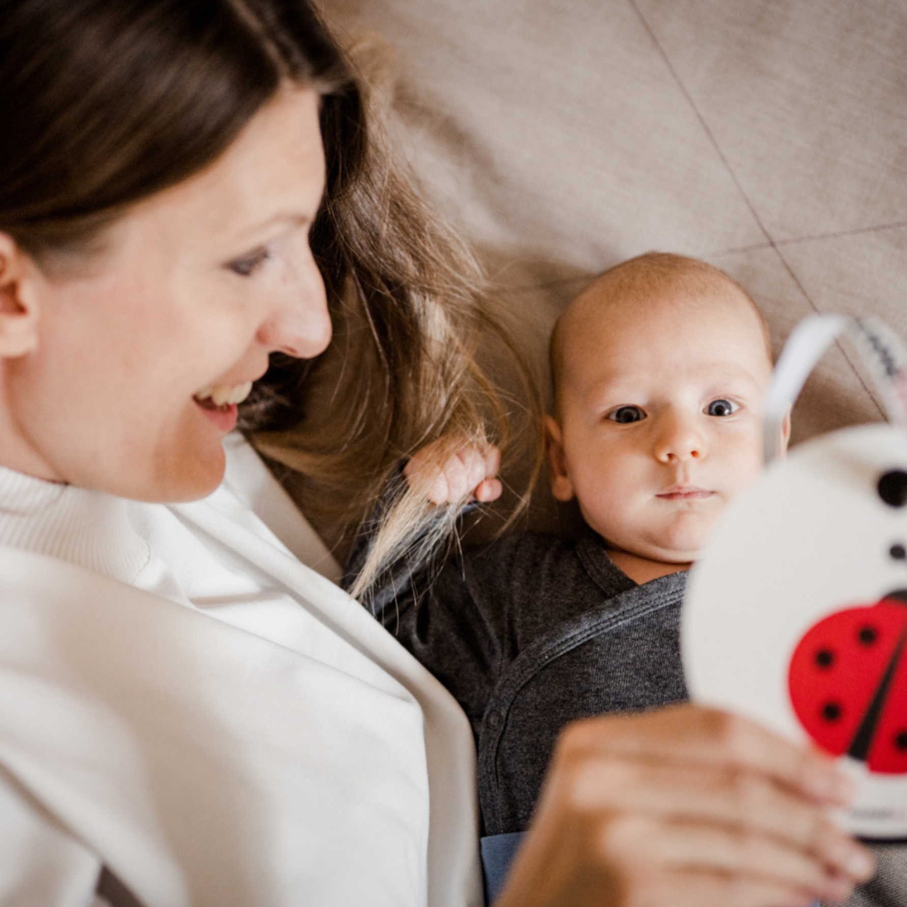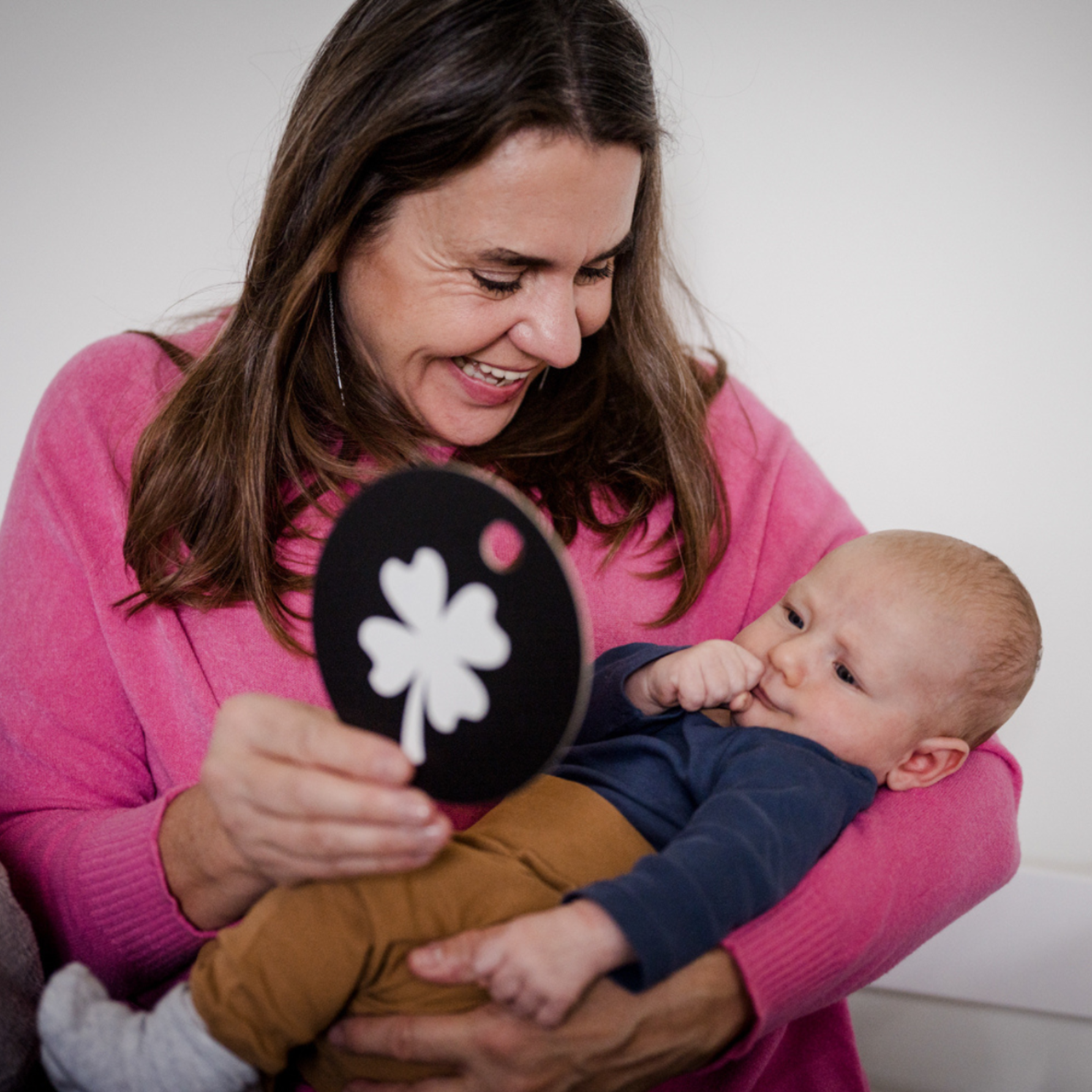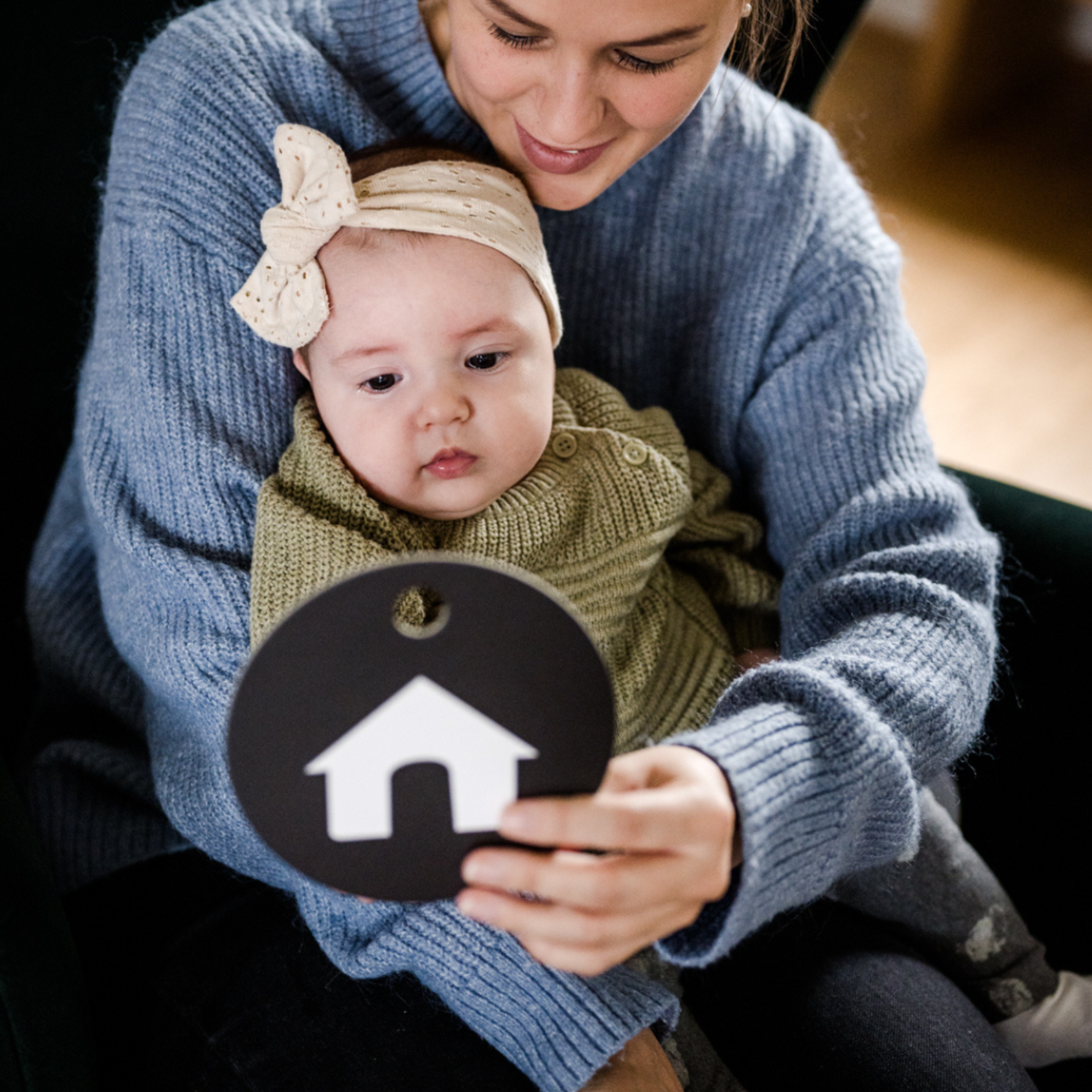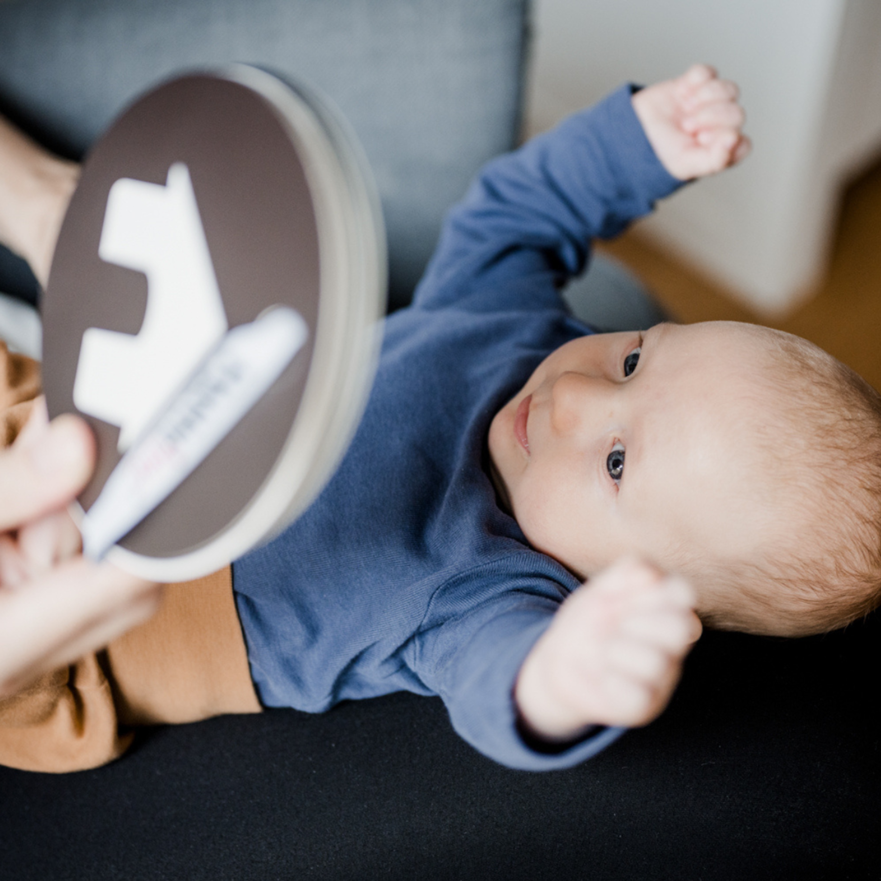 10 stevige, kijkkaarten met zwart-wit contrast. Vanaf ongeveer één maand beginnen baby's interesse te tonen in oppervlakken met sterke contrasten, waardoor deze kaarten extra goed zichtbaar zijn voor hen. Naarmate kinderen ouder worden, kunnen ze de voorwerpen benoemen.