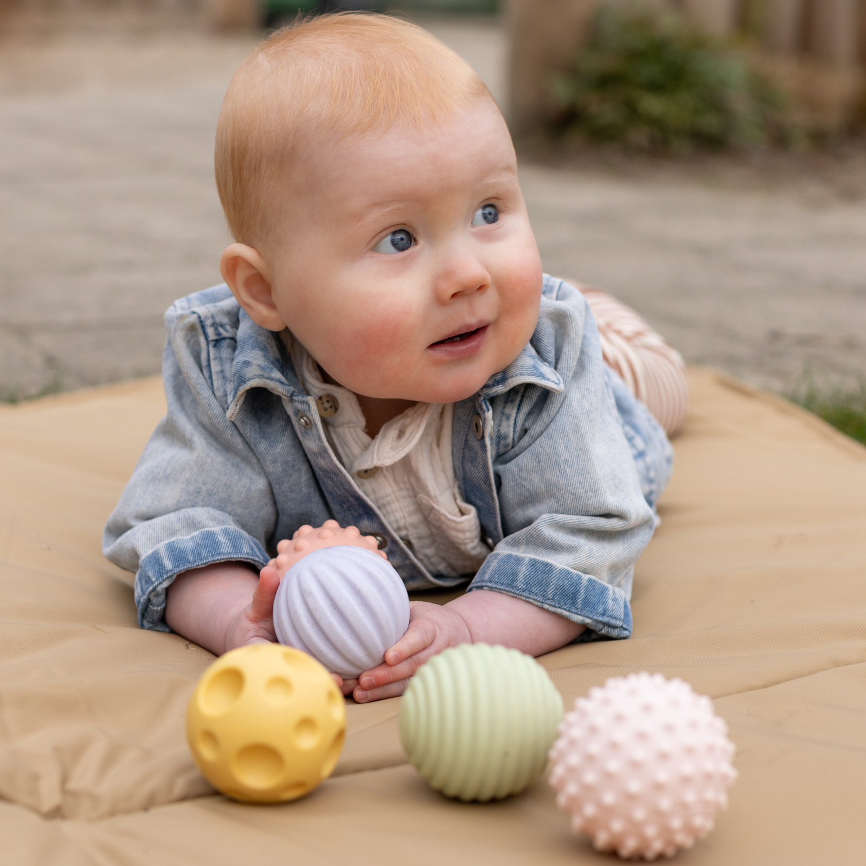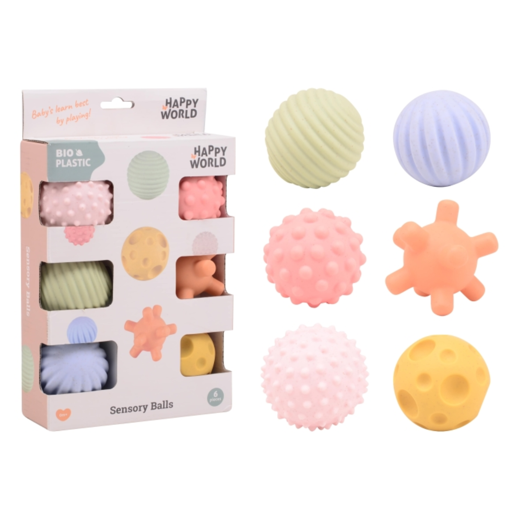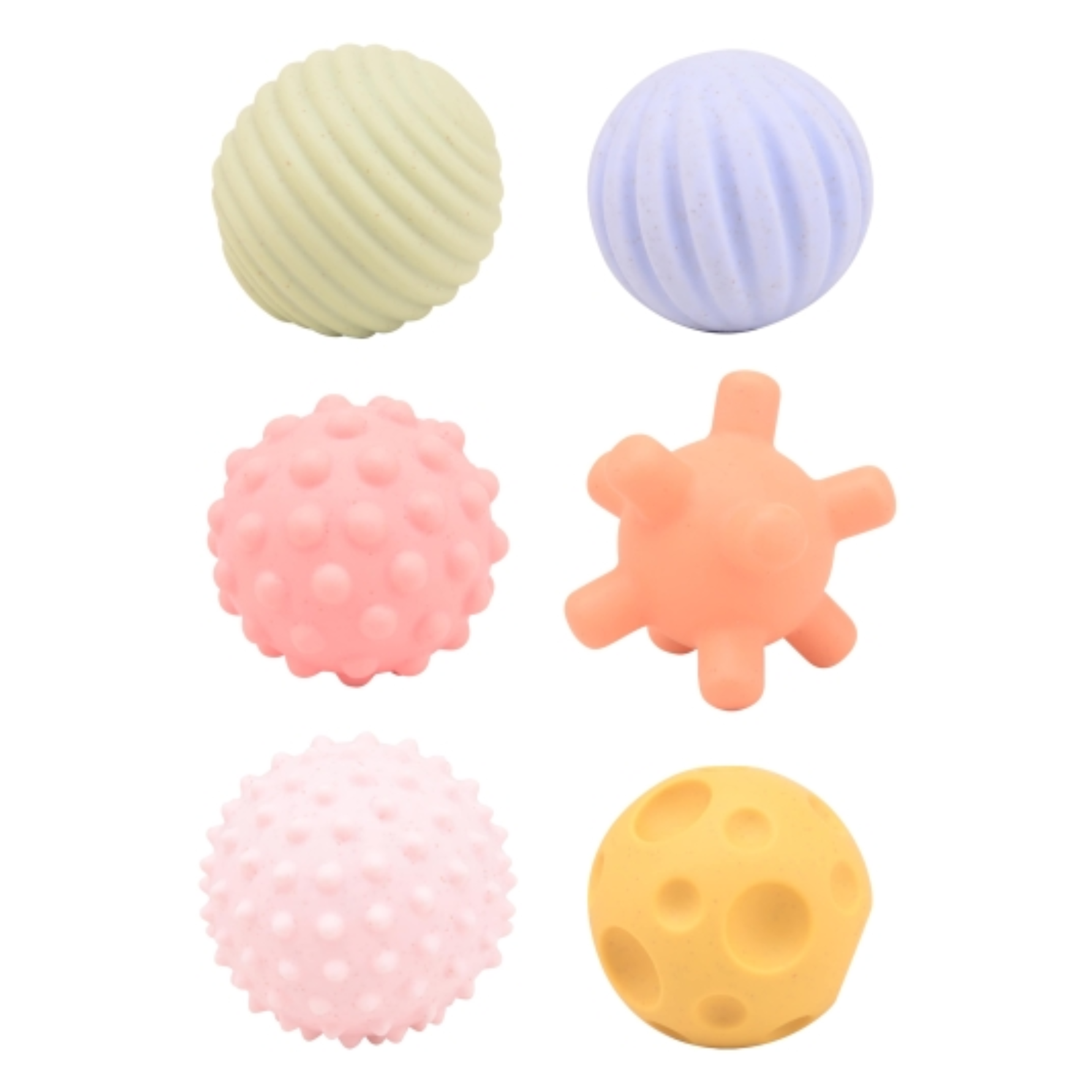 Een set van 6 sensorische ballen in onderscheidende en ongebruikelijke vormen en met verschillende oppervlakte texturen en kleuren. Erg leuk om te gooien, vangen, rollen, aan te voelen of op te knabbelen. Voor een baby zijn de ballen gemakkelijk vast te grijpen en kunnen zij aan alle verschillende vormen voelen.