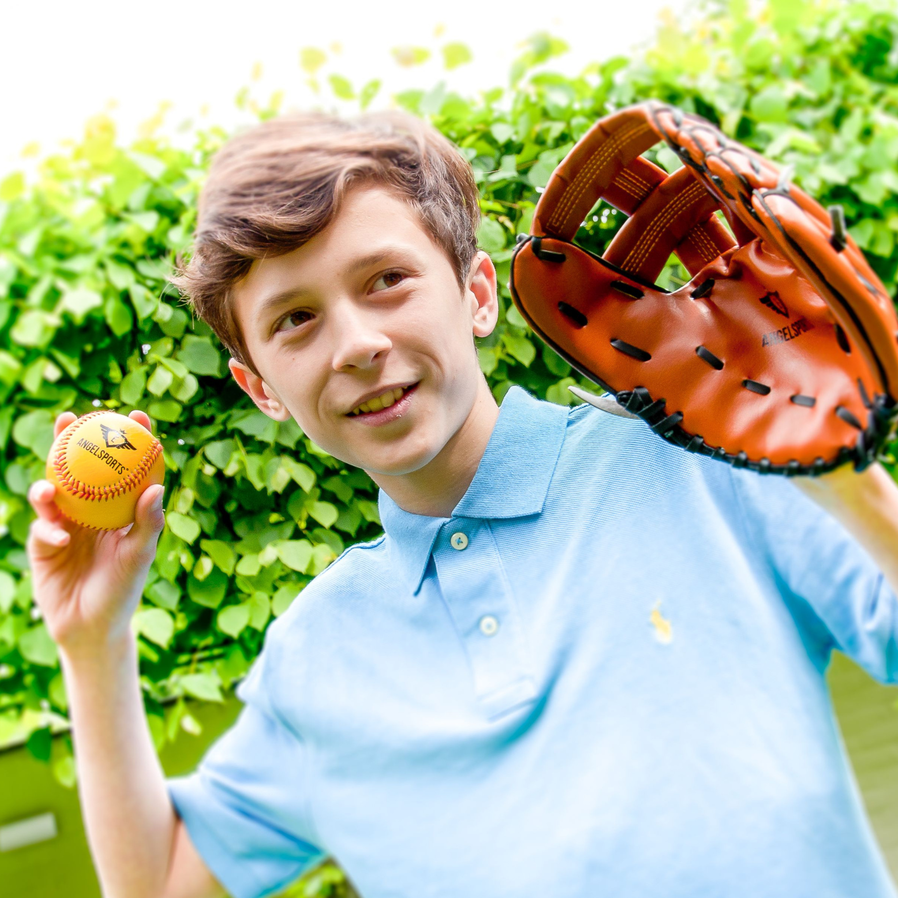 Een Honkbalset, bestaande uit een 9 inch kunstleder honkbalhandschoen voor rechtshandigen en een gele PVC bal. Perfect voor kinderen op de BSO om honkbal te ontdekken.