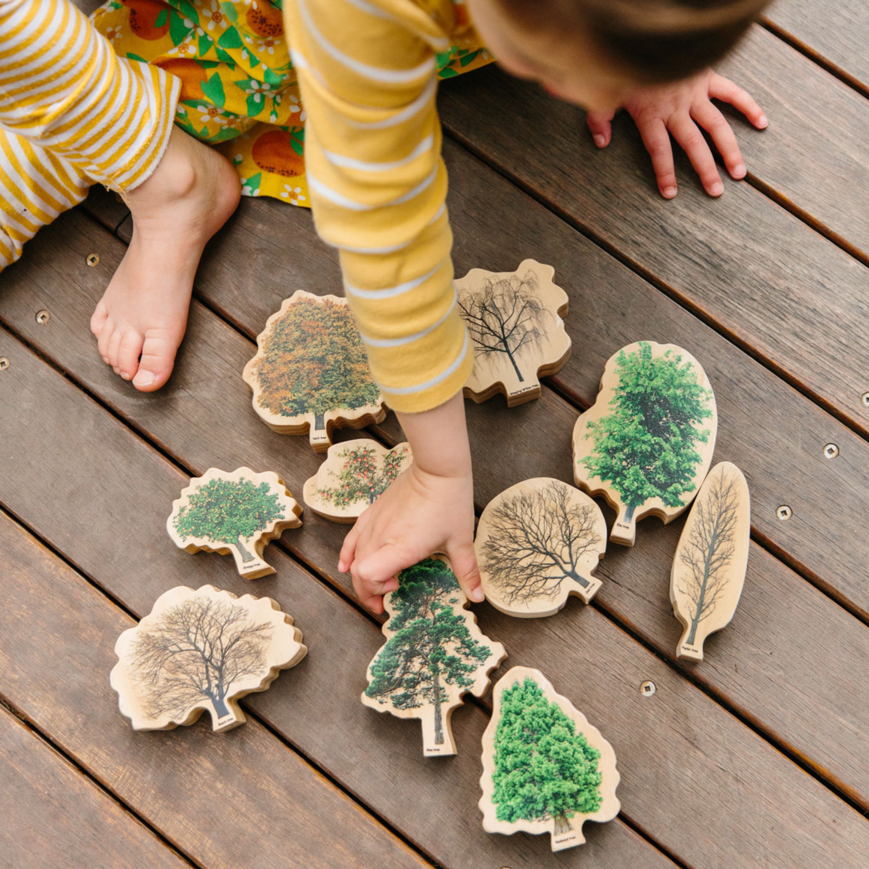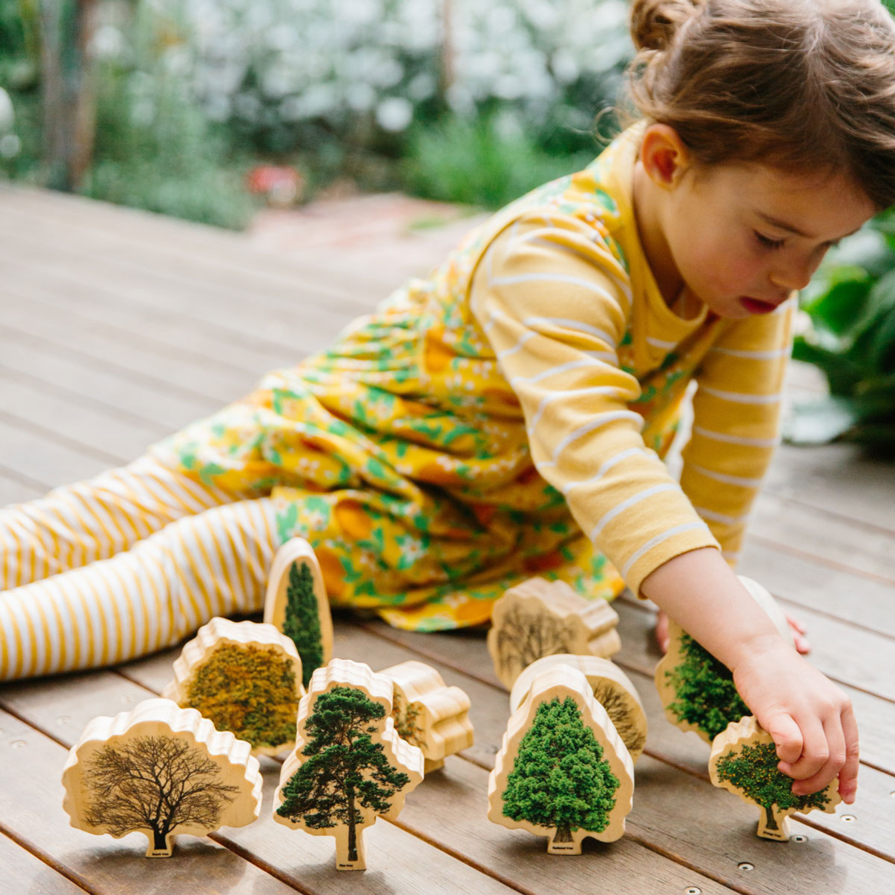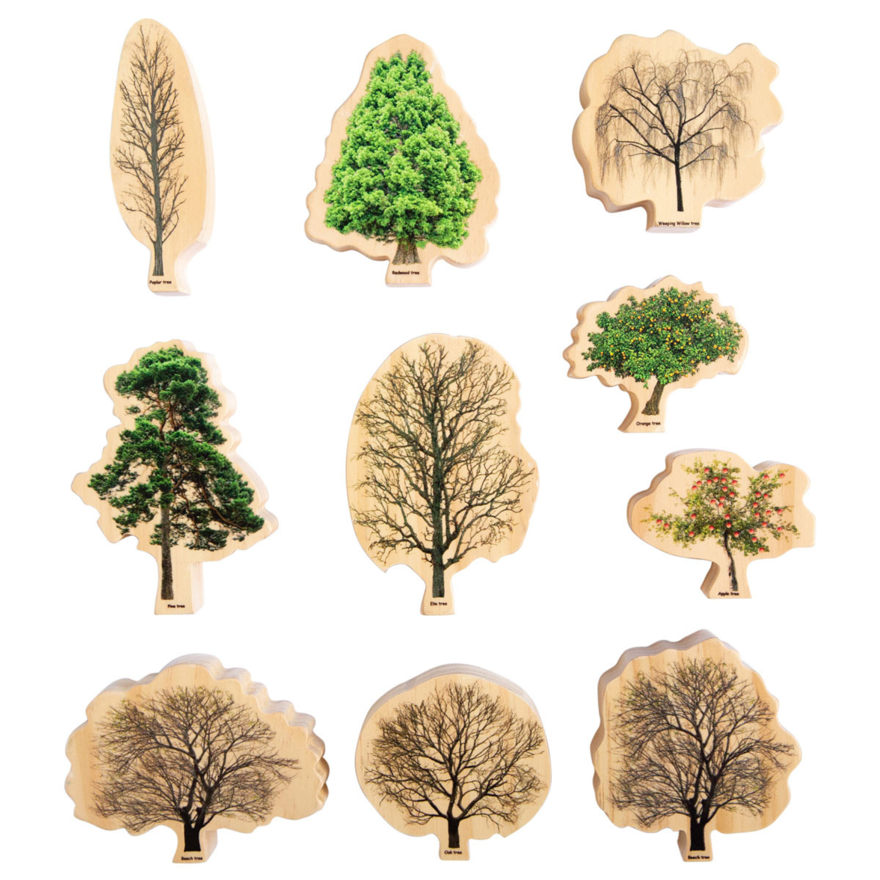 Deze set van 10 bomen bevat een mix van bladverliezende en groenblijvende bomen waaronder een beuk, eik, iep, appel, sinaasappel, den, populier, esdoorn, sequoia en treurwilg.