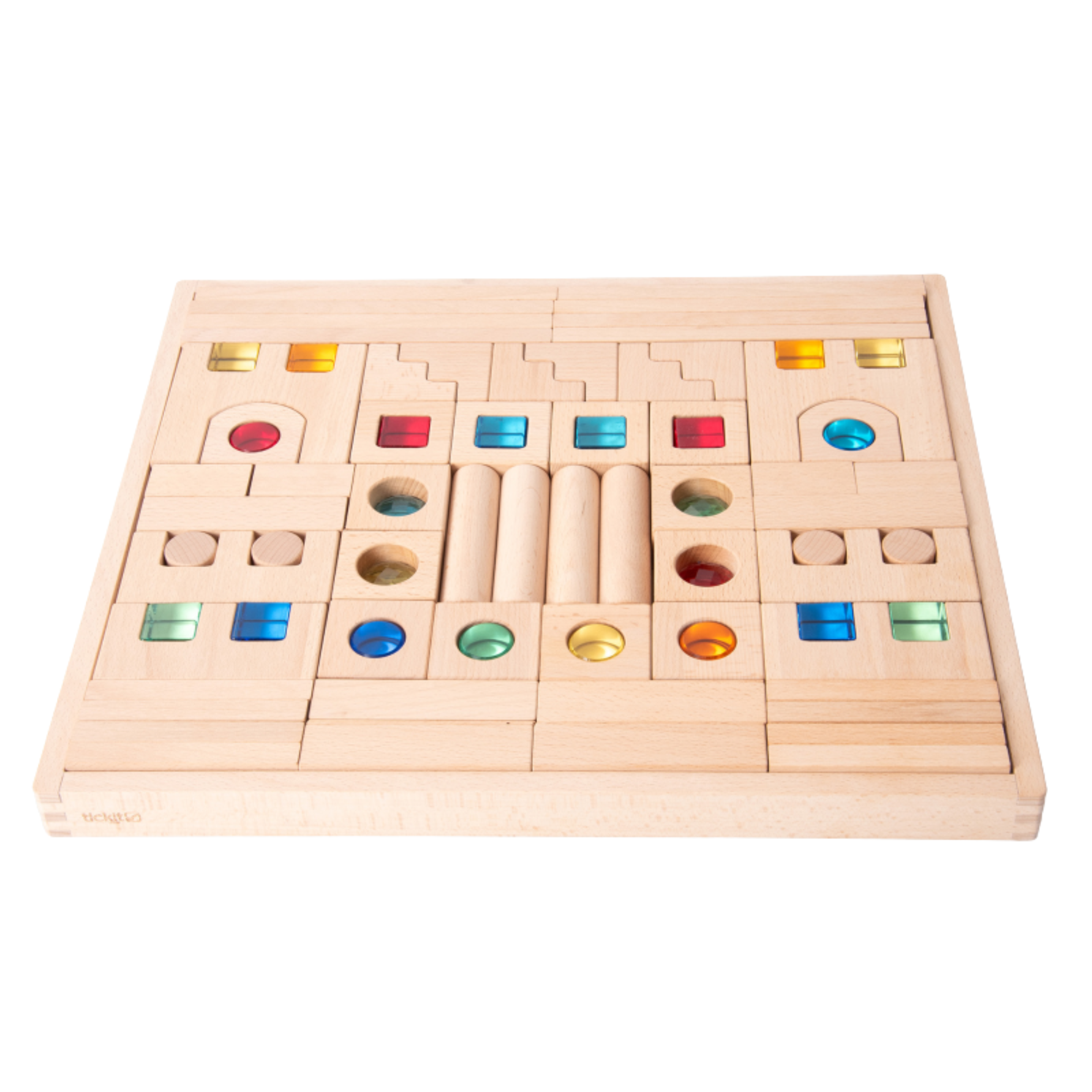 60 beukenhouten blokken, 12 transparante blokken, 6 ronde transparante blokken, 4 caleidoscoopblokken