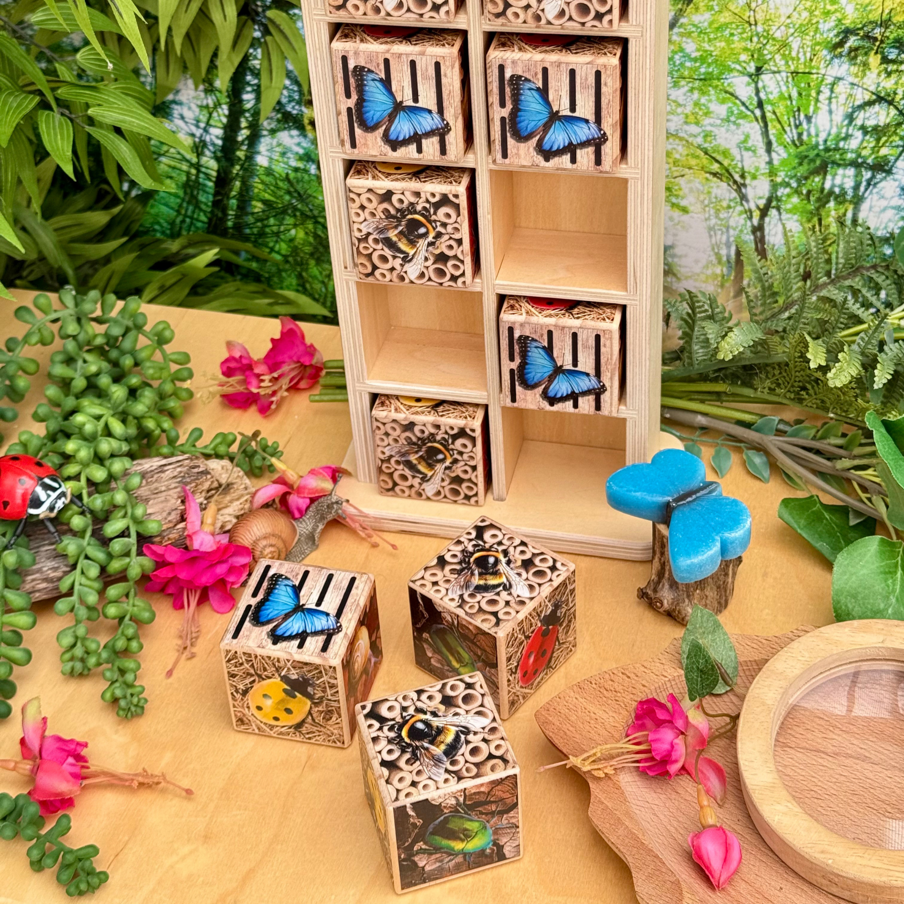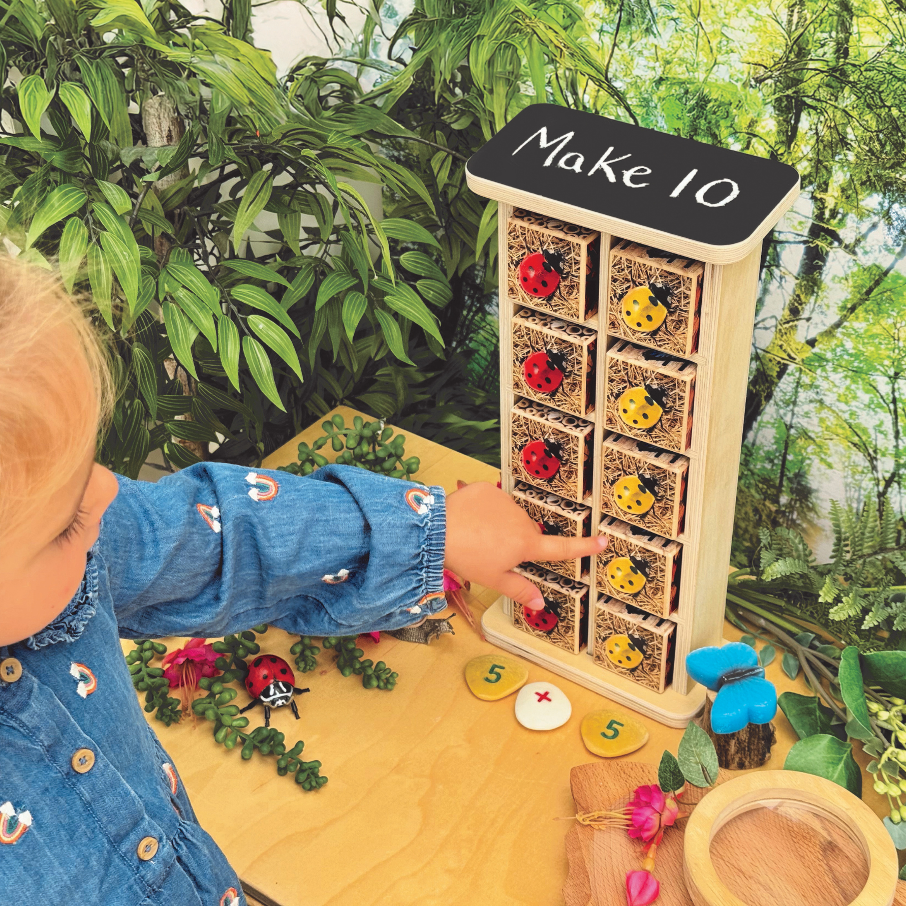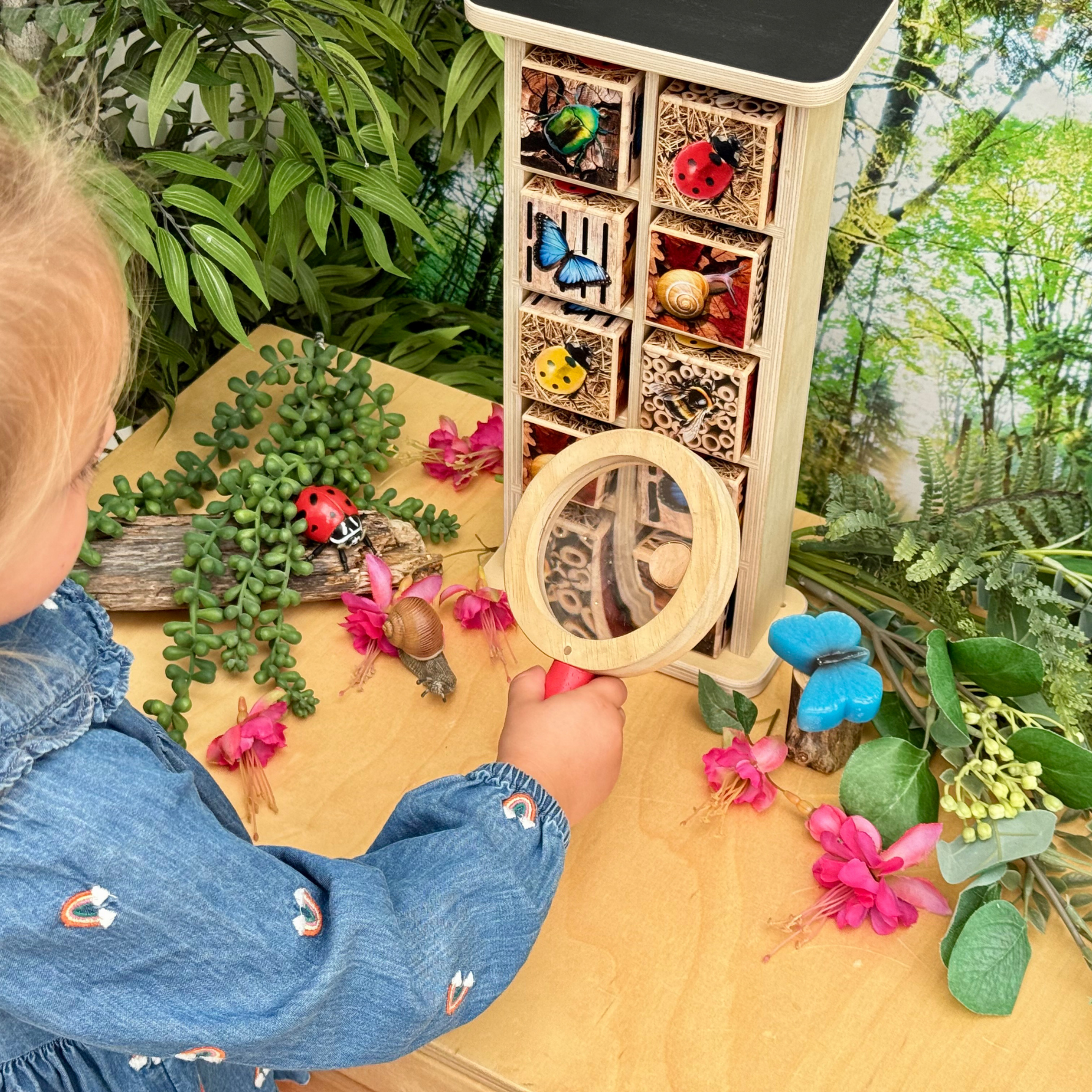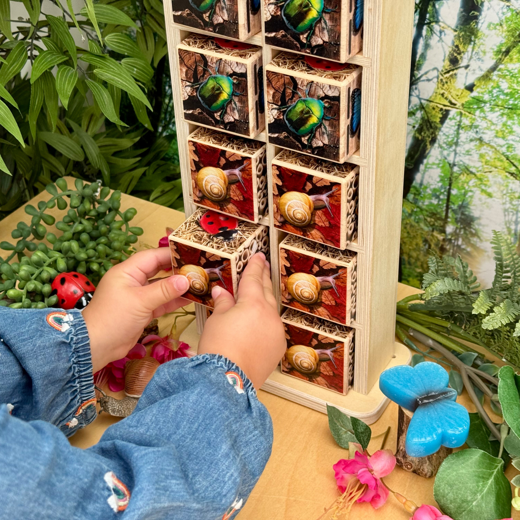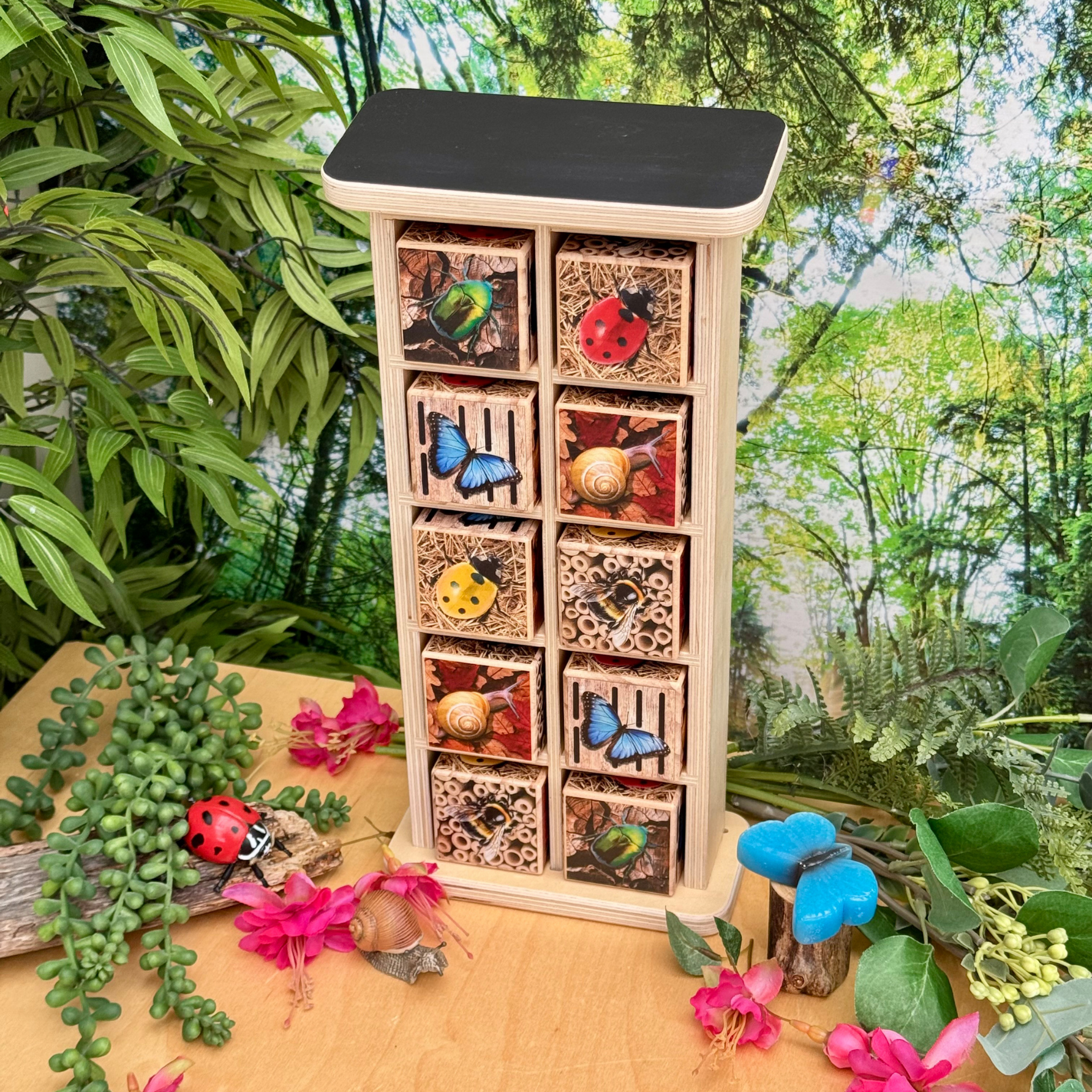 Laat kinderen de wondere wereld van insecten ontdekken! Ontdek met dit houten insectenhotel welke insecten er zoal zijn. Op deze manier kunnen er diverse spelletjes gespeeld worden, sorteer dezelfde dieren bij elkaar of tel hoe veel verschillende er zijn. Een leuke toevoeging is het krijtbordje op het dak van het insectenhotel.