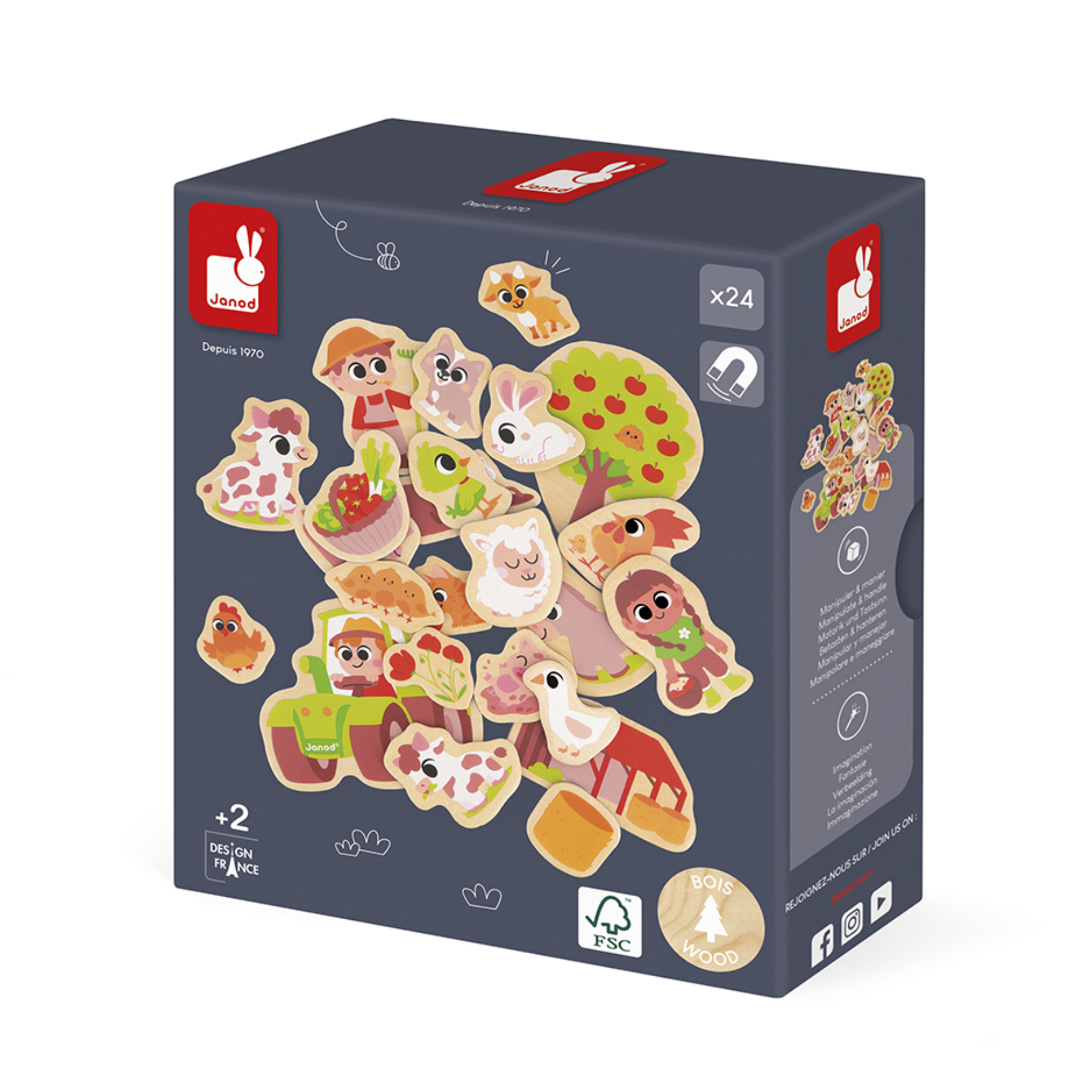 De set bestaat uit 24 magnetisch houten magneten met afbeeldingen over de boerderij zoals dieren en een tractor. De magneten blijven plakken op allerlei magnetische ondergronden, zoals magneetborden en (koel)kasten. De magneet plakkers kunnen ook altijd gemakkelijk worden verwijderd.
