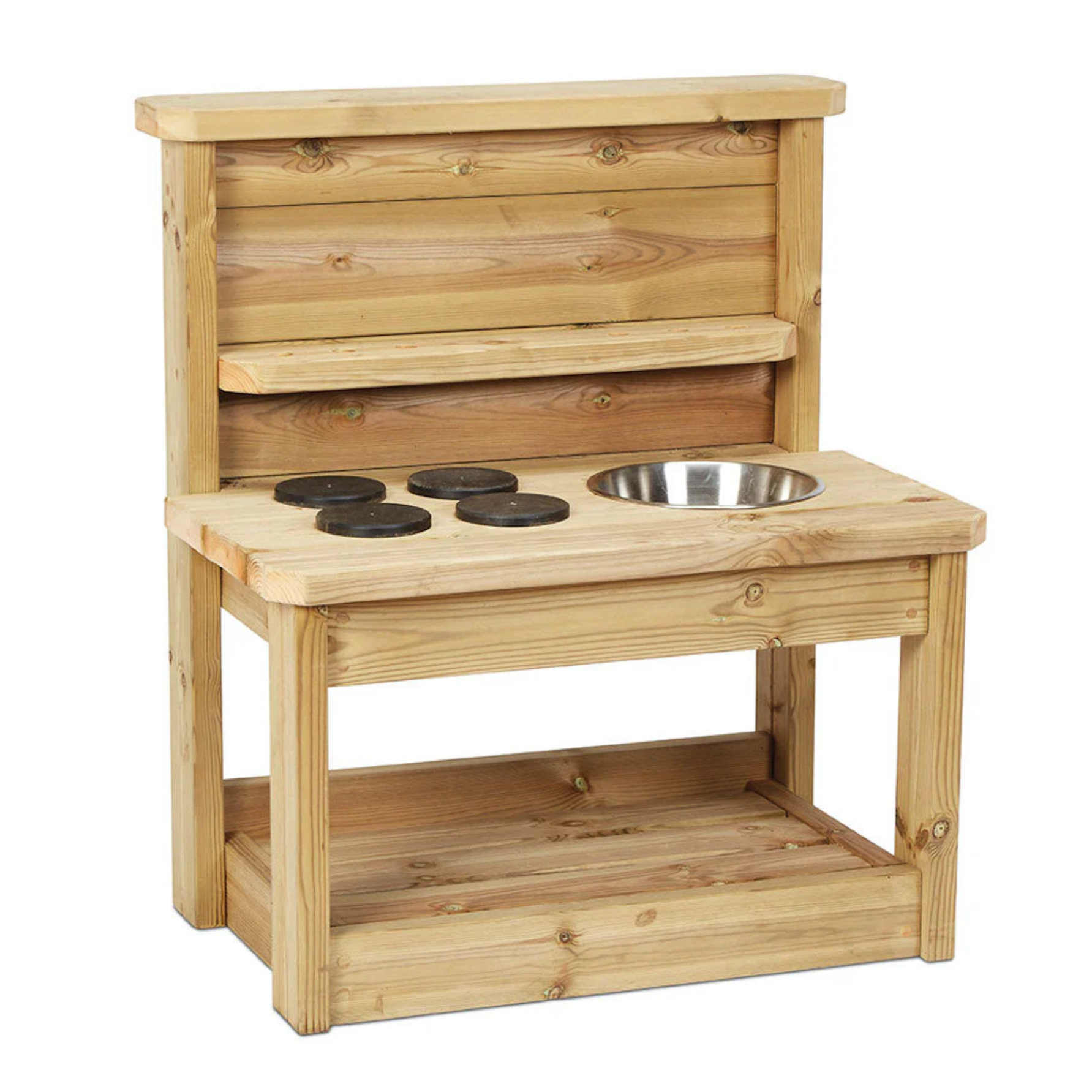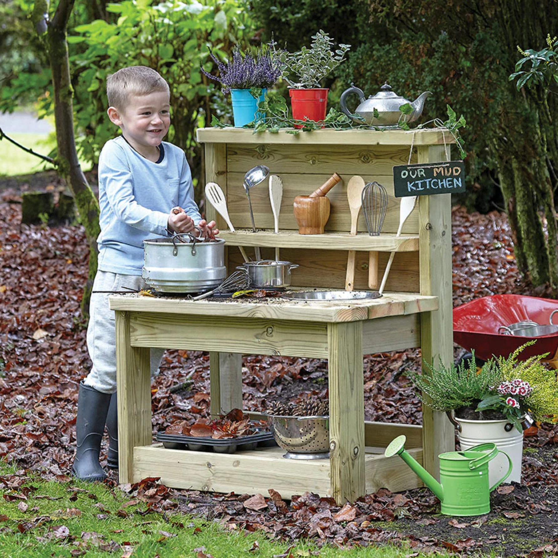 Transformeer je buitenspeelplaats met deze robuuste, veelzijdige modderkeuken. Deze buitenkeuken stimuleert spelenderwijs ontdekken, experimenteren en samenwerken. Kinderen kunnen kokken met zand, water, blaadjes, modder en andere dingen die ze in de natuur vinden.