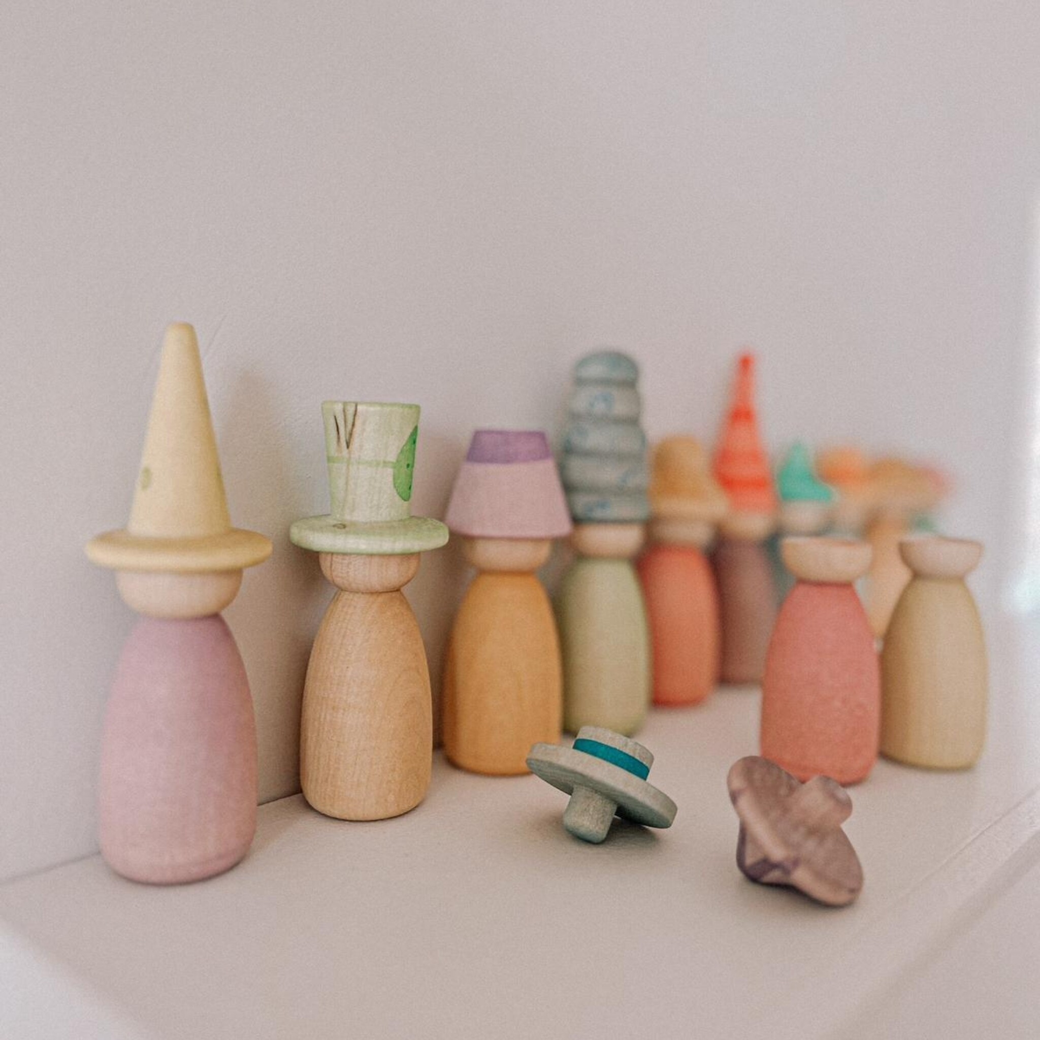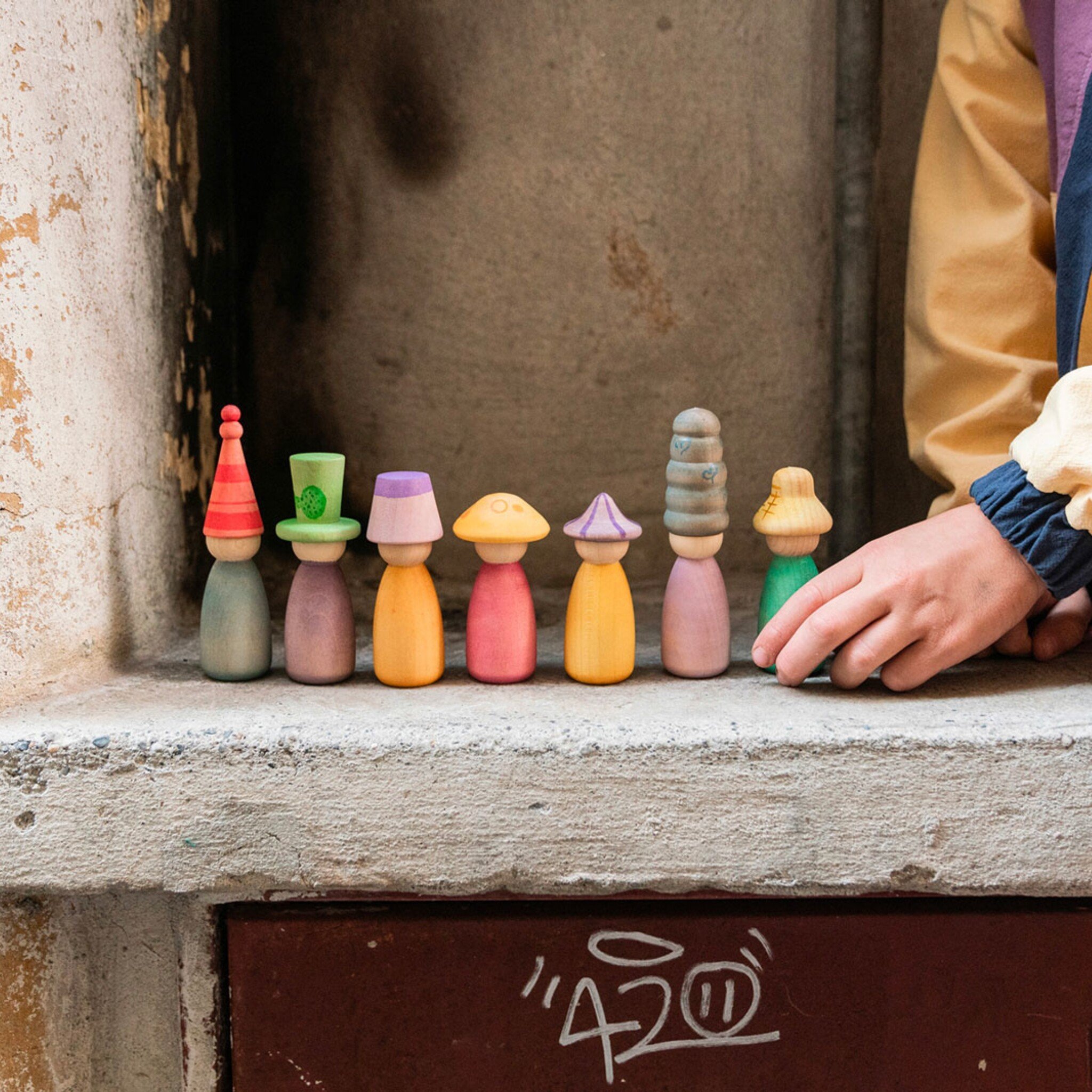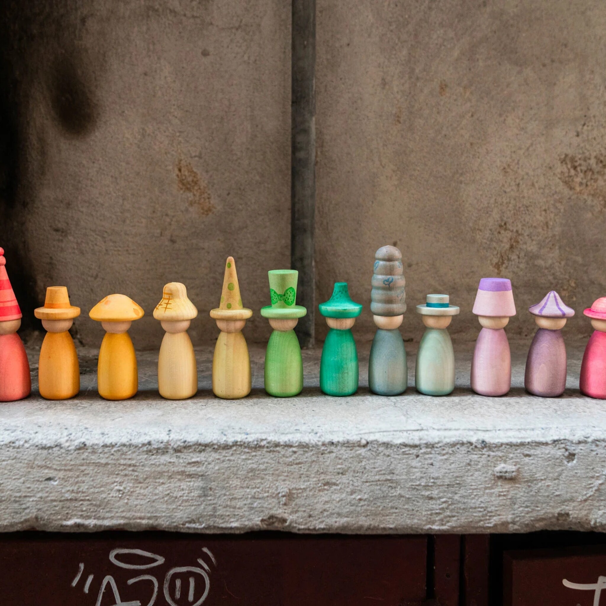 De set bevat 12 Nins met de hand gekleurd in 12 kenmerkende kleuren van de regenboog met verwisselbare hoeden en lichamen om nog meer combinaties van kleurrijke mogelijkheden.