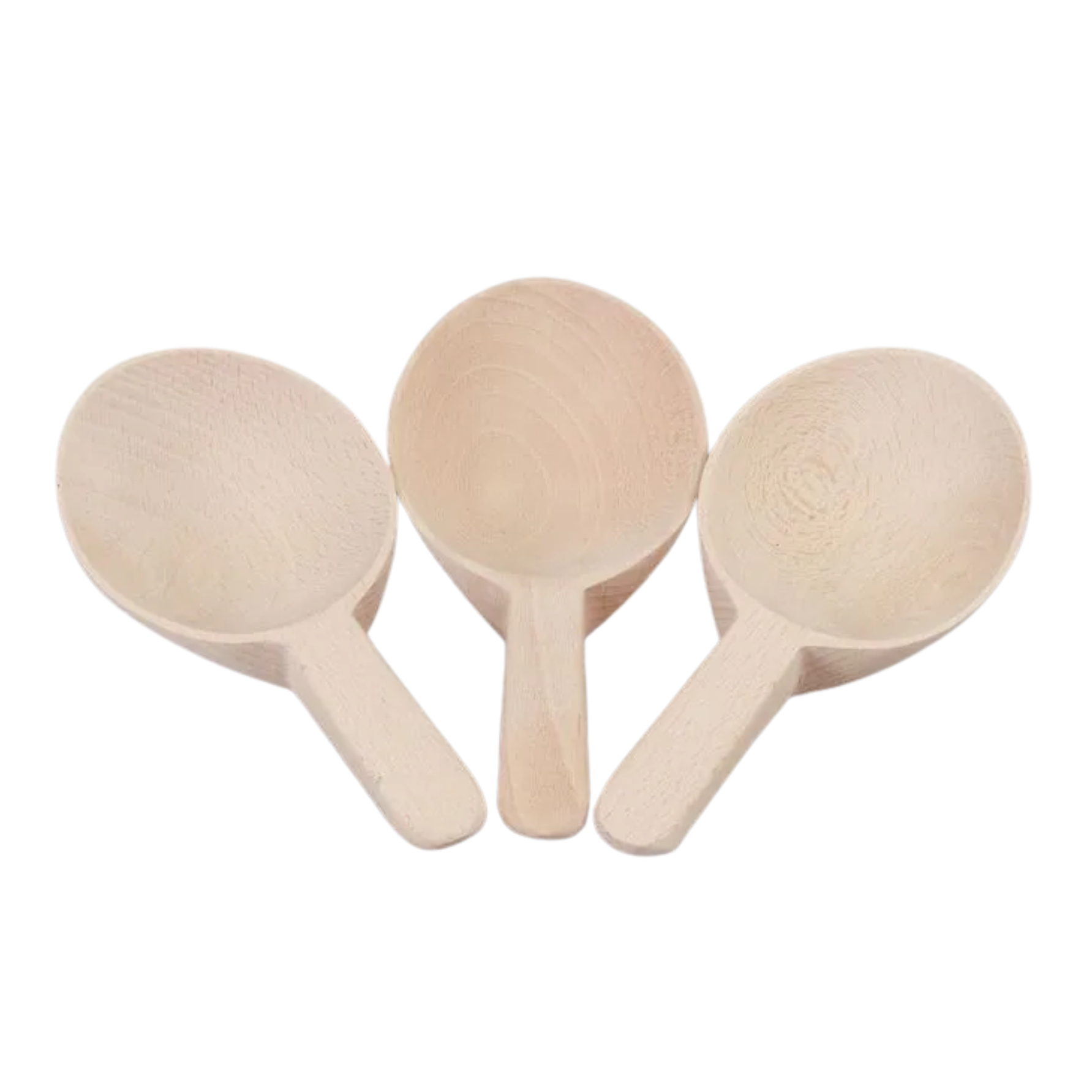 Een prachtige set van 3 houten schepjes waarmee kinderen kunnen mixen, roeren en scheppen om de fijne motoriek onder de knie te krijgen.