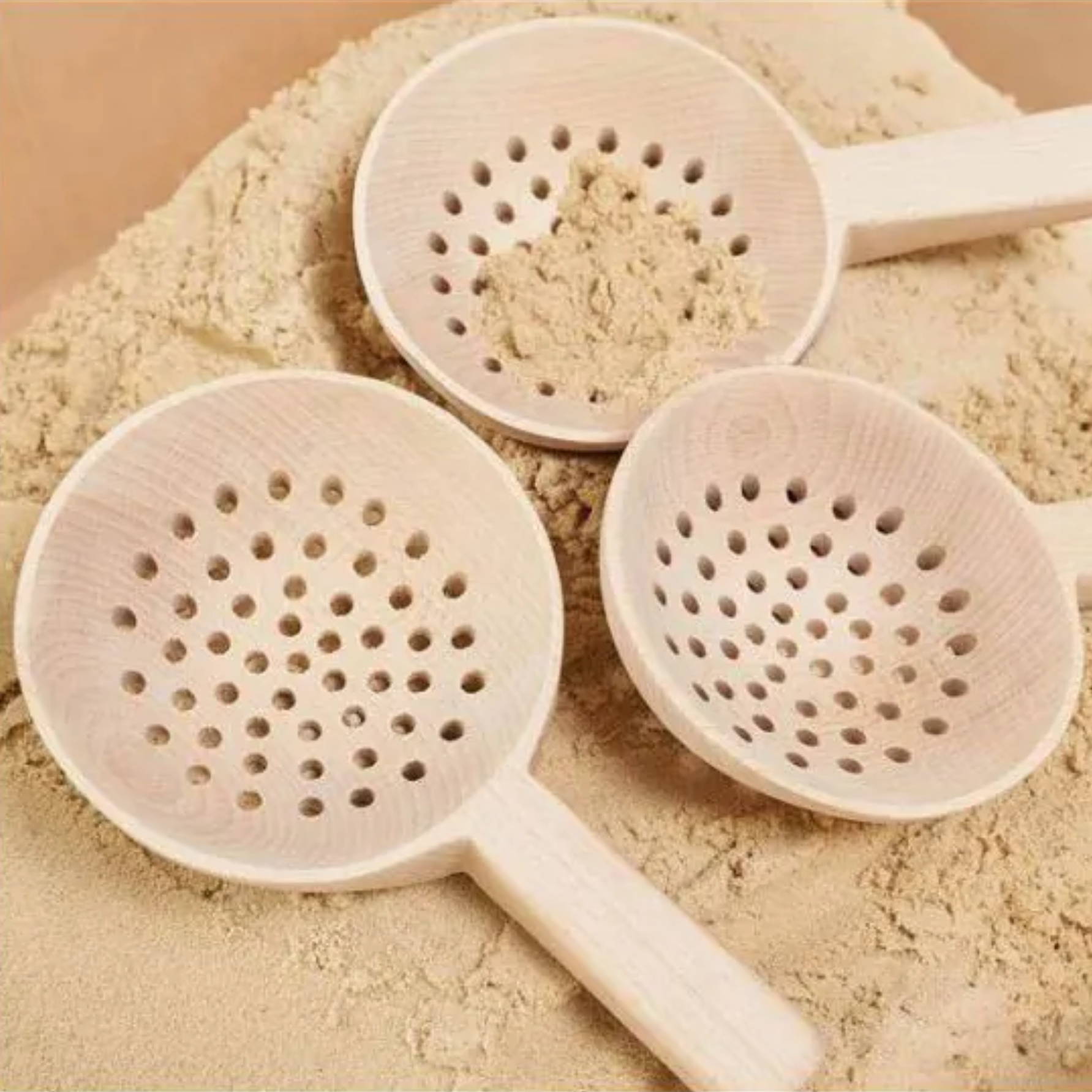 Een prachtige set van 3 houten zeefjes waarmee kinderen kunnen mixen, roeren en scheppen om de fijne motoriek onder de knie te krijgen.