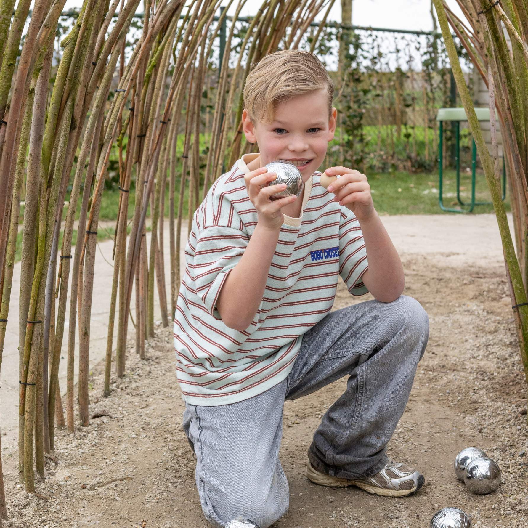 Jeu de Boules set, speciaal voor de BB-leeftijd, met 8 metalen ballen (74 mm, 720 gr), inclusief but, meetlint en spelregels, verpakt in een zwarte tas met rits.