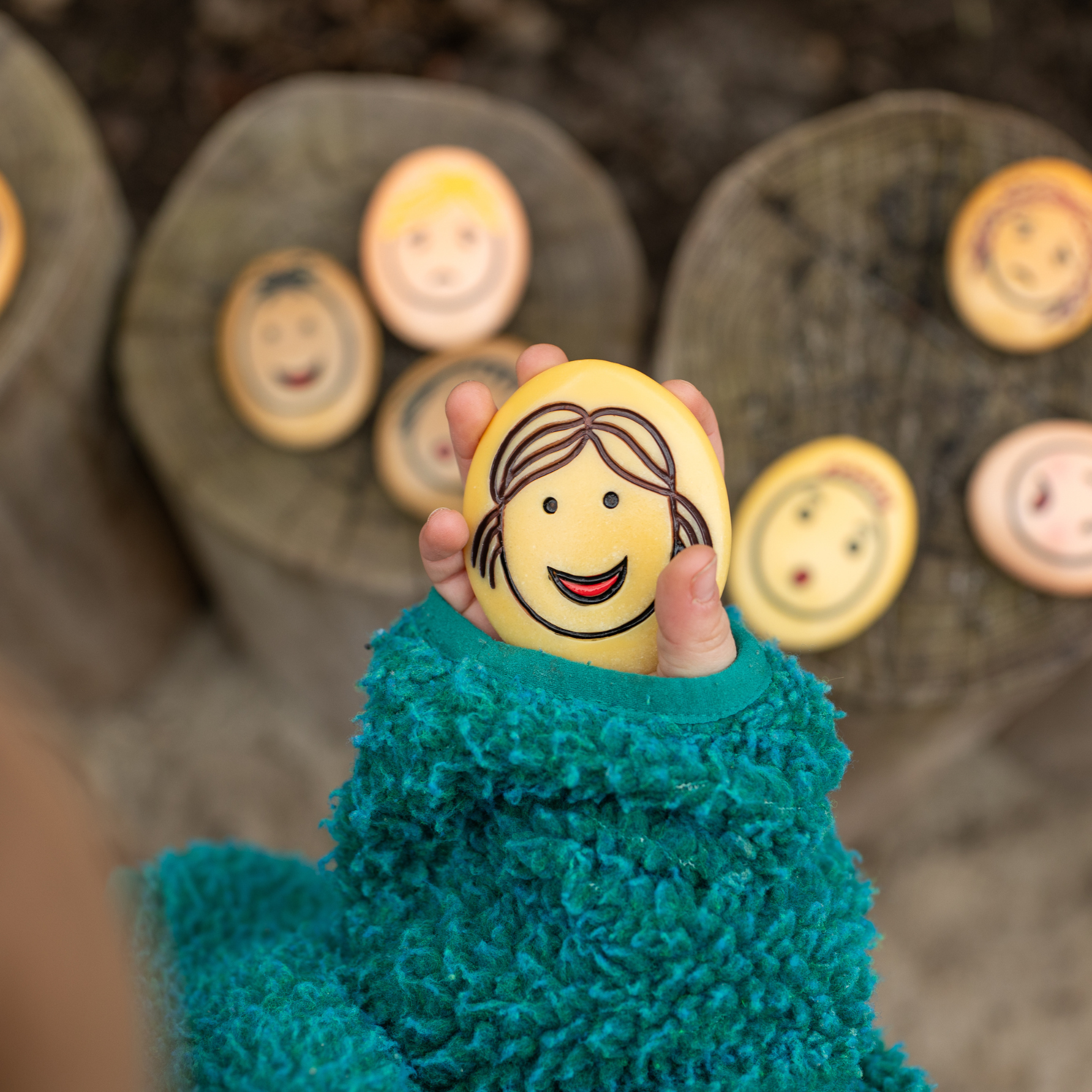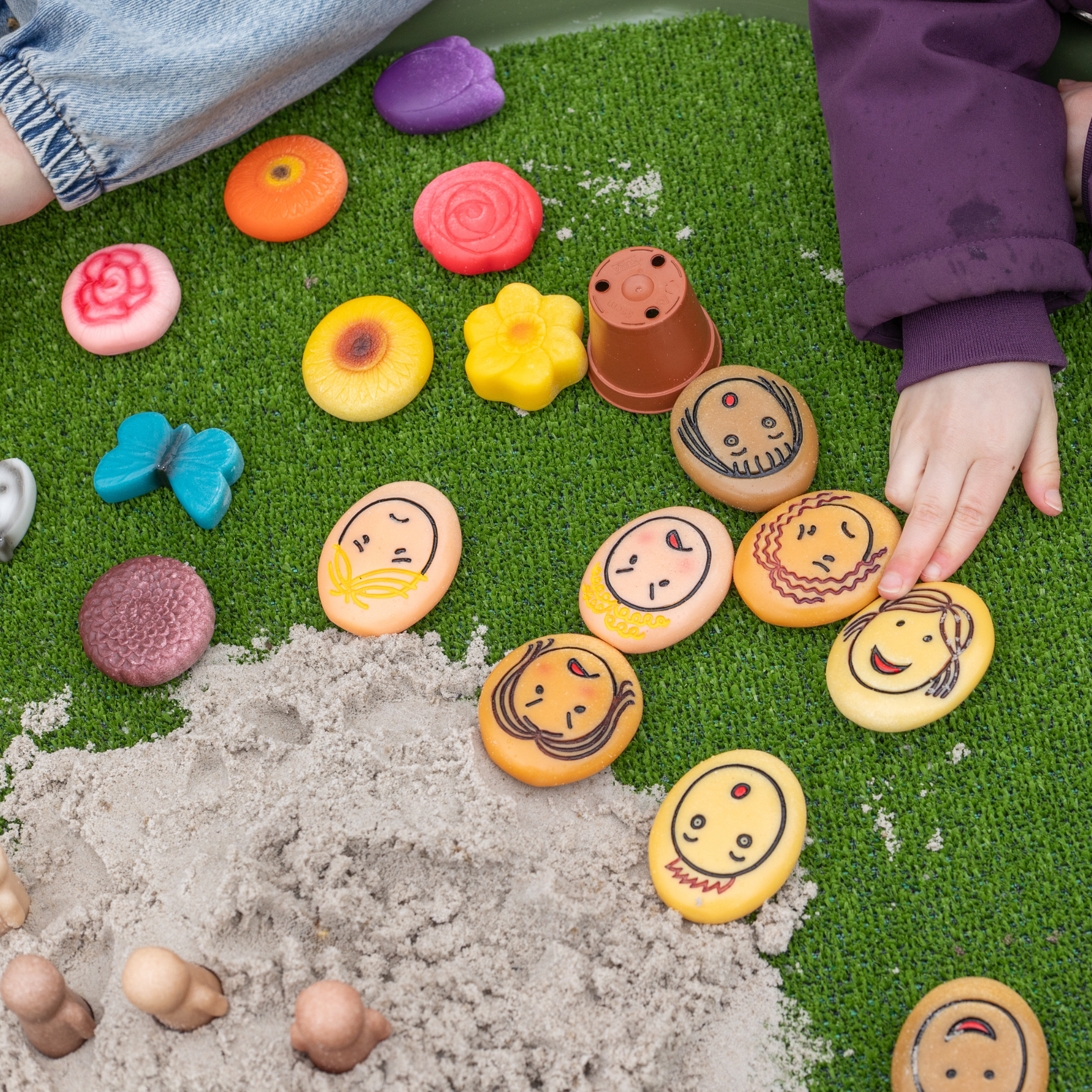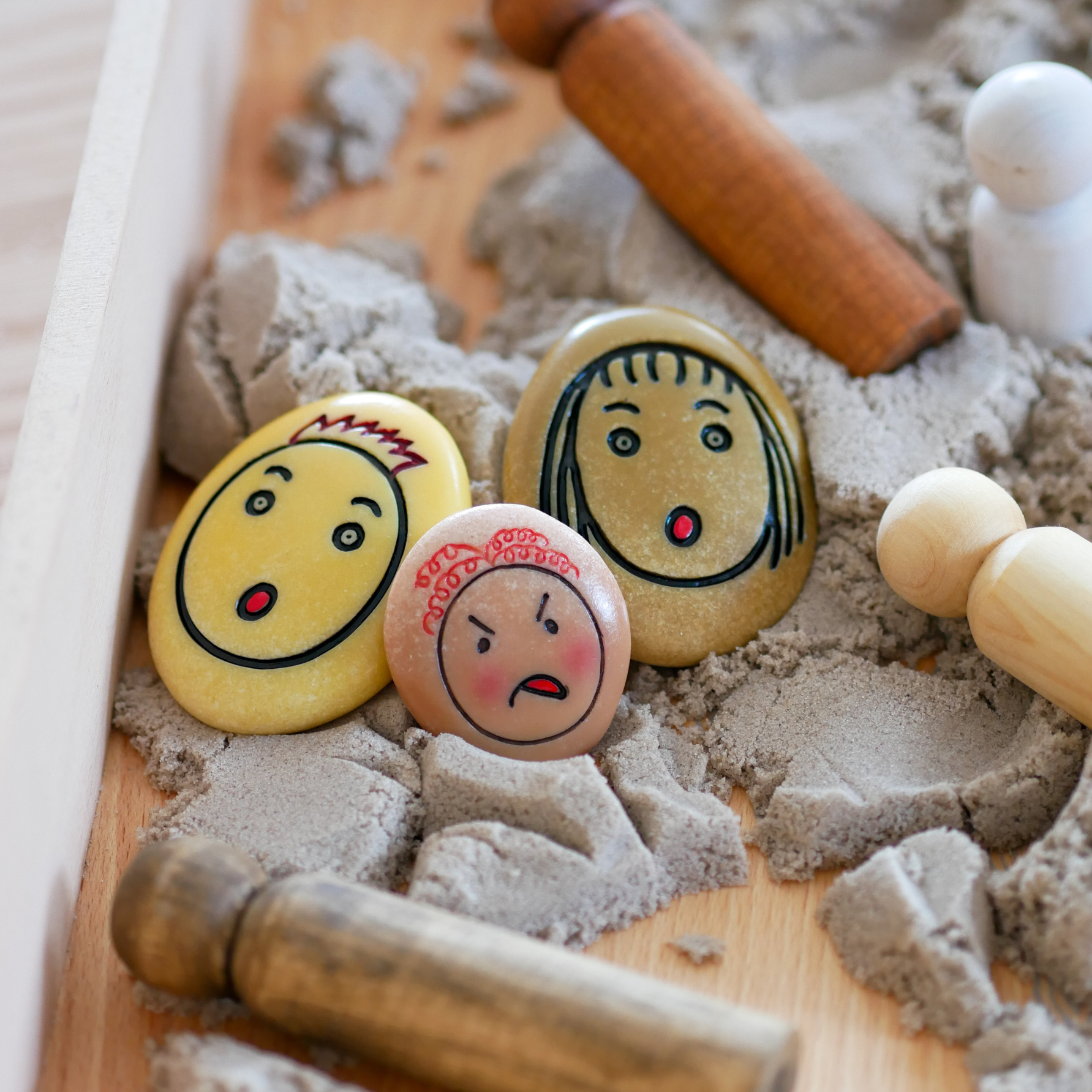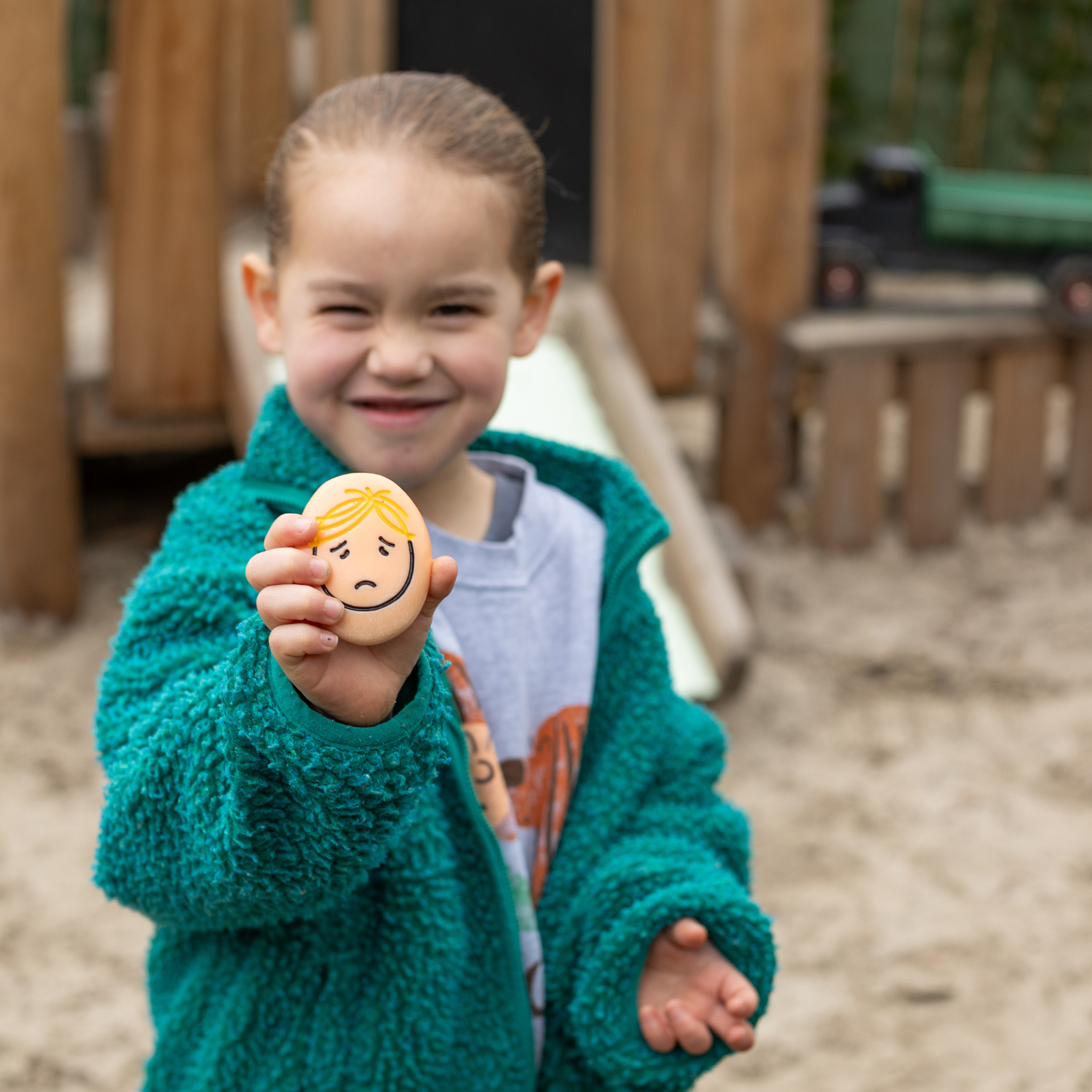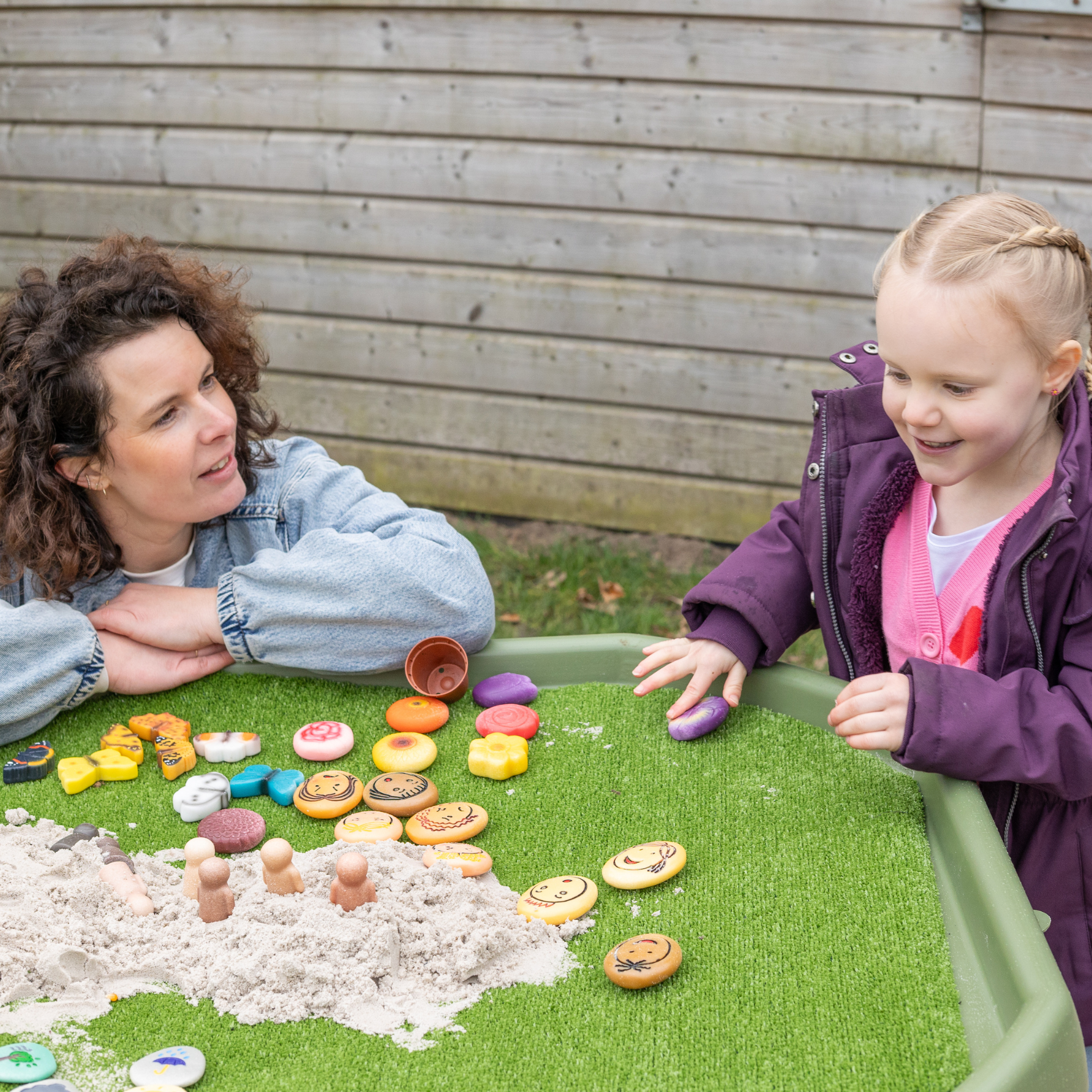 Door met de stenen te spelen ontstaan er natuurlijke momenten voor gesprek. Kinderen vertellen wat ze zien, hoe iemand zich voelt of herkennen emoties bij zichzelf en anderen. Dit maakt het spel waardevol en betekenisvol.