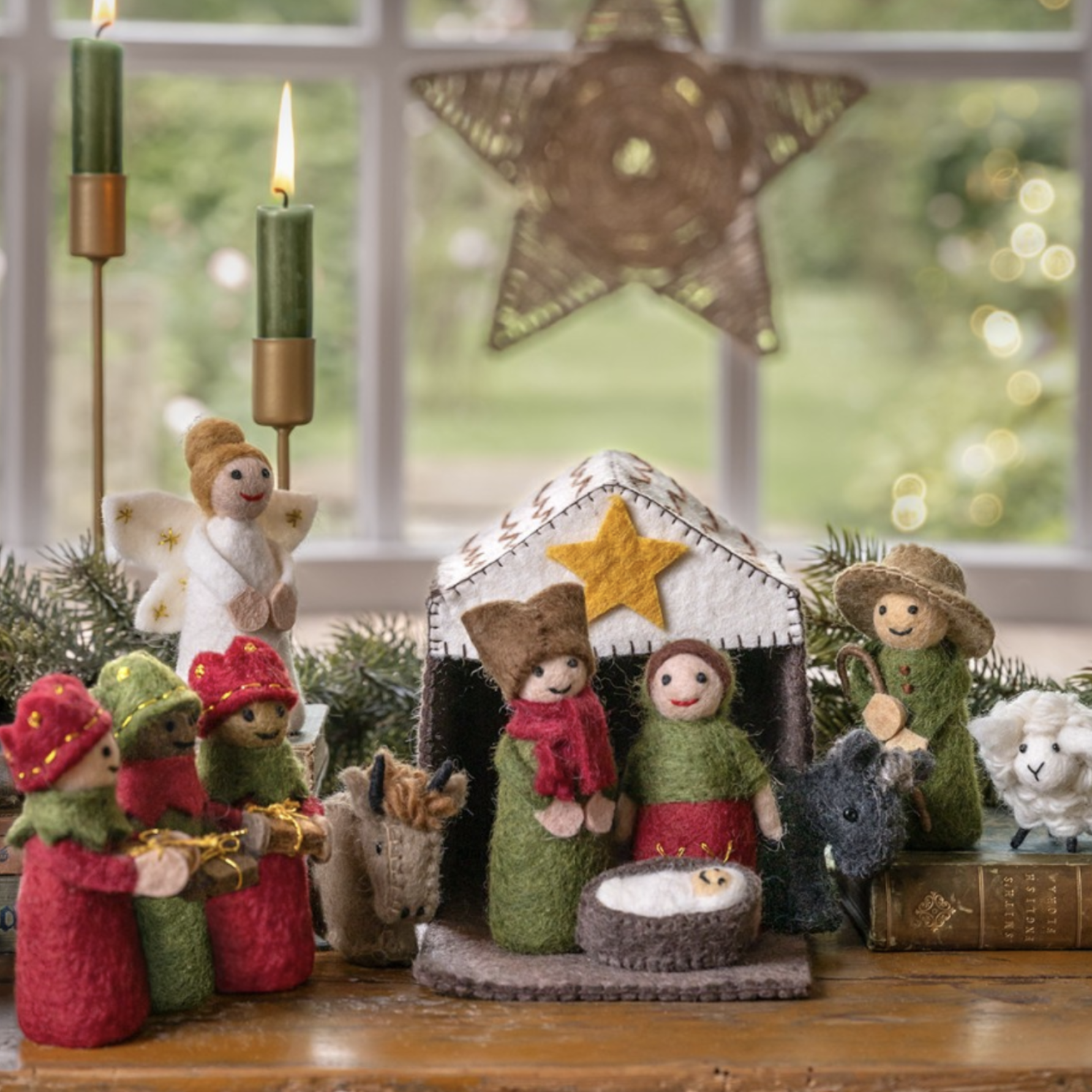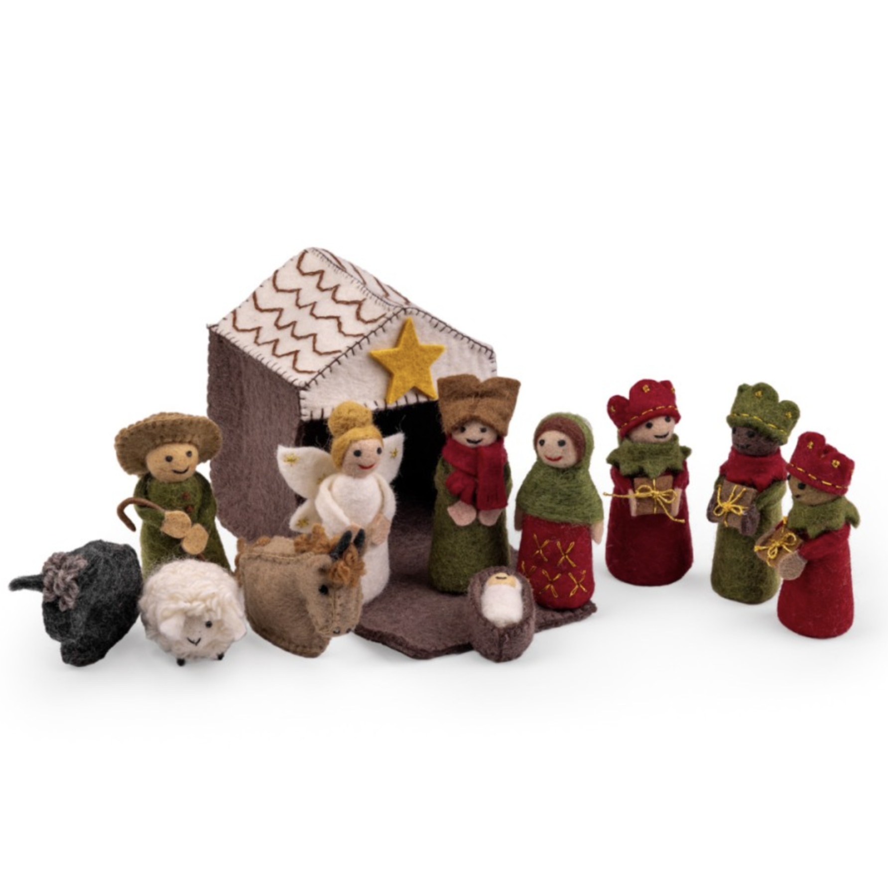 Vilten kerststal met Jezus, Maria, Jozef, de Drie Koningen, een engel, de herder, een os, een ezel en een schaap.