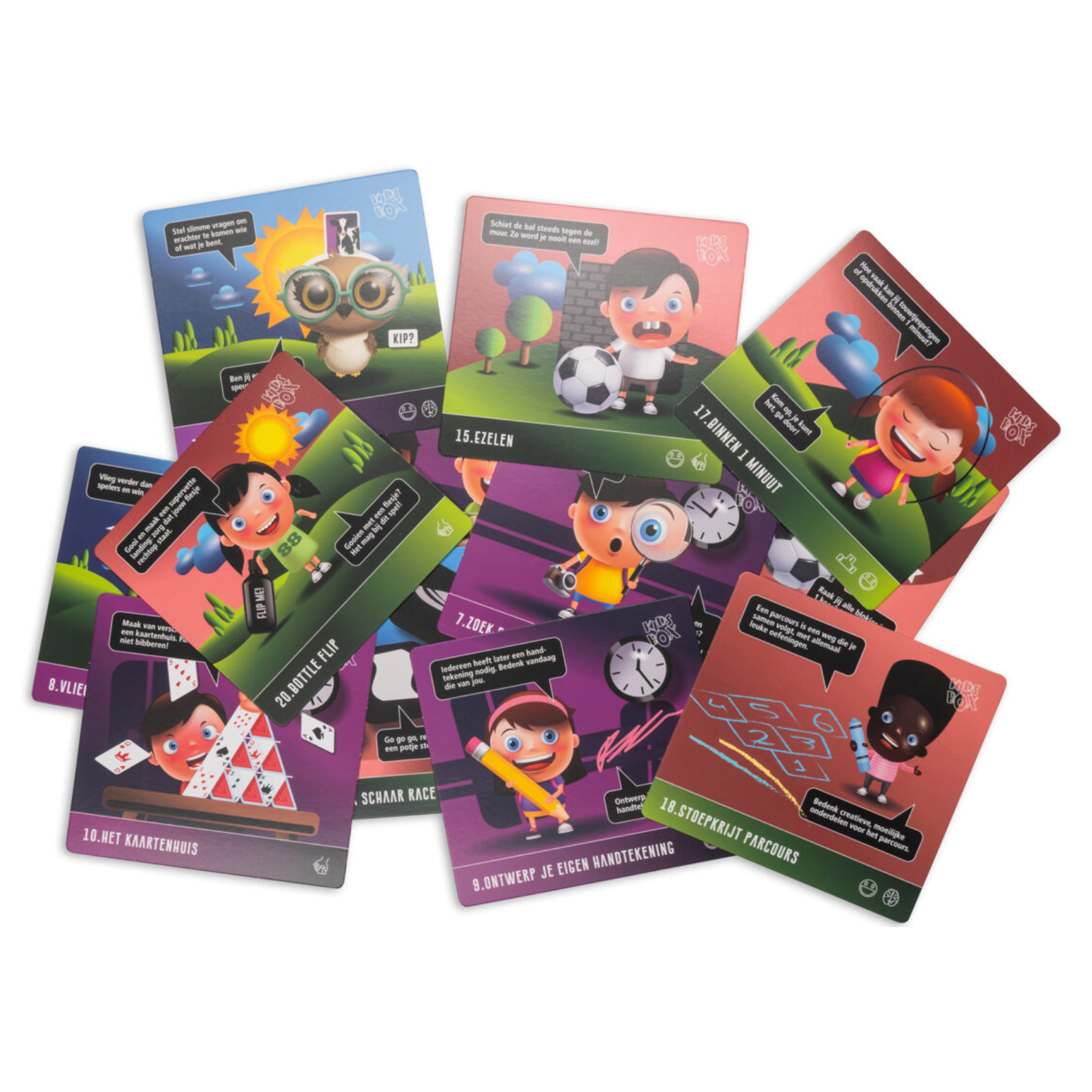 Deze set van Kidsbox Play bevat 2 verschillende doosjes met opdracht kaarten. Kidsbox Play helpt kinderen binnen de BSO op een laagdrempelige manier meer te bewegen. Op elk kaartje staat een eenvoudige activiteit of opdracht die kinderen zelf uit kunnen voeren. De meeste activiteiten zijn geschikt voor 2 tot 8 kinderen.