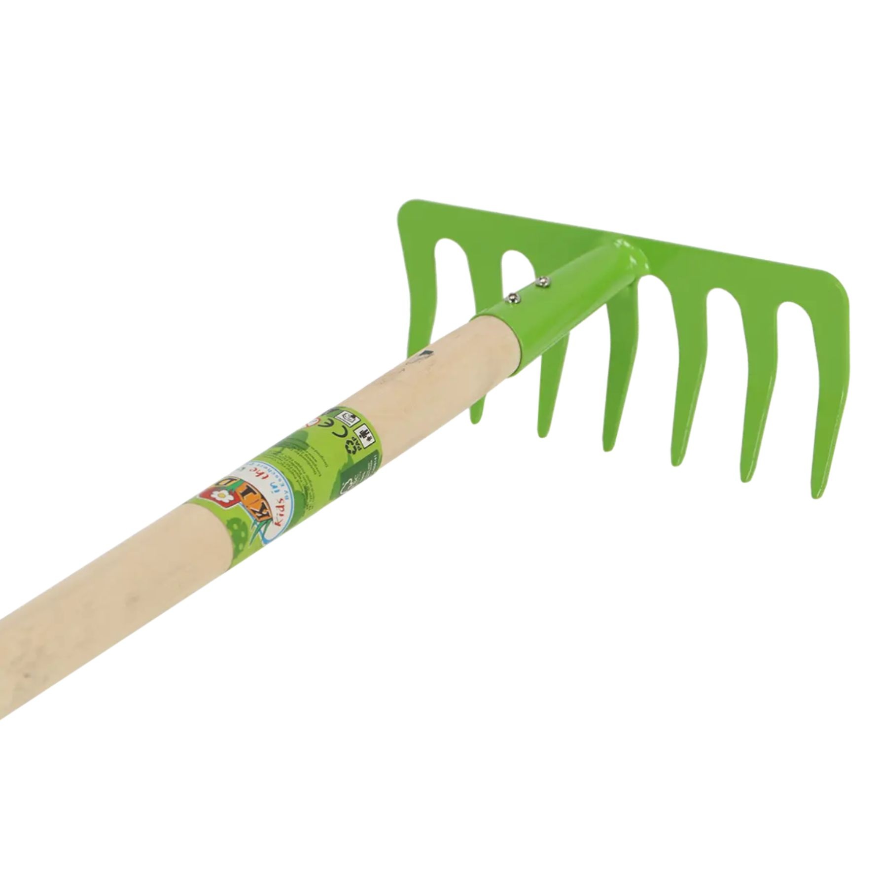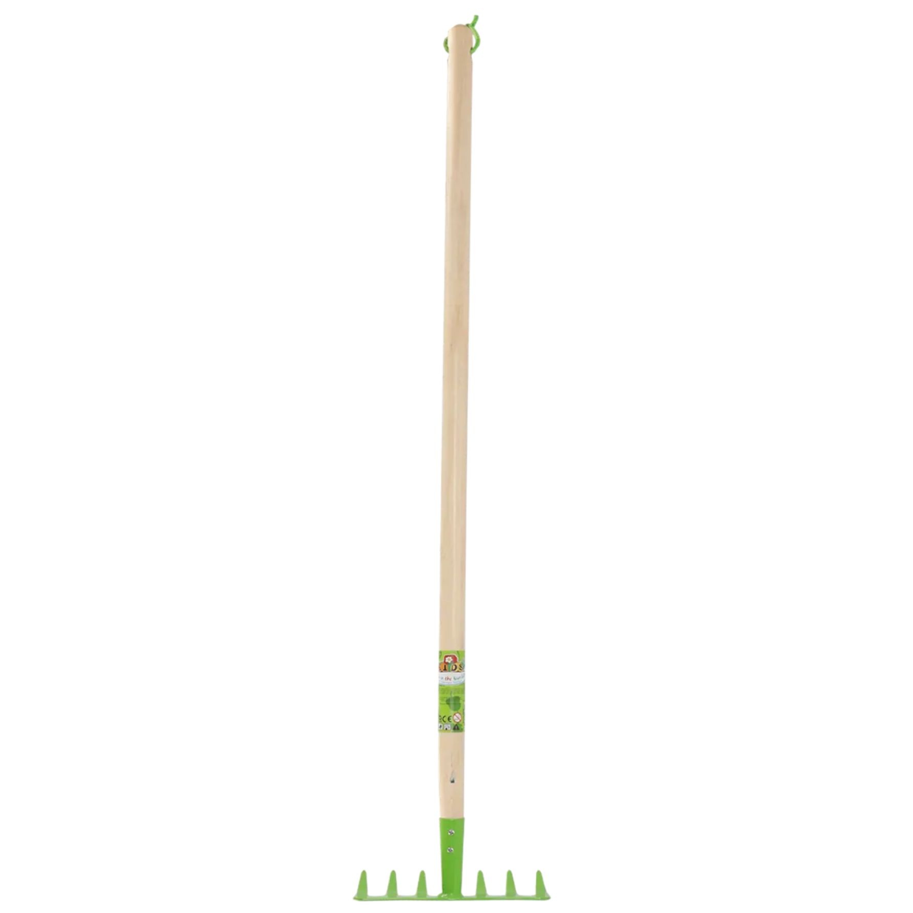 Maak het helpen in de (moes)tuin op school, de kinderopvang of BSO nog leuker met deze speciale kinderhark. Deze groene metalen hark met houten steel en acht tanden is geschikt om de grond voor te bereiden op het zaaien en het inharken van zaad of bijvoorbeeld gras. Ook uiteraard geschikt voor het losmaken of egaal maken van de grond.