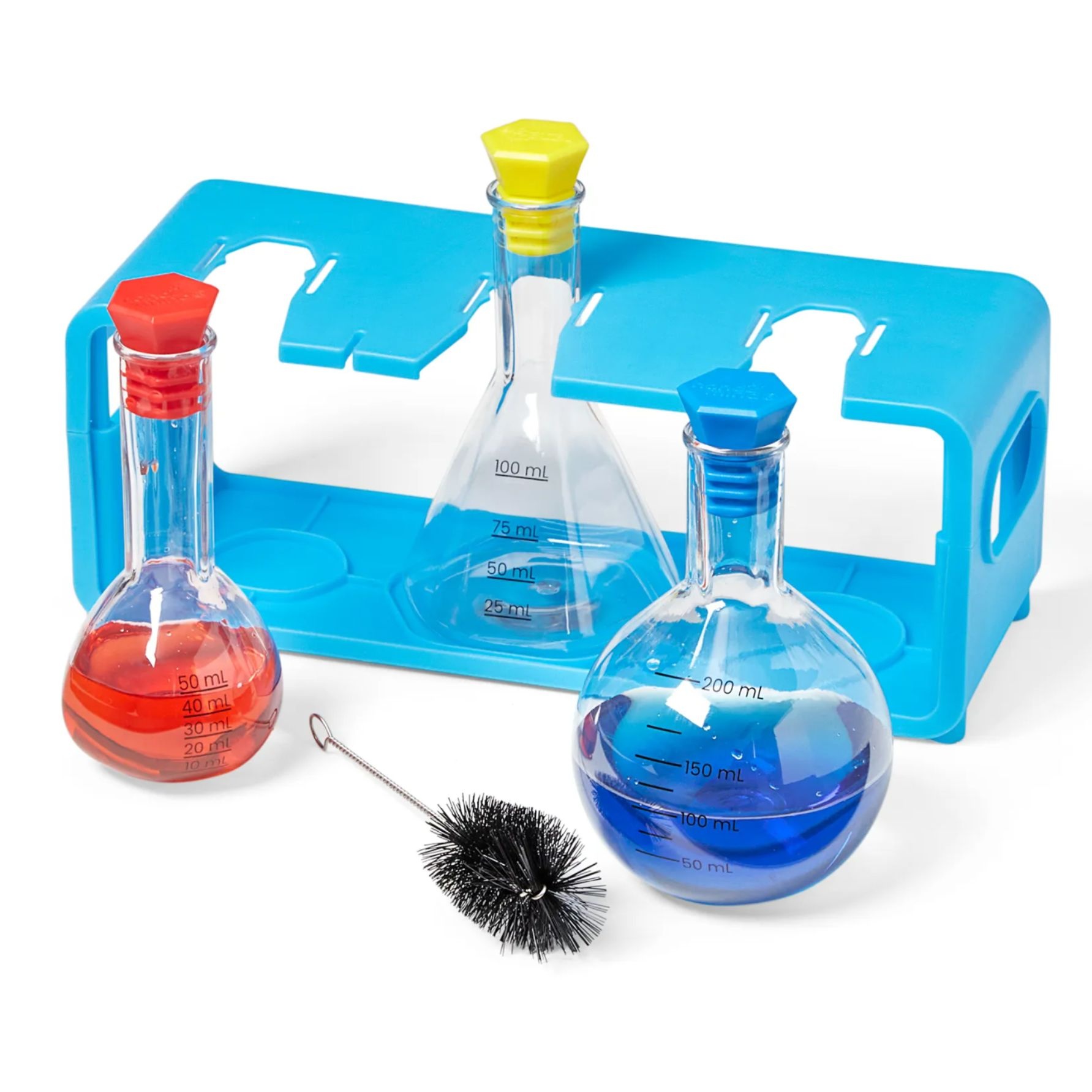 Inclusief 3 flessen, 3 doppen, stevig rek, borstel en 4 experimenten.