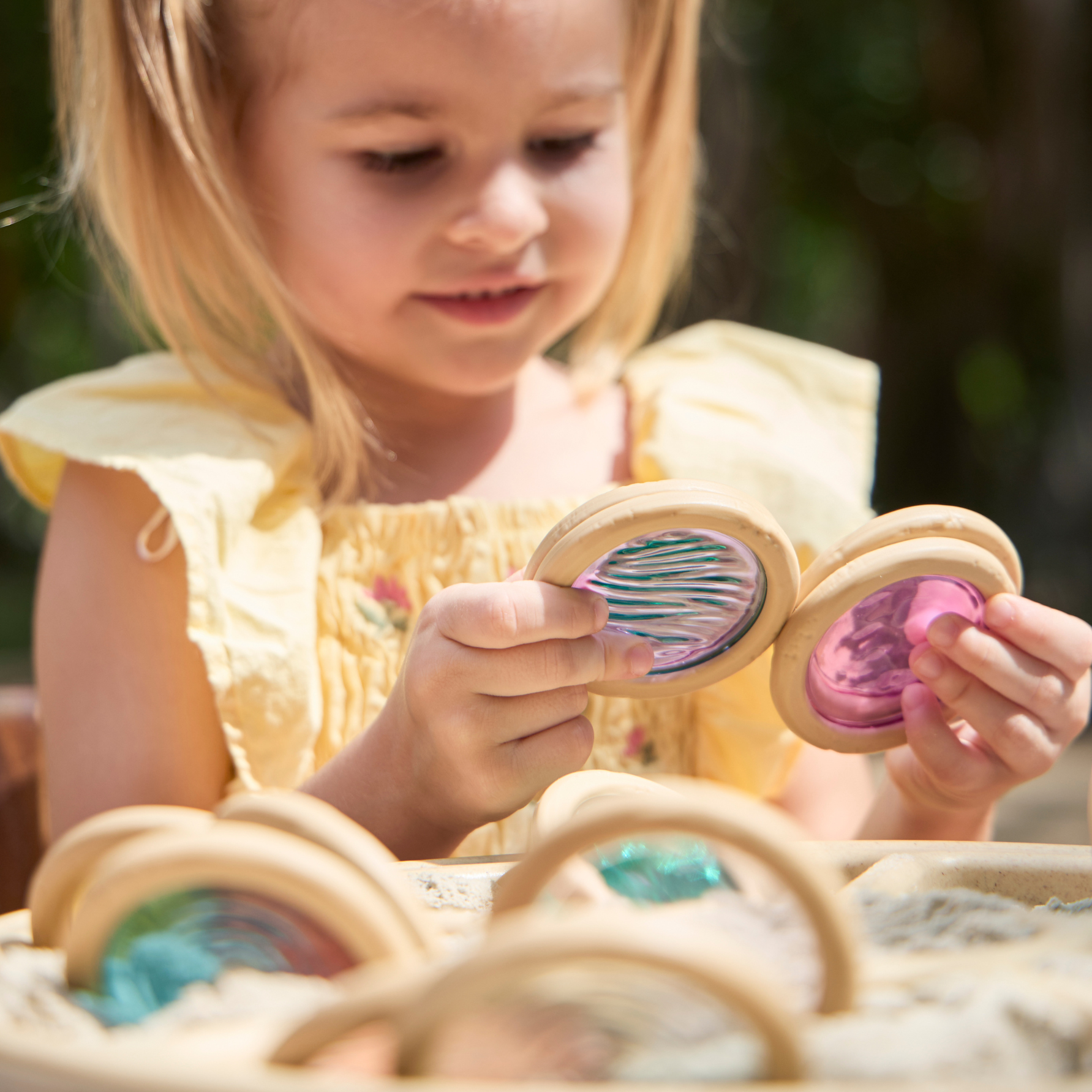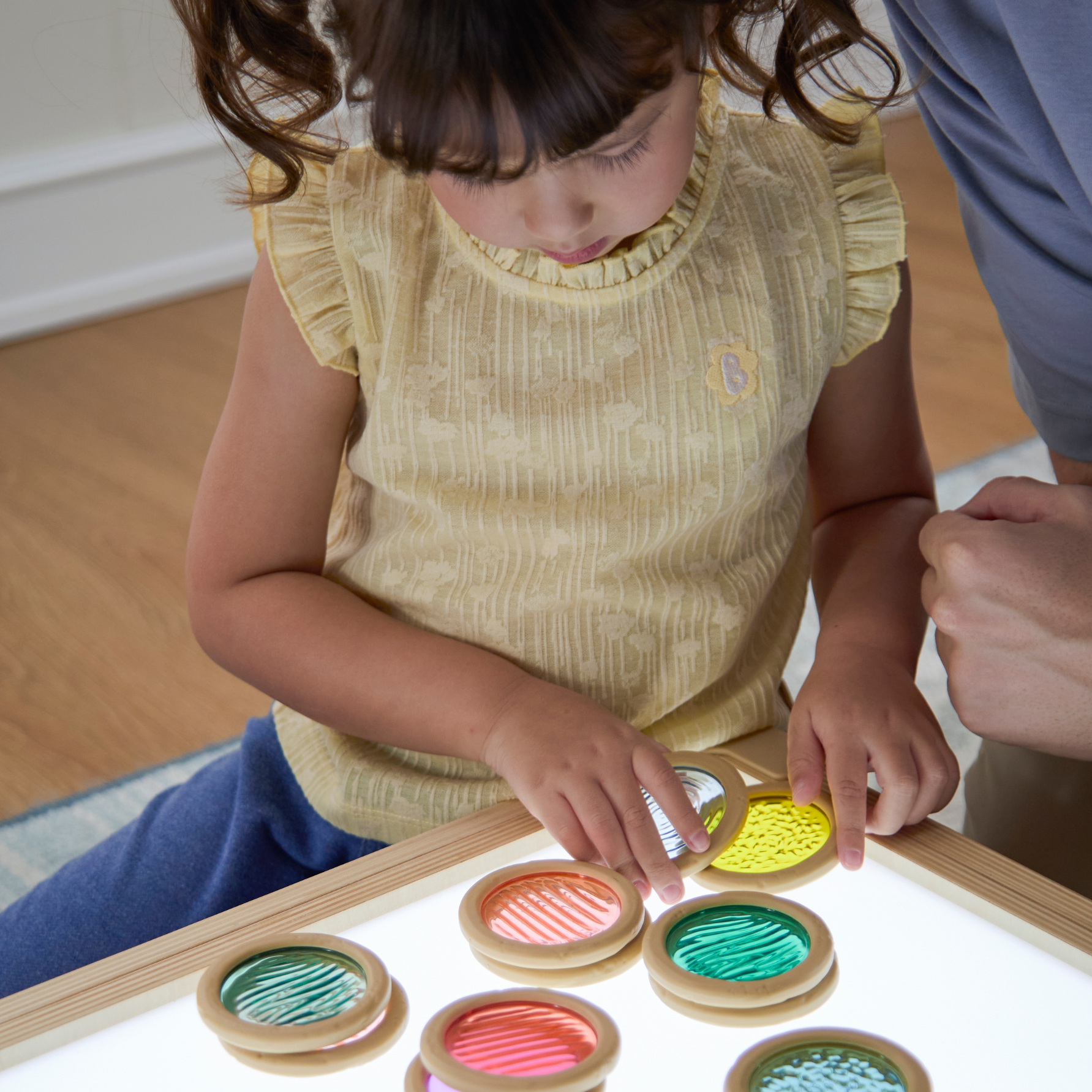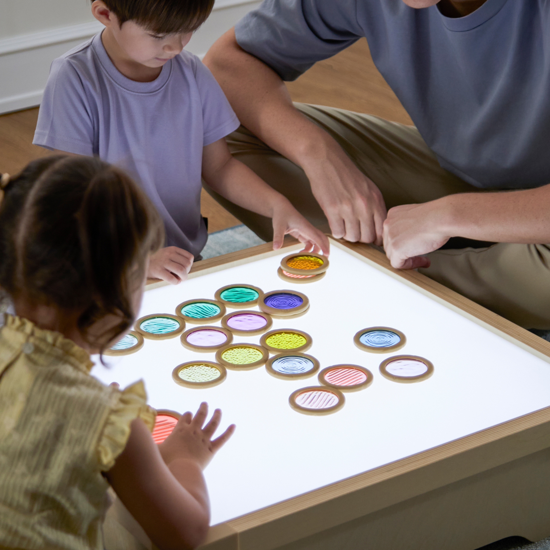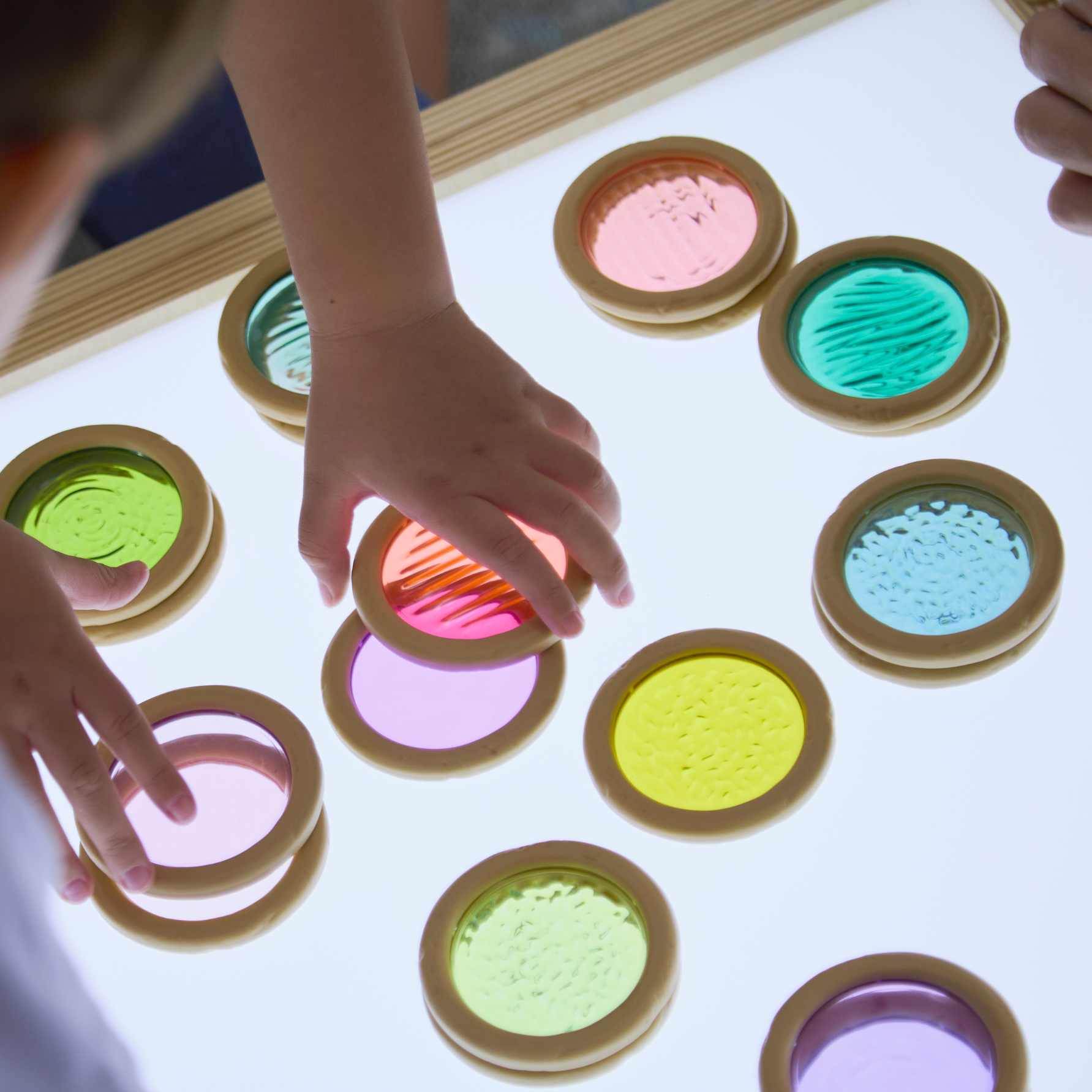 Met de Licht‑ en Kleur Textuurschijven ontdekken kinderen op een speelse manier de magie van licht, kleur en textuur. De set bestaat uit transparante, kleurrijke schijven die uitnodigen tot experimenteren met stapelen, combineren en kijken door het licht. De textuurschijven zijn gemaakt van stevig, kindvriendelijk materiaal dat geschikt is voor intensief gebruik. Super leuk te combineren met de lichttafels en lichtpanelen.
