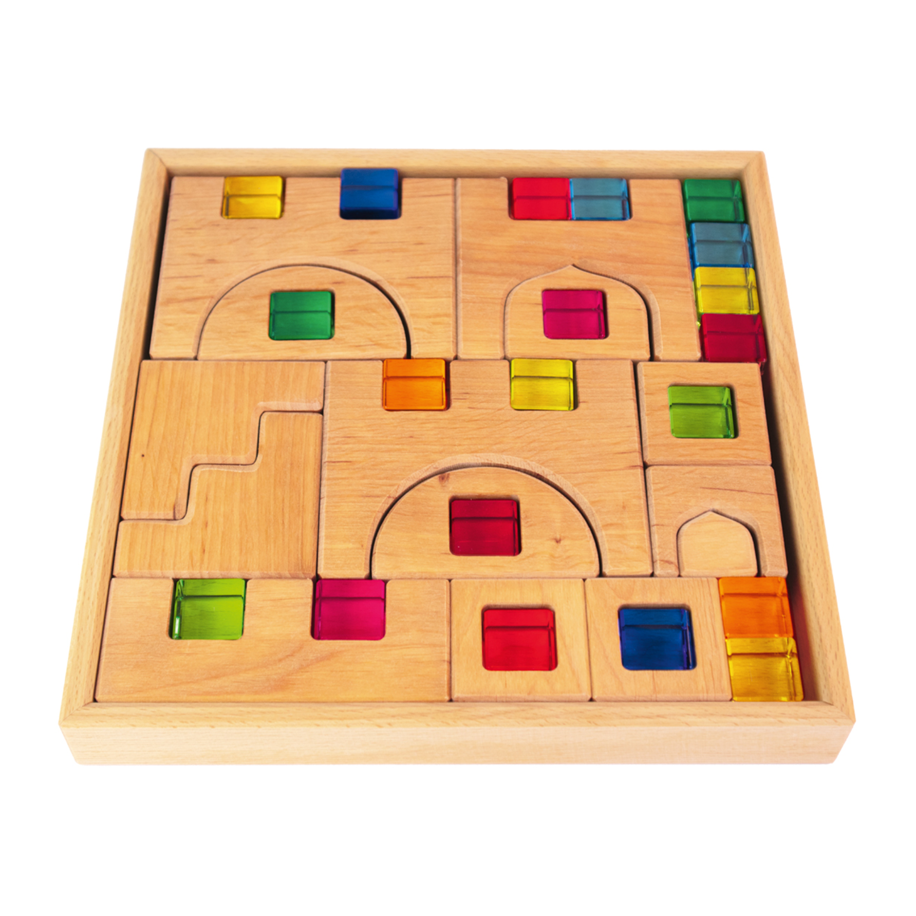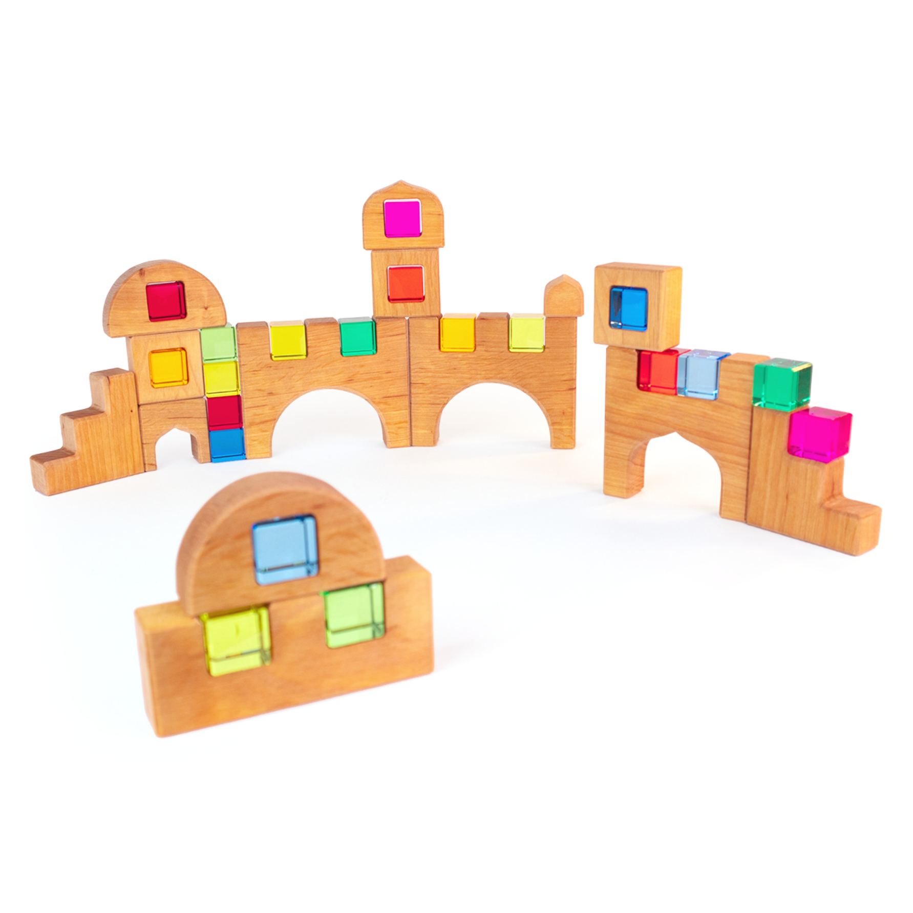 Een prachtige bouw set van Bauspiel. In deze set zitten 14 houten blokken en 20 lucent cubes. Bouw het kasteel voor een raam en laat het kasteel tot leven komen met de zonnestralen op de transparante blokjes.