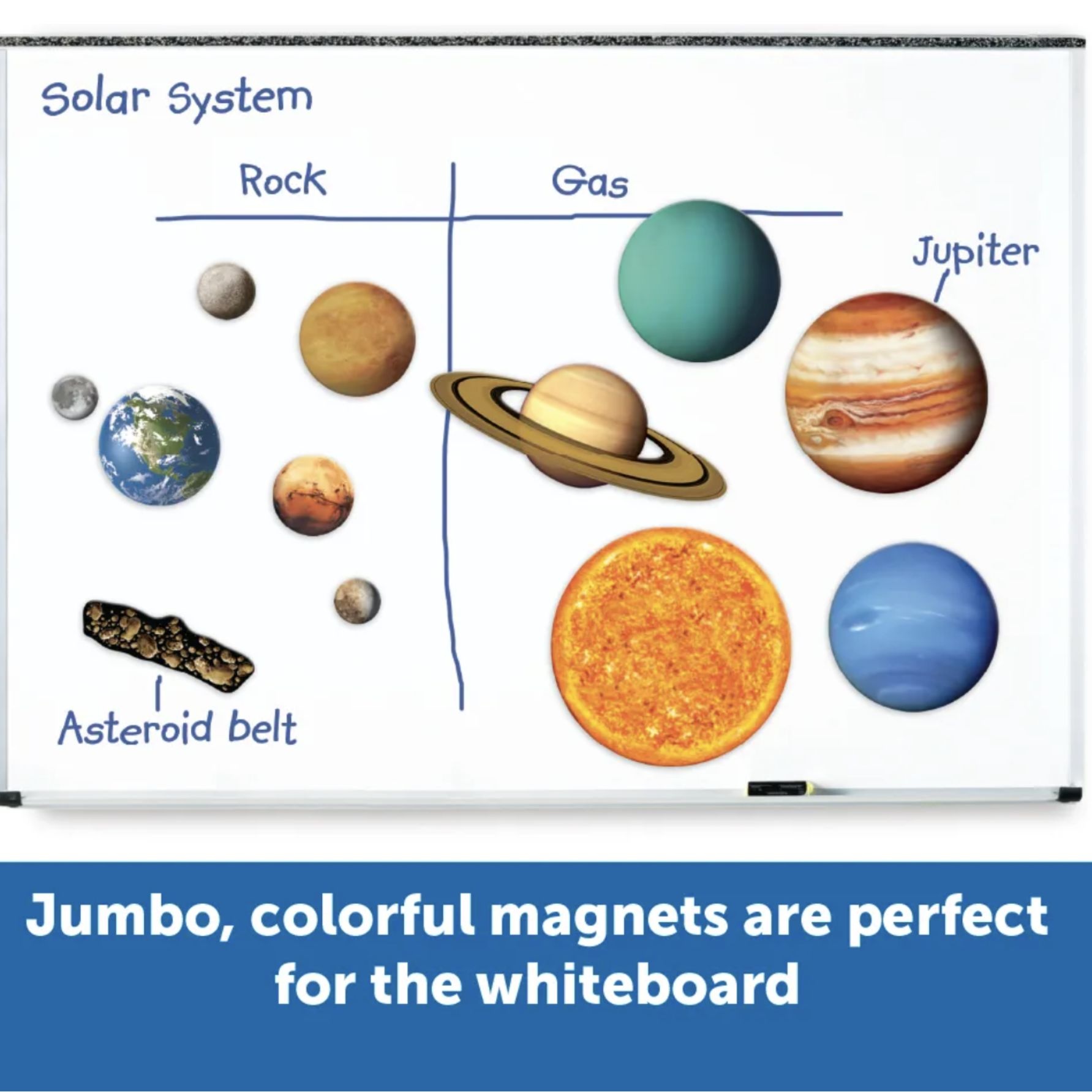 Stimuleer gesprekken over het heelal met deze set realistisch gedetailleerde jumbo-magneten. Gebruik de set om de nieuwsgierigheid naar het zonnestelsel aan te wakkeren.
