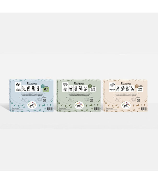 Zes stevige, handgeschilderde kijkkaarten met zwart-wit contrast. Vanaf ongeveer één maand beginnen baby's interesse te tonen in oppervlakken met sterke contrasten, waardoor deze kaarten extra goed zichtbaar zijn. Naarmate kinderen ouder worden, kunnen ze de dieren benoemen. Op de achterkant van elke kaart staat het dier afgebeeld in verschillende aantallen. Zodat kinderen wanneer ze ouder worden er ook een tel spel van kunnen maken.