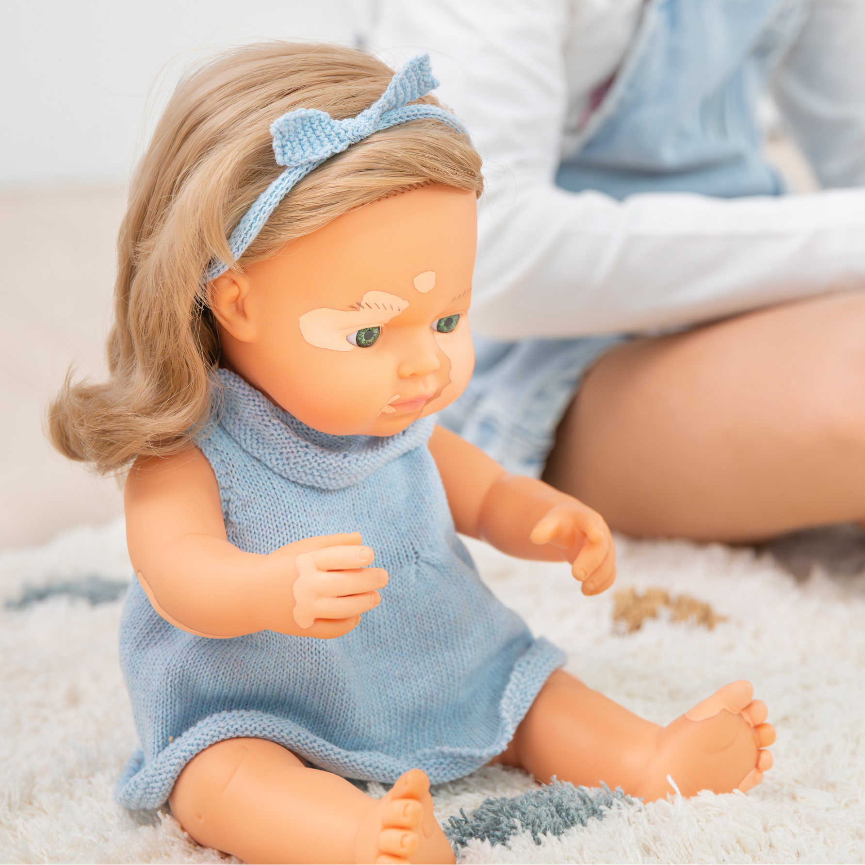 De Europese meisjespop met Vitiligo van Miniland is een realistische speelpop die bijdraagt aan spelend ontwikkelen en inclusiviteit binnen de kinderopvang. Deze zorgvuldig vormgegeven pop stimuleert kinderen om op een natuurlijke manier kennis te maken met diversiteit en verschillen tussen mensen. Door het realistische uiterlijk en de vriendelijke uitstraling sluit de pop goed aan bij de belevingswereld van jonge kinderen.