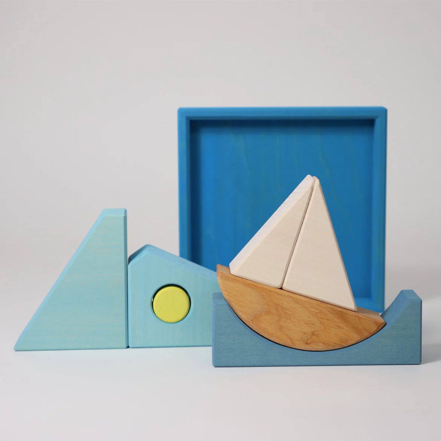 Blauw als ... de zee. Glijdend door golven vaart de zeilboot over de blauwe zee. Buiten het kader worden de geometrische bouwstenen fantasierijke dierfiguren. Bouwset Blauw maakt deel uit van de kleurenbouw sets. Met hun grote stukken zijn ze gemaakt voor de kleinste handjes. De kleurvariaties bieden een eerste kennismaking met de primaire en secundaire kleuren en hun verschillende effecten.