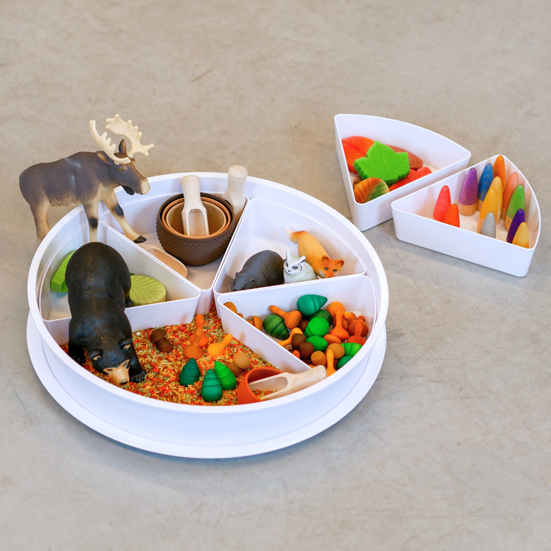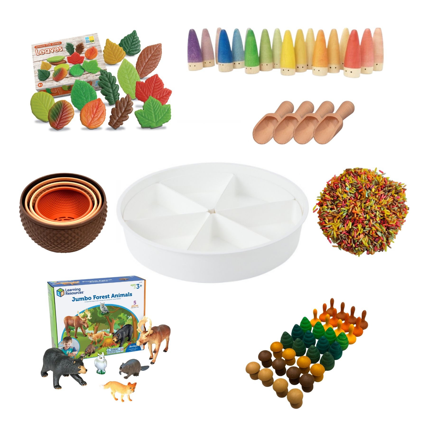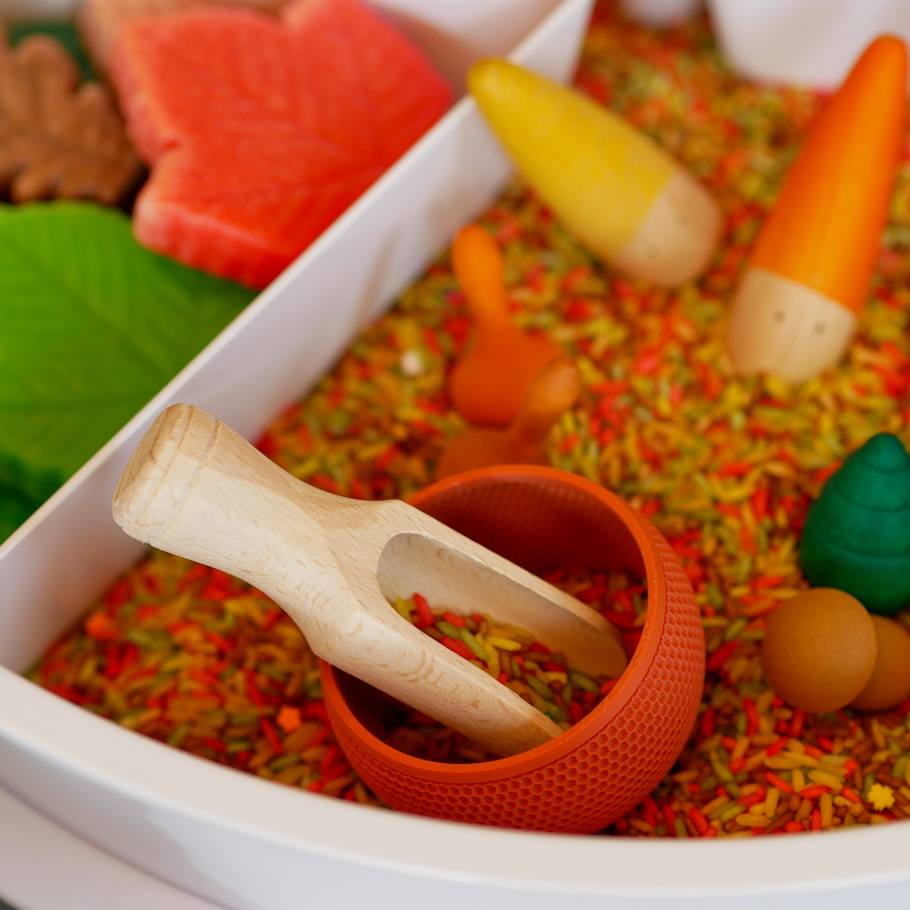 De Play Tray vormt het speelveld, gevuld met de autumn speelrijst van Grennn, waar kinderen met schepjes, kommen en handen kunnen graven, vullen en legen. Met de sensorische blaadjes van Yellow Door en de bosdieren van Learning Resources wordt het spel verrijkt met natuurlijke elementen en rollenspel.