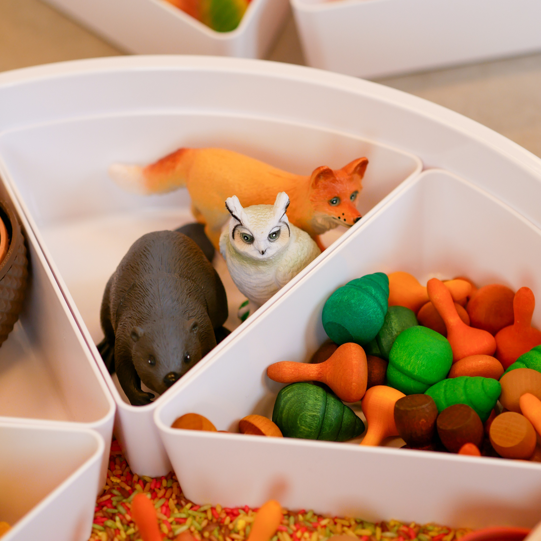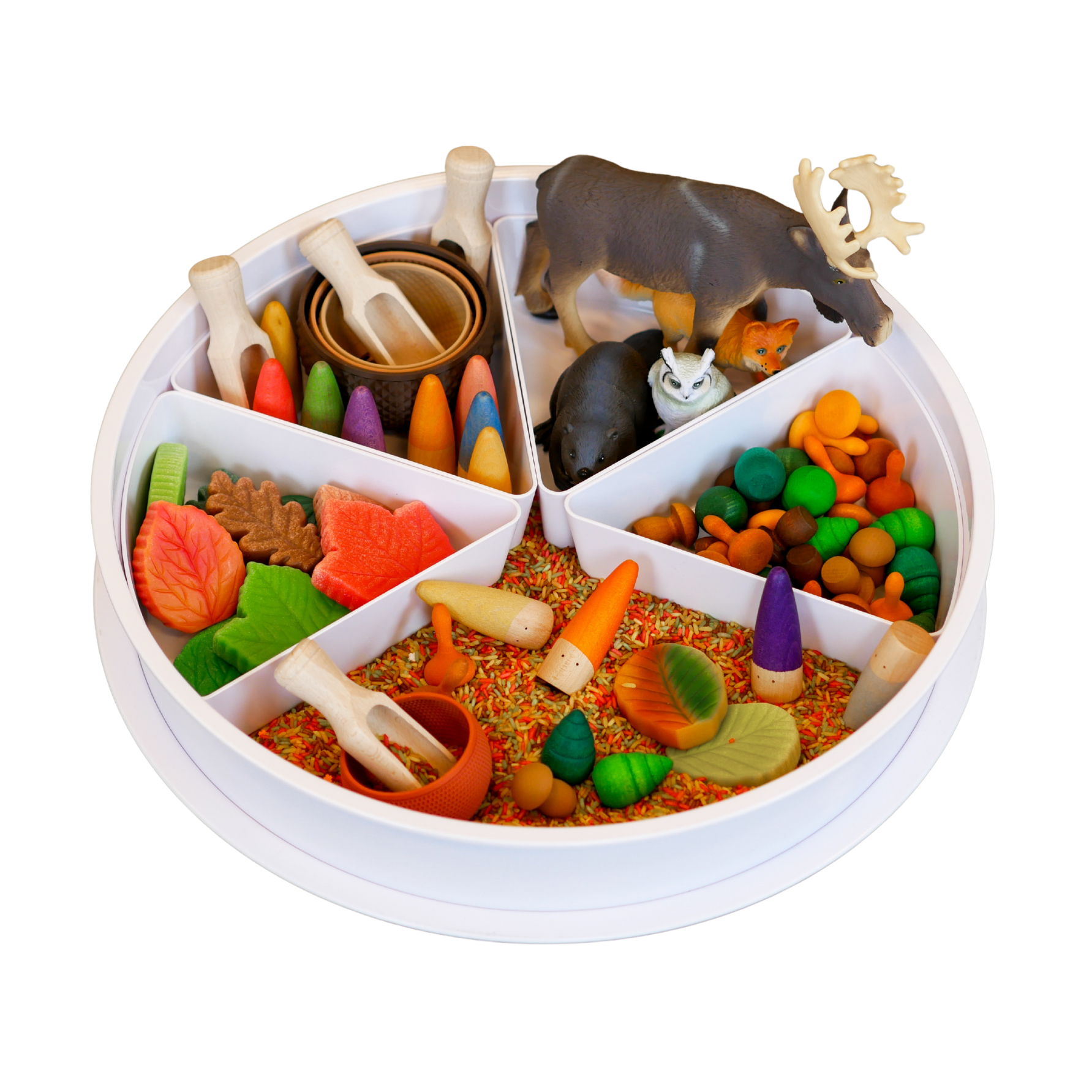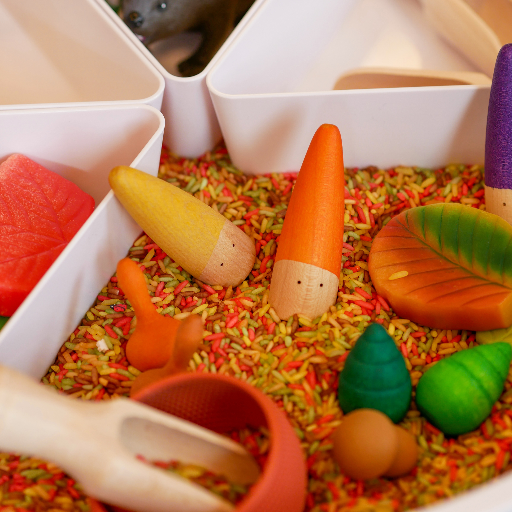 De Play Tray vormt het speelveld, gevuld met de autumn speelrijst van Grennn, waar kinderen met schepjes, kommen en handen kunnen graven, vullen en legen. Met de sensorische blaadjes van Yellow Door en de bosdieren van Learning Resources wordt het spel verrijkt met natuurlijke elementen en rollenspel.
