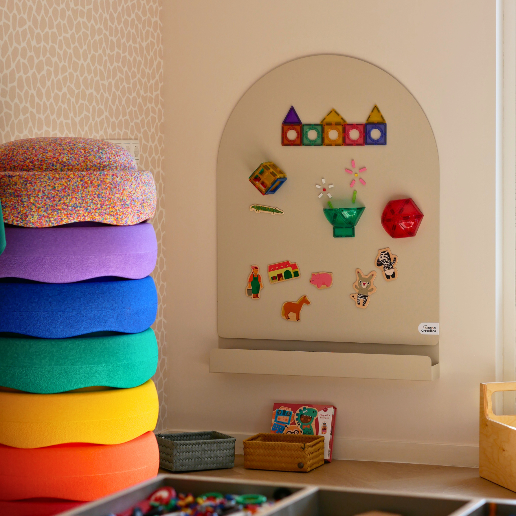 De magnetische muurplaat 'Bow' van Magna Creations is ontworpen met de gedachte dat elk kind een ‘tiny artist’ is. Deze vernieuwende magneetboog voor aan de wand biedt kinderen een uitbreiding in artistieke en magnetische spelmogelijkheden. Vanuit hun eigen fantasie en creativiteit kunnen de kleine artiesten kleurrijke structuren, repeterende patronen, fantasierijke bouwwerken en unieke kunstwerken maken. De magnetische boog heeft een solide afwerking van poedercoating die zorgt voor verbeterde bestendigheid tegen krassen en slijtage bij intensief dagelijks regelmatig gebruik. Met keuze uit vijf trendy kleuren past de magneetboog in elk interieur.