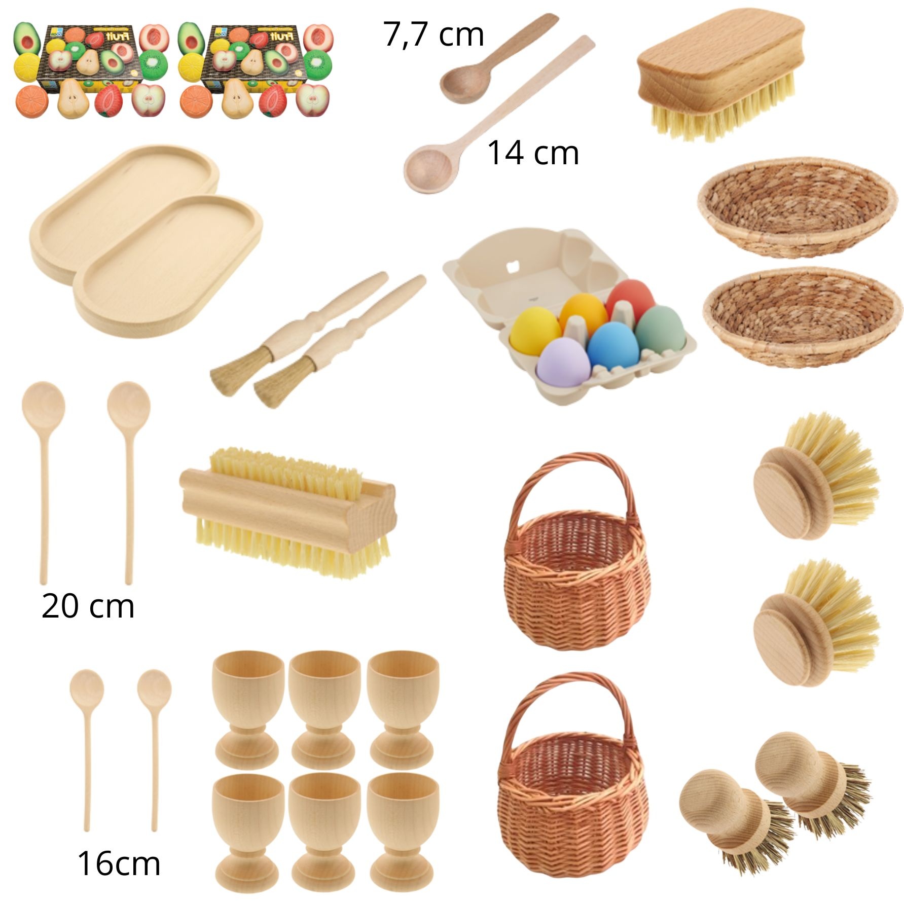De combinatie van houten materialen, mandjes, lepels en verzorgingsobjecten zorgt ervoor dat kinderen actief bezig zijn. Ze scheppen, verplaatsen, ordenen en verzorgen. Een bakje wordt gevuld, een lepel wordt gebruikt, een object wordt schoongemaakt of ergens neergelegd.